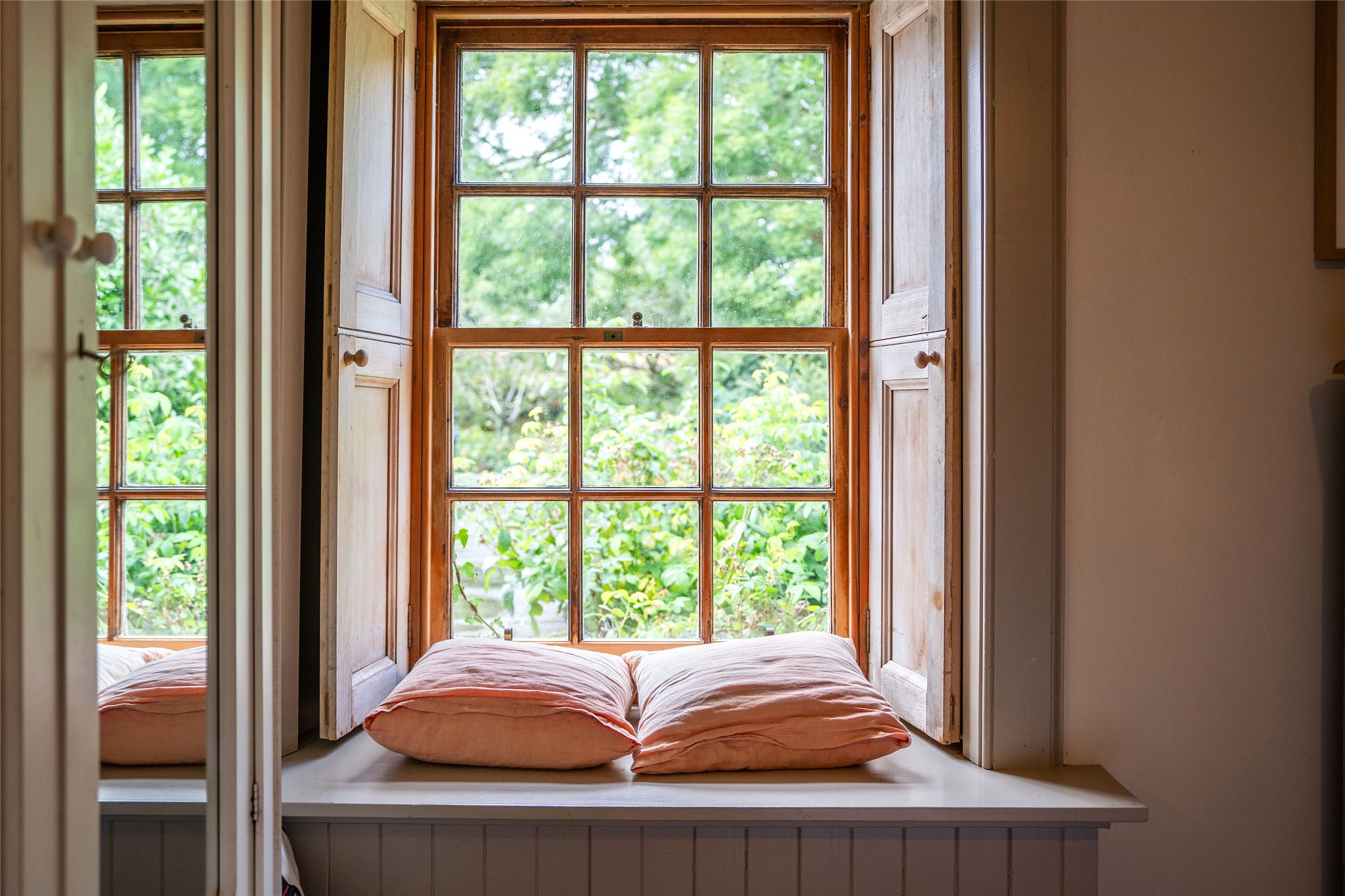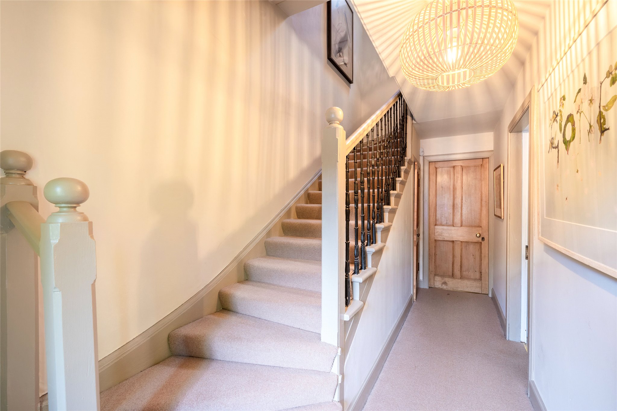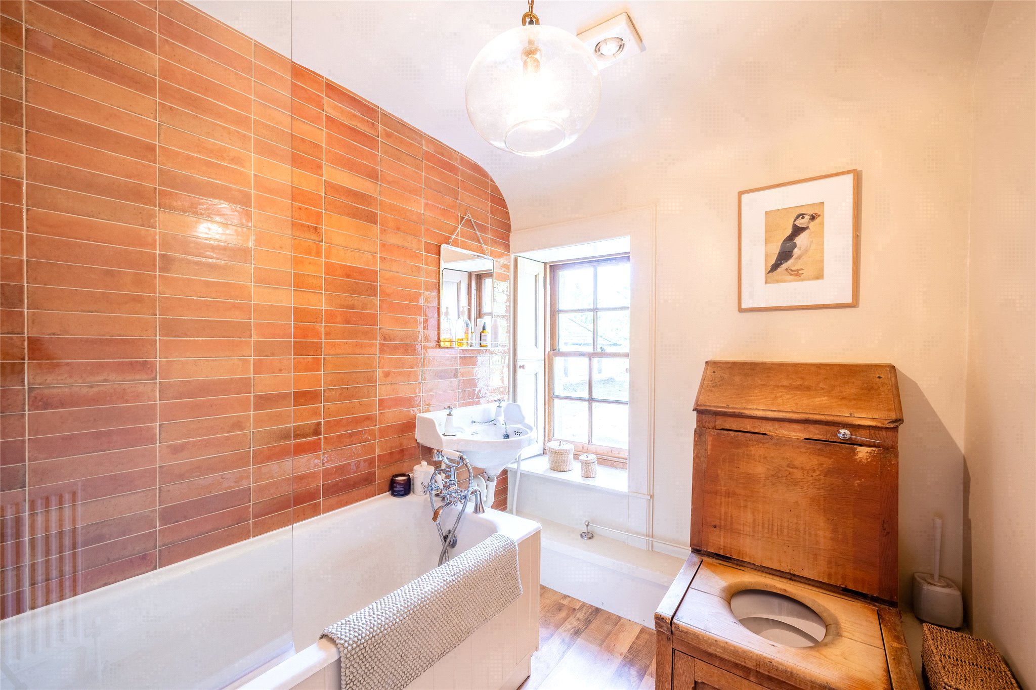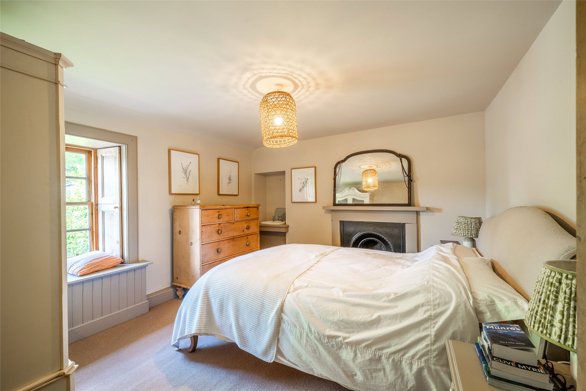 Dating back to 1789, this tastefully renovated former schoolhouse combines abundant natural light, elegant interior design, period details, and generous proportions to create an exceptional four-bedroom family home in a truly outstanding setting. The home welcomes you through an entrance vestibule with a guest WC, French doors then open into a spacious hallway. To your right, you'll find a bright and expansive living and reception area, currently utilised as a studio. With light streaming in from four multi-panelled sash windows and the hallway, this space feels both airy and inviting. Opposite, lies a modern and spacious kitchen, featuring oak-effect worktops, a tiled splashback, and under-cabinet lighting that highlights soft grey and natural-toned cabinetry. The kitchen is equipped with integrated appliances, including an enviable AGA, an eye-level grill and oven, and a central island offering additional workspace and seating. South-facing with doors leading to the rear garden, this kitchen serves as the heart of the home. Adjacent is a charming sitting room, decorated in soothing green tones. Featuring wooden flooring, working shutters, and a log-burning stove set within an oak fireplace, this space radiates an appealing rustic ambience. From here, you have access to a versatile utility room with rear access, as well as a well-appointed wet room finished in a traditional monochrome style, complete with dual rainfall showers, a WC, and a washbasin. Returning to the entrance hallway, you arrive at a spectacular living room nestled beneath and providing stair access to a glass-fronted mezzanine floor, creating a wonderful sense of openness. This light-filled space, illuminated by dual-aspect sash and case windows, boasts handsome original wooden flooring, wood panelling, and a cosy log-burning stove. Despite its generous size, the room exudes warmth, making it perfect for daily living and hosting gatherings with friends and family. Completing the ground floor layout, a second internal carpeted hallway, featuring a four-panel oak door, leads to a delightful double bedroom with a calming colour palette. From this hallway, you ascend a carpeted staircase adorned with an iron balustrade and oak banister, leading to three light and airy bedrooms (two double bedrooms and one single bedroom). Two showcase original fireplaces, while one includes a window seat. All three bedrooms share access to a family bathroom that combines modernity with period style.