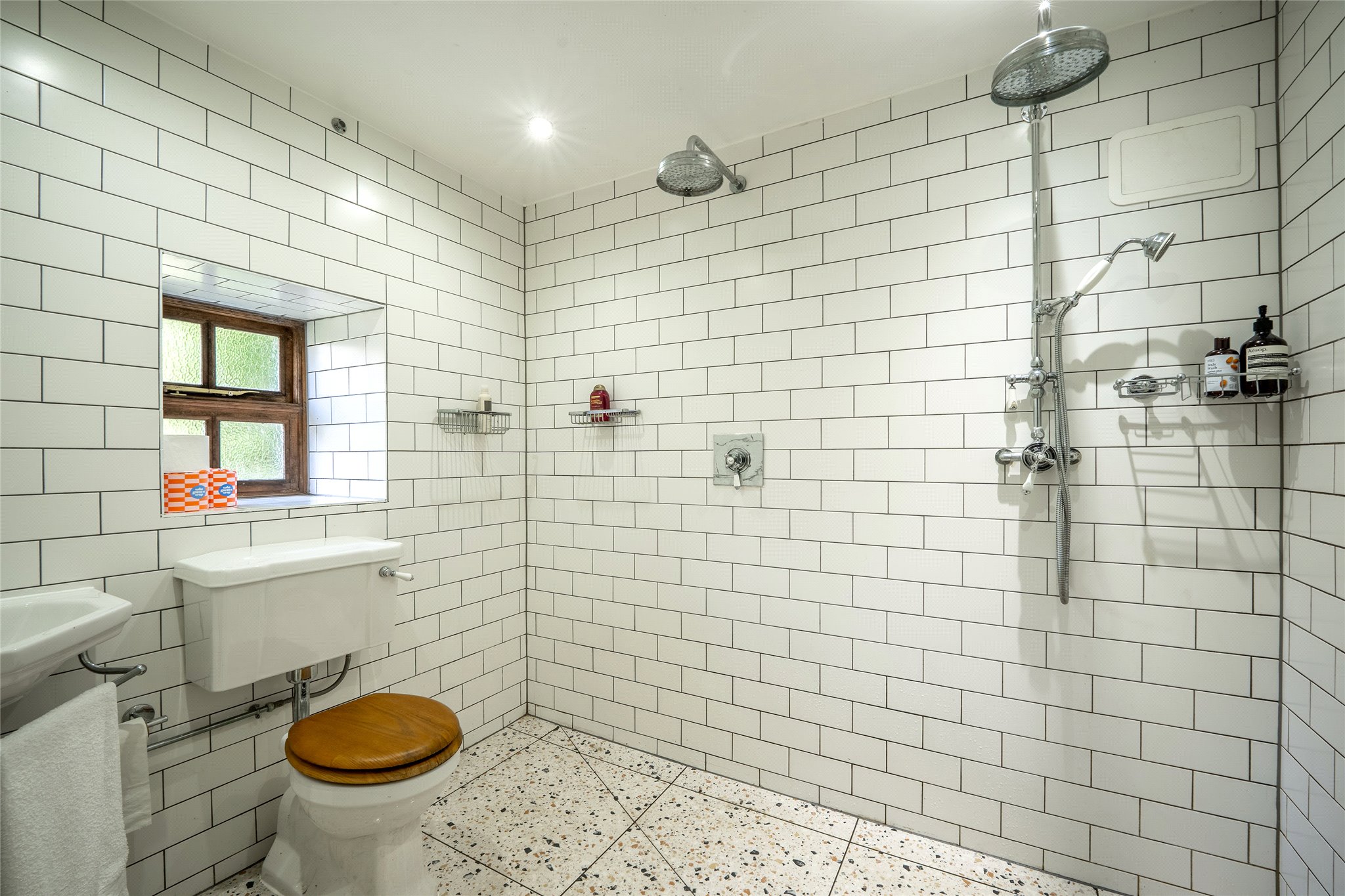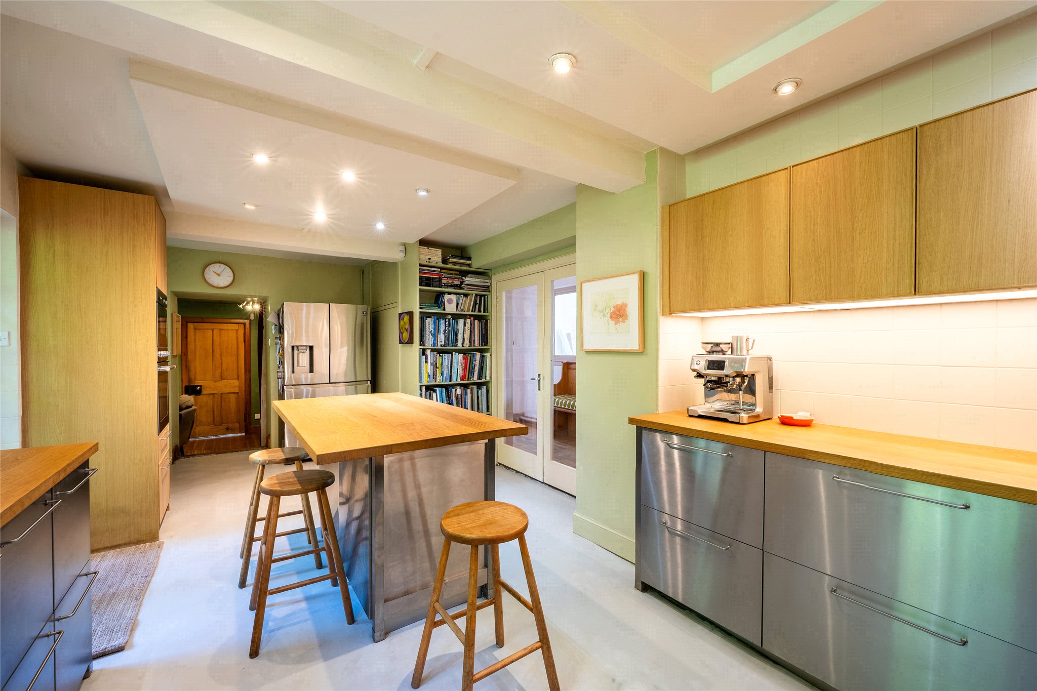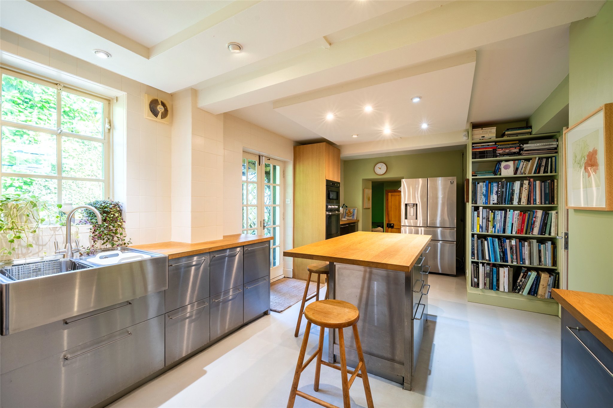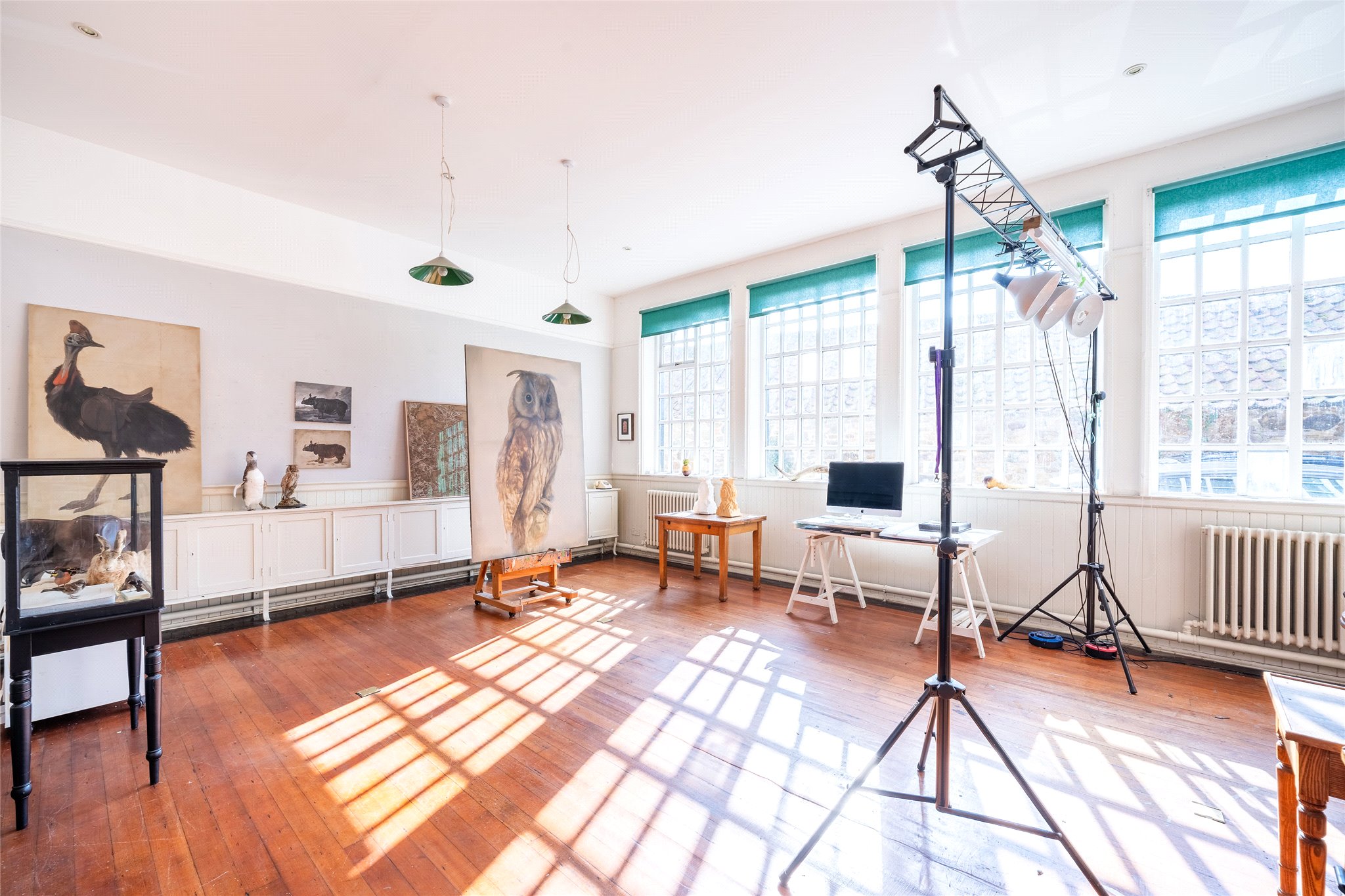 Dating back to 1789, this tastefully renovated former schoolhouse combines abundant natural light, elegant interior design, period details, and generous proportions to create an exceptional four-bedroom family home in a truly outstanding setting. The home welcomes you through an entrance vestibule with a guest WC, French doors then open into a spacious hallway. To your right, you'll find a bright and expansive living and reception area, currently utilised as a studio. With light streaming in from four multi-panelled sash windows and the hallway, this space feels both airy and inviting. Opposite, lies a modern and spacious kitchen, featuring oak-effect worktops, a tiled splashback, and under-cabinet lighting that highlights soft grey and natural-toned cabinetry. The kitchen is equipped with integrated appliances, including an enviable AGA, an eye-level grill and oven, and a central island offering additional workspace and seating. South-facing with doors leading to the rear garden, this kitchen serves as the heart of the home. Adjacent is a charming sitting room, decorated in soothing green tones. Featuring wooden flooring, working shutters, and a log-burning stove set within an oak fireplace, this space radiates an appealing rustic ambience. From here, you have access to a versatile utility room with rear access, as well as a well-appointed wet room finished in a traditional monochrome style, complete with dual rainfall showers, a WC, and a washbasin. Returning to the entrance hallway, you arrive at a spectacular living room nestled beneath and providing stair access to a glass-fronted mezzanine floor, creating a wonderful sense of openness. This light-filled space, illuminated by dual-aspect sash and case windows, boasts handsome original wooden flooring, wood panelling, and a cosy log-burning stove. Despite its generous size, the room exudes warmth, making it perfect for daily living and hosting gatherings with friends and family. Completing the ground floor layout, a second internal carpeted hallway, featuring a four-panel oak door, leads to a delightful double bedroom with a calming colour palette. From this hallway, you ascend a carpeted staircase adorned with an iron balustrade and oak banister, leading to three light and airy bedrooms (two double bedrooms and one single bedroom). Two showcase original fireplaces, while one includes a window seat. All three bedrooms share access to a family bathroom that combines modernity with period style.