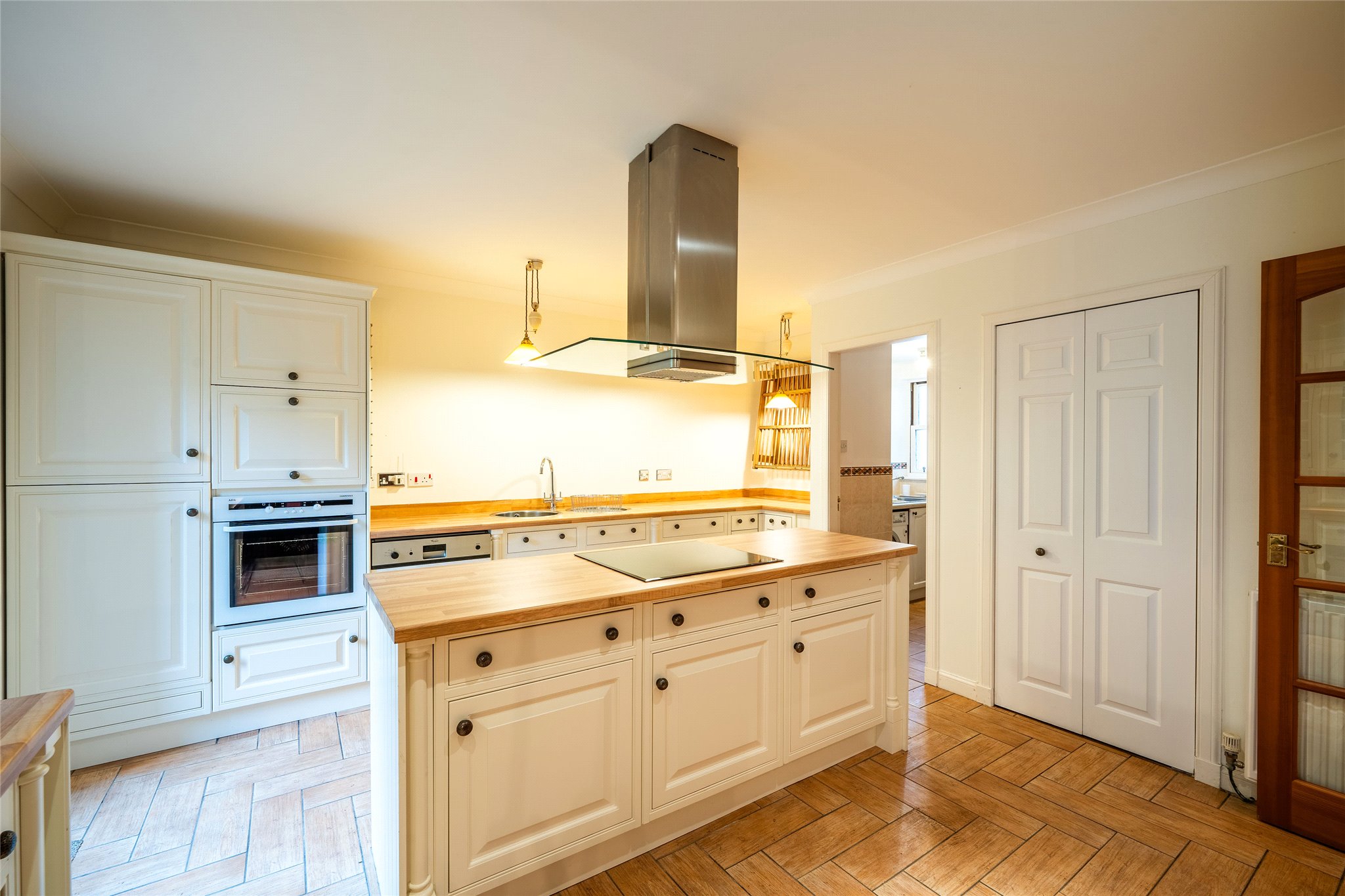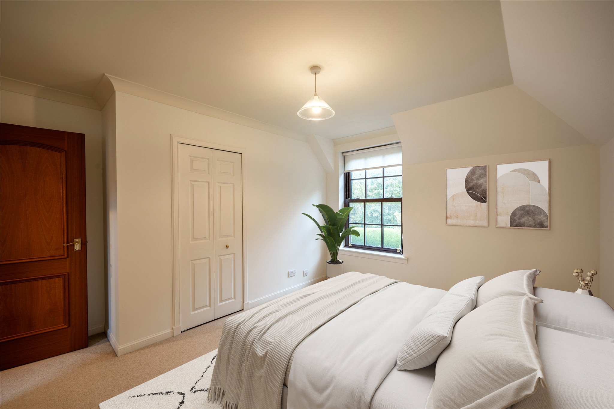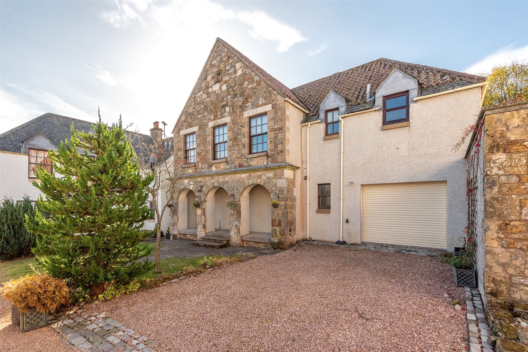 The property is built on the site of a restored steading, set in the hills above St Andrews within an exclusive courtyard development. The Doocot offers buyers a rare opportunity to acquire a peaceful and well-presented detached home in a picturesque countryside setting. The property makes a superb first impression with its distinctive facade of stone arches leading to the front door. Bright and inviting, the ground-floor hallway leads through elegant double doors into a spacious dining area, perfect for both everyday use and entertaining. This space seamlessly connects to a south-west-facing sunroom, offering panoramic views of the rear garden and direct access, creating an enviable indoor-outdoor connection. Flowing naturally from the dining area, the farmhouse-style kitchen features bespoke cream cabinetry, butcher block worktops, and high-spec integrated appliances, including an integrated fridge freezer, a microwave, a double oven, ceiling- extractor hood, induction hob, and a dishwasher. A central kitchen island adds functionality and aesthetic appeal to the space whilst a useful utility provides additional storage and a washing machine. Across the hallway, a light-filled double bedroom offers a spectacular view of the private garden with a south-east orientation. It also features a large cupboard and a stylish bathroom equipped with a corner bath, vanity washbasin, and WC. Ascending to the generous first-floor landing, a spacious living room awaits. Enjoying a dual-aspect across the surrounding countryside its elegant décor includes plush carpeting, a ceiling rose, and a living flame fireplace nestled in a striking mantle. On this floor are three double bedrooms each with a calm colour palette and carpeting, all feature built-in storage and one boasts a stylish en-suite shower room. Completing the layout is a classically styled bathroom with a bath, washbasin built into vanity, and a hidden cistern WC.