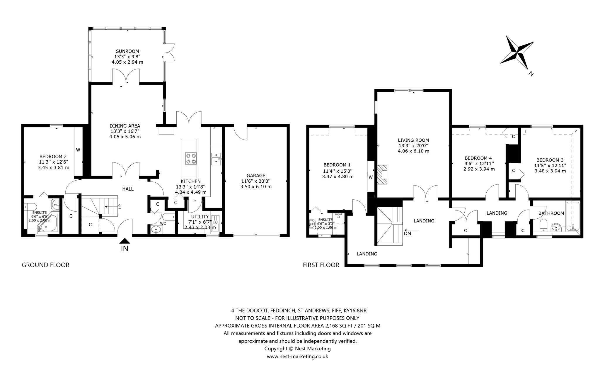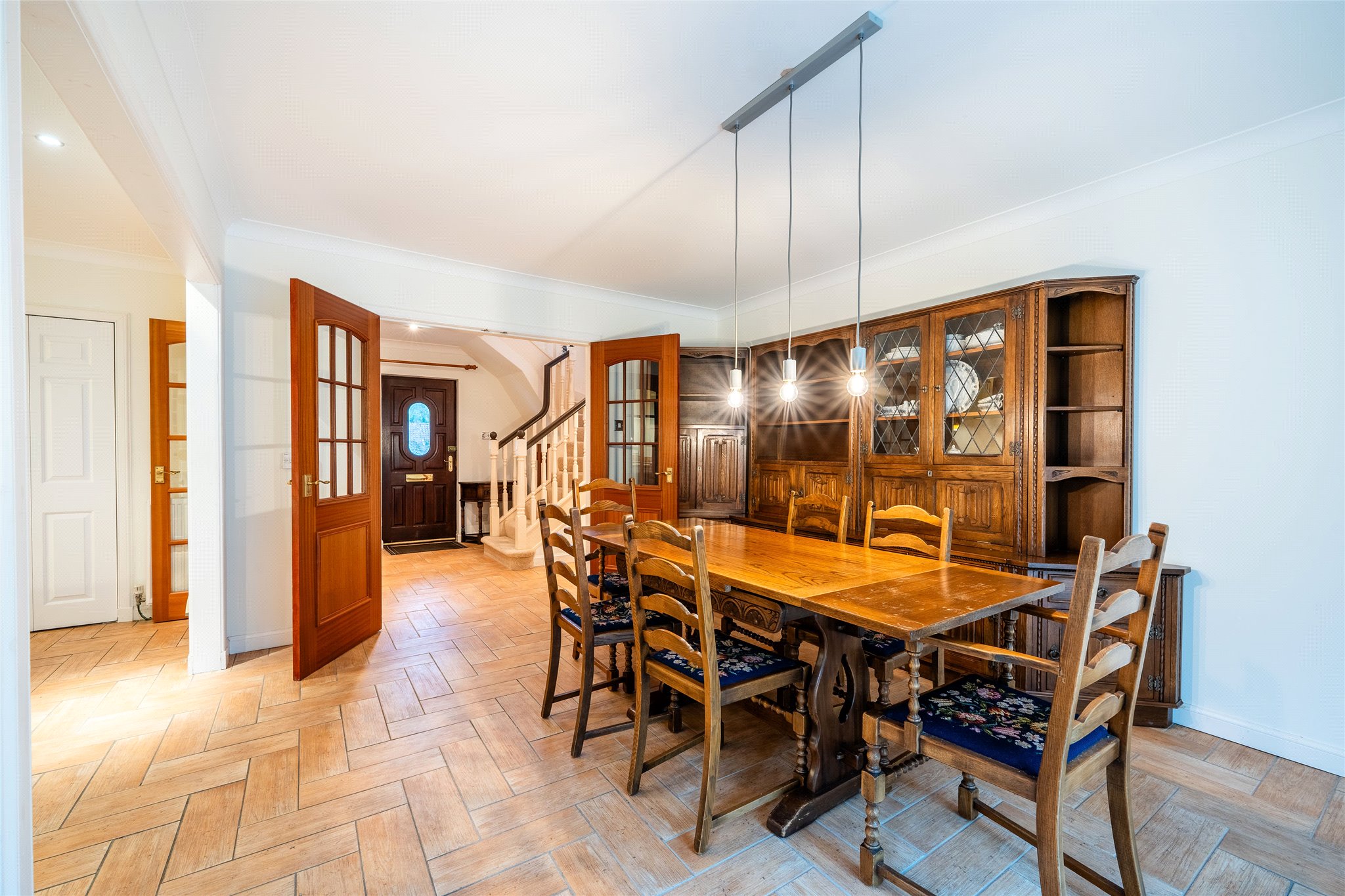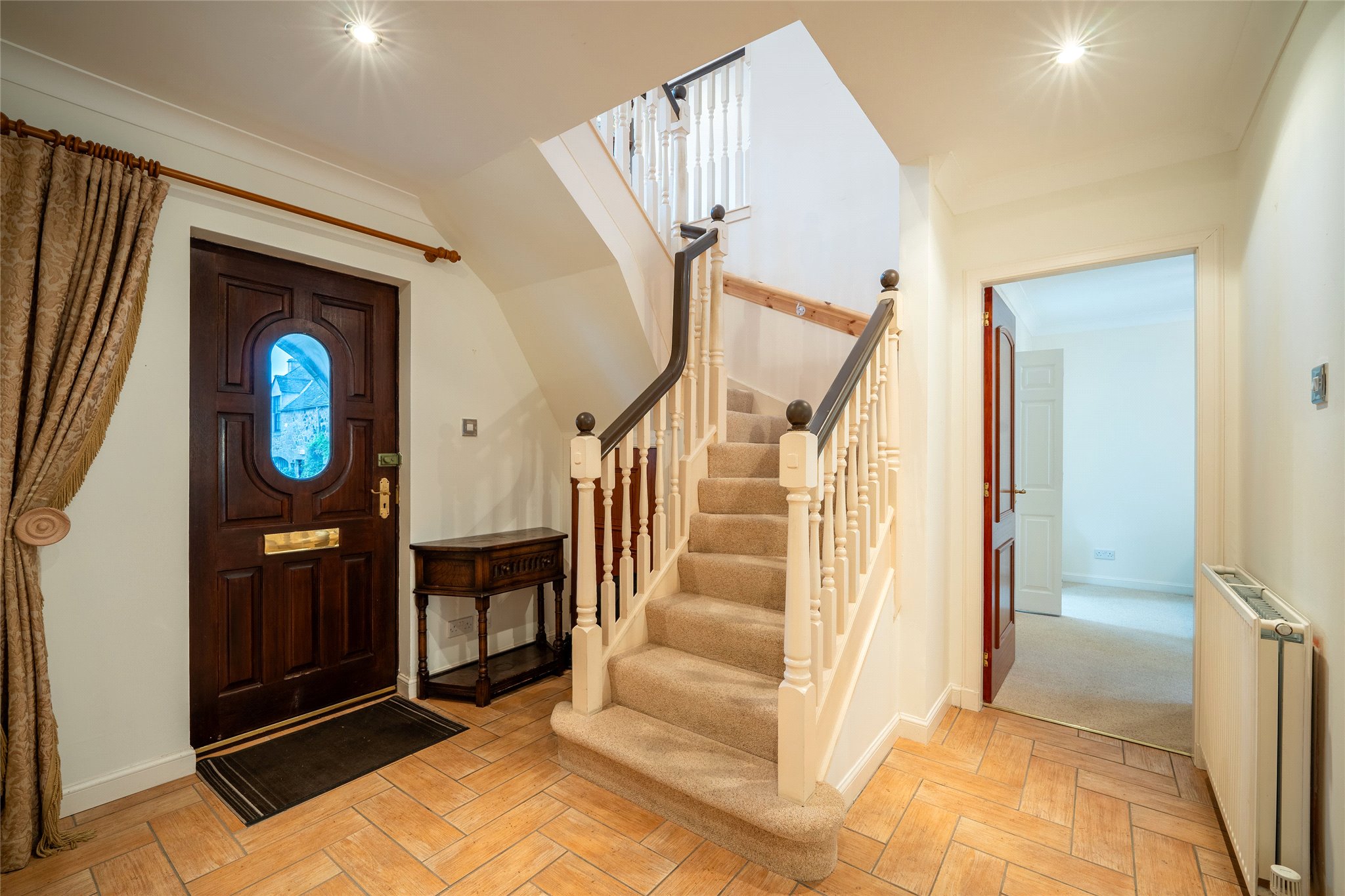 The property is built on the site of a restored steading, set in the hills above St Andrews within an exclusive courtyard development. The Doocot offers buyers a rare opportunity to acquire a peaceful and well-presented detached home in a picturesque countryside setting. The property makes a superb first impression with its distinctive facade of stone arches leading to the front door. Bright and inviting, the ground-floor hallway leads through elegant double doors into a spacious dining area, perfect for both everyday use and entertaining. This space seamlessly connects to a south-west-facing sunroom, offering panoramic views of the rear garden and direct access, creating an enviable indoor-outdoor connection. Flowing naturally from the dining area, the farmhouse-style kitchen features bespoke cream cabinetry, butcher block worktops, and high-spec integrated appliances, including an integrated fridge freezer, a microwave, a double oven, ceiling- extractor hood, induction hob, and a dishwasher. A central kitchen island adds functionality and aesthetic appeal to the space whilst a useful utility provides additional storage and a washing machine. Across the hallway, a light-filled double bedroom offers a spectacular view of the private garden with a south-east orientation. It also features a large cupboard and a stylish bathroom equipped with a corner bath, vanity washbasin, and WC. Ascending to the generous first-floor landing, a spacious living room awaits. Enjoying a dual-aspect across the surrounding countryside its elegant décor includes plush carpeting, a ceiling rose, and a living flame fireplace nestled in a striking mantle. On this floor are three double bedrooms each with a calm colour palette and carpeting, all feature built-in storage and one boasts a stylish en-suite shower room. Completing the layout is a classically styled bathroom with a bath, washbasin built into vanity, and a hidden cistern WC.