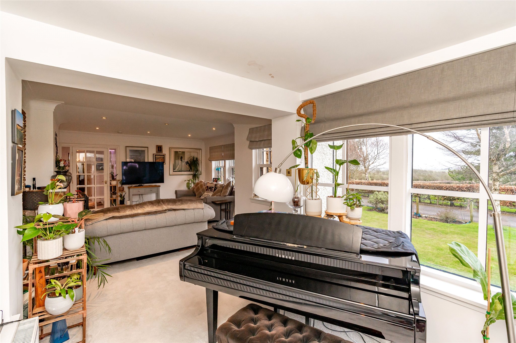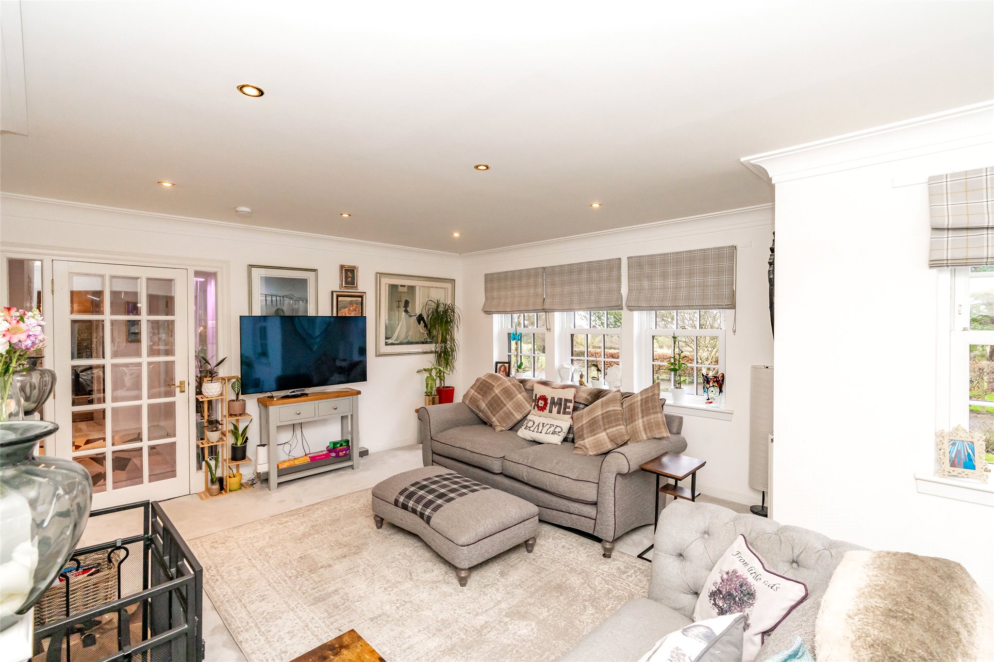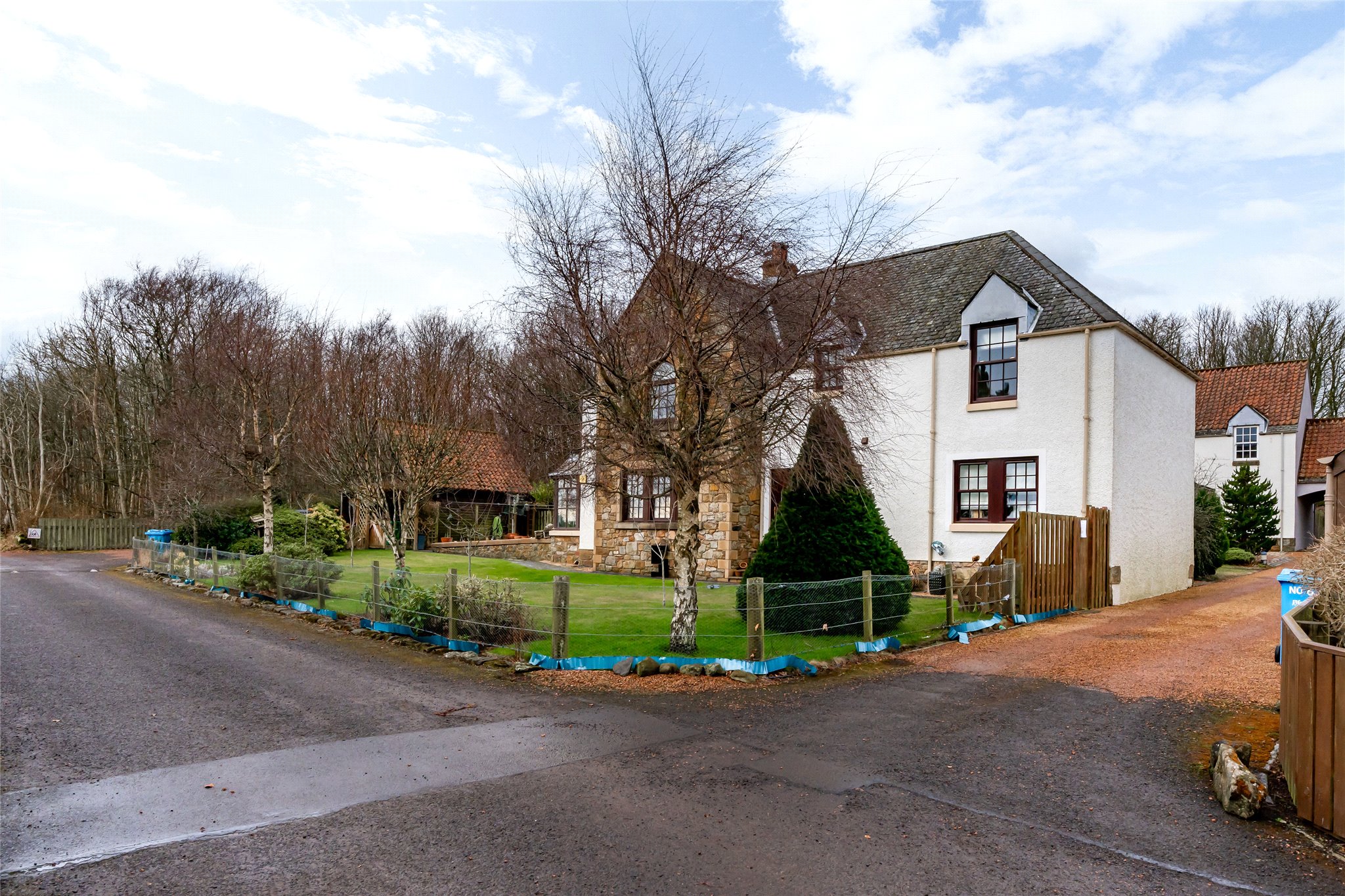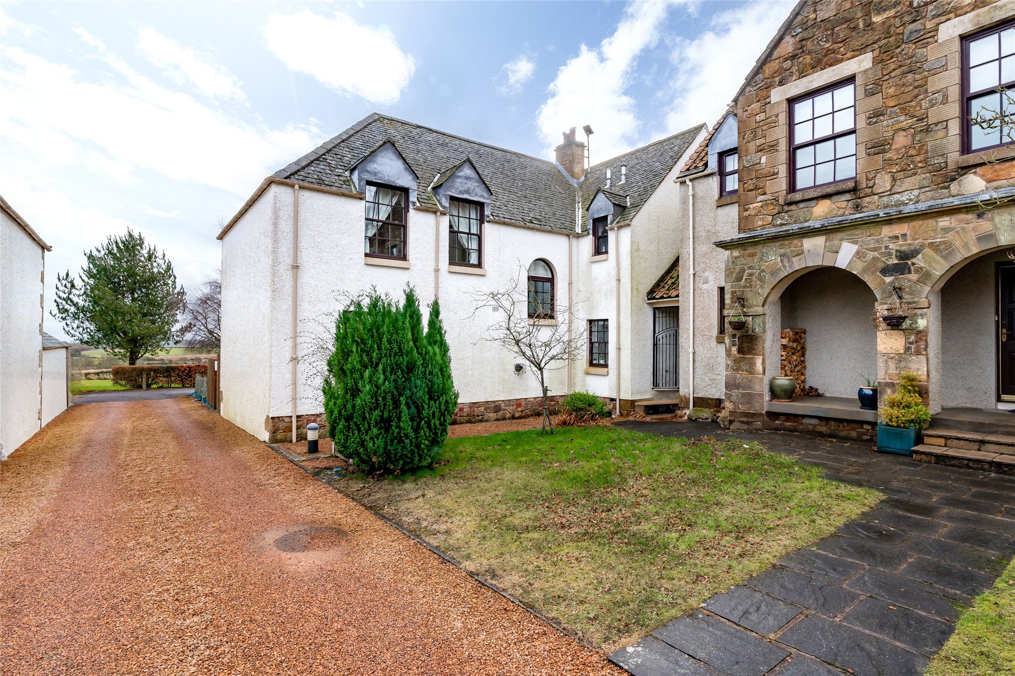 Set within an exclusive courtyard development on the site of a former mansion house in the hills above St Andrews, 5 The Doocot is an impressive, detached family home enjoying a peaceful and scenic countryside setting. Upon entering, a welcoming hallway leads to a bright and elegantly decorated living room, which seamlessly extends into a sunroom. Bathed in natural light, this south-east-facing space opens to the garden through French doors, creating a perfect indoor-outdoor flow. A log-burning stove and a calming palette of greys and whites enhance its warm and inviting ambiance, while the generous layout allows for versatile furniture arrangements. Adjacent to the living room, the bright dining kitchen also provides external access and showcases a charming farmhouse-style design. Rustic green wall and floor units are paired with smooth worktops to create a stylish yet functional space. Integrated appliances include an extractor hood, eye-level oven, grill, and hob, with ample room for freestanding appliances. A separate utility room offers additional storage. Completing the ground floor is a versatile dining room/bedroom and office, along with a convenient shower room. Upstairs, four bright and spacious double bedrooms all benefit from built-in wardrobes with the principal enhanced by an en-suite shower room. The additional bedrooms share a stylish family bathroom, which features a bath, a separate shower enclosure, a WC, and a washbasin built into vanity.