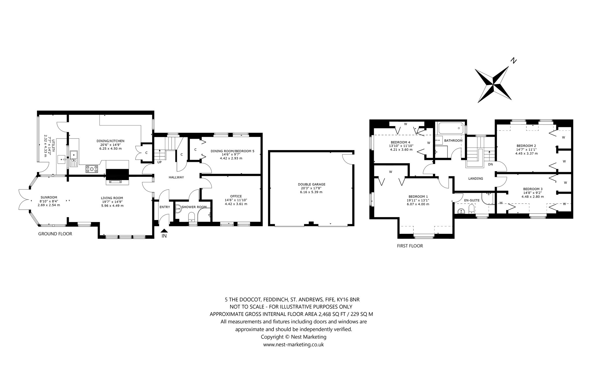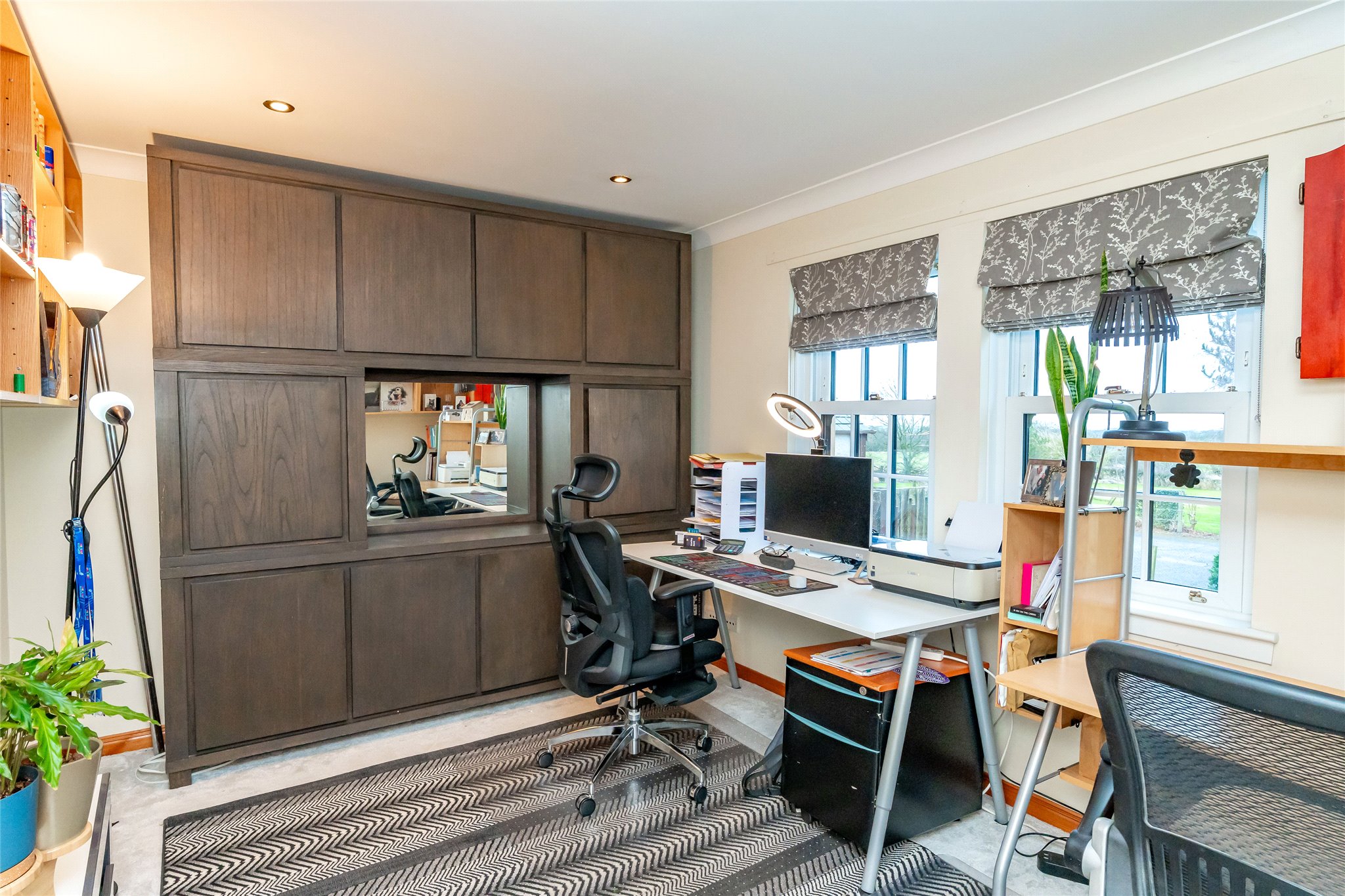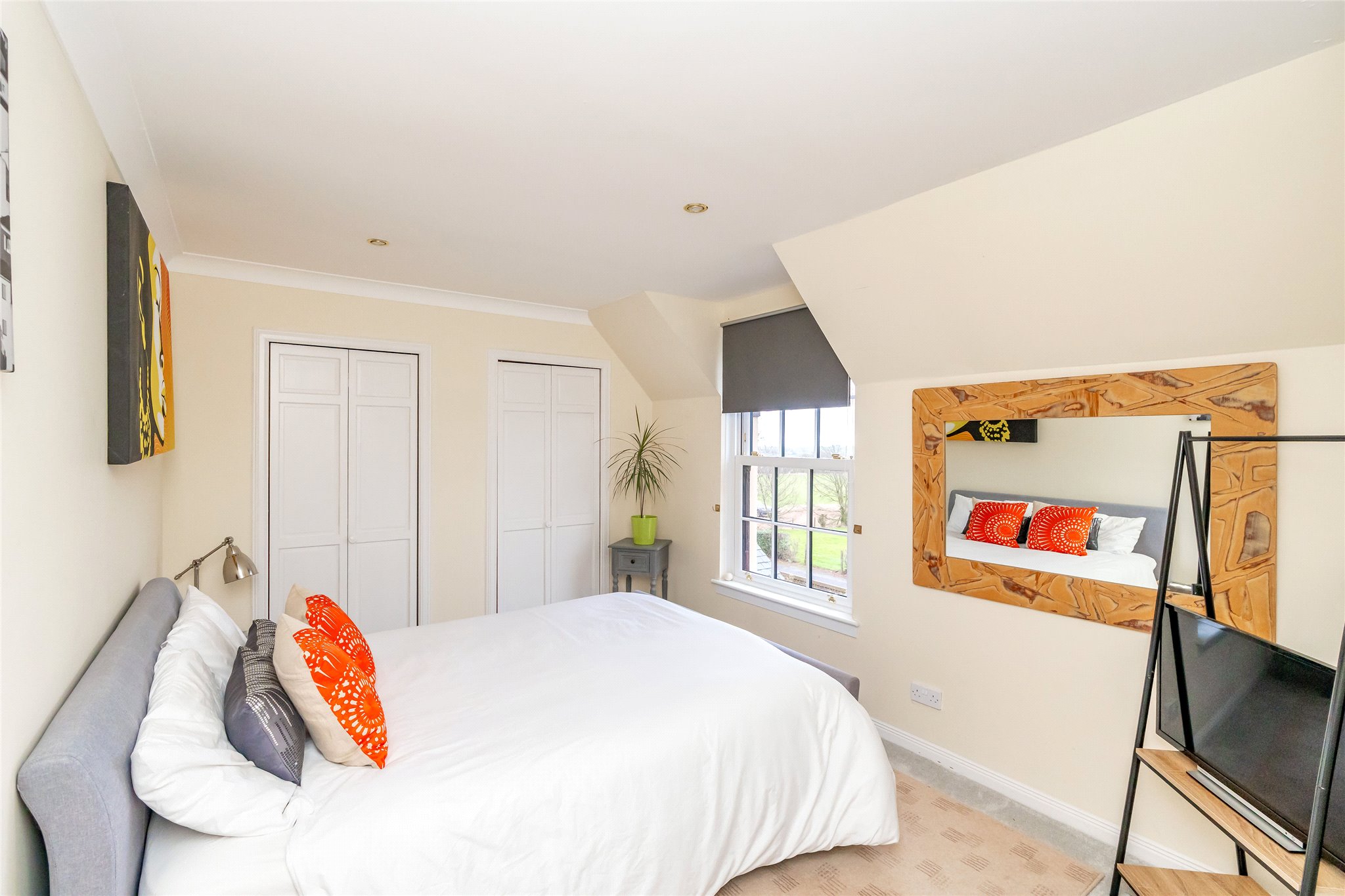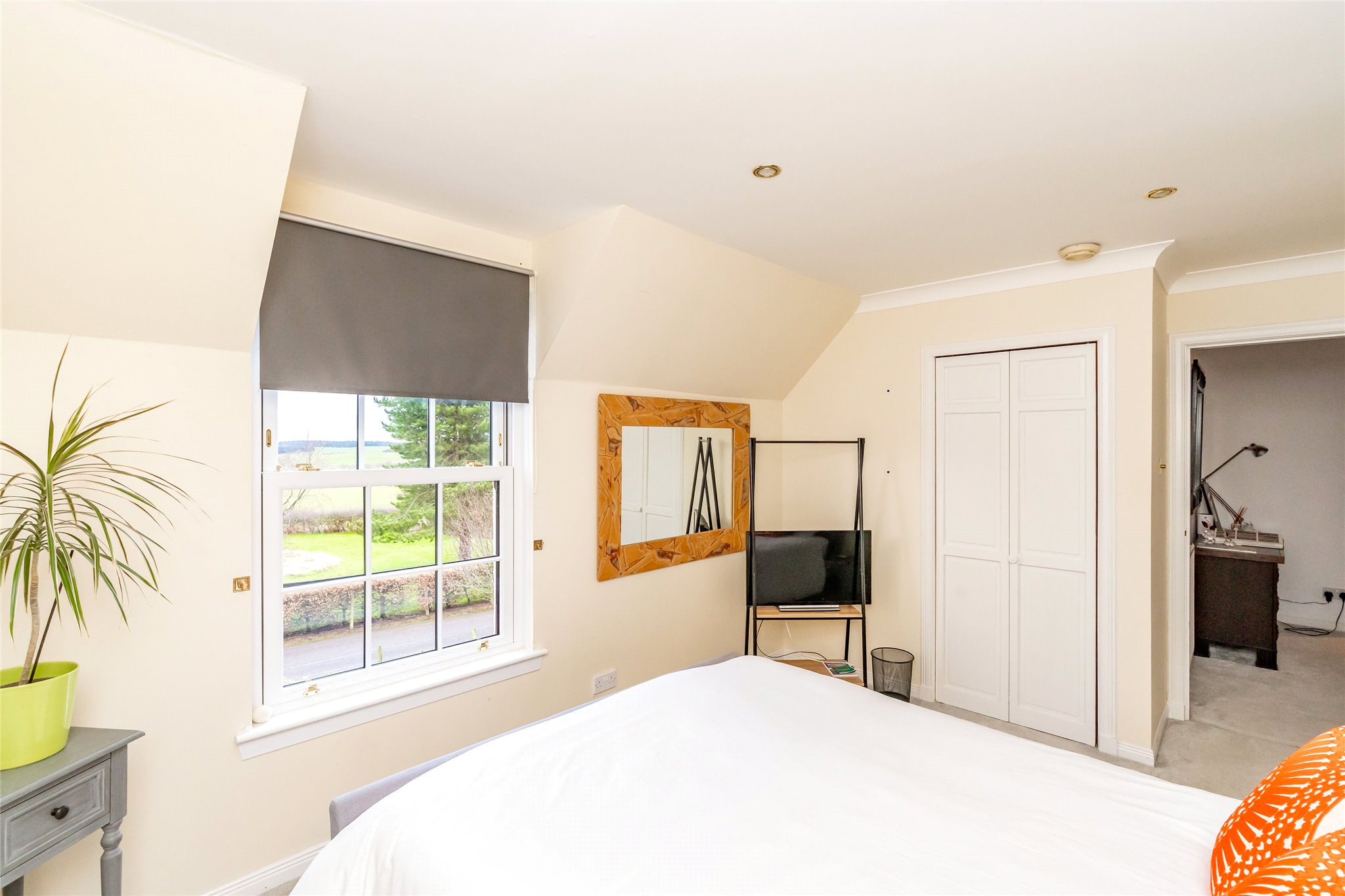 Set within an exclusive courtyard development on the site of a former mansion house in the hills above St Andrews, 5 The Doocot is an impressive, detached family home enjoying a peaceful and scenic countryside setting. Upon entering, a welcoming hallway leads to a bright and elegantly decorated living room, which seamlessly extends into a sunroom. Bathed in natural light, this south-east-facing space opens to the garden through French doors, creating a perfect indoor-outdoor flow. A log-burning stove and a calming palette of greys and whites enhance its warm and inviting ambiance, while the generous layout allows for versatile furniture arrangements. Adjacent to the living room, the bright dining kitchen also provides external access and showcases a charming farmhouse-style design. Rustic green wall and floor units are paired with smooth worktops to create a stylish yet functional space. Integrated appliances include an extractor hood, eye-level oven, grill, and hob, with ample room for freestanding appliances. A separate utility room offers additional storage. Completing the ground floor is a versatile dining room/bedroom and office, along with a convenient shower room. Upstairs, four bright and spacious double bedrooms all benefit from built-in wardrobes with the principal enhanced by an en-suite shower room. The additional bedrooms share a stylish family bathroom, which features a bath, a separate shower enclosure, a WC, and a washbasin built into vanity.