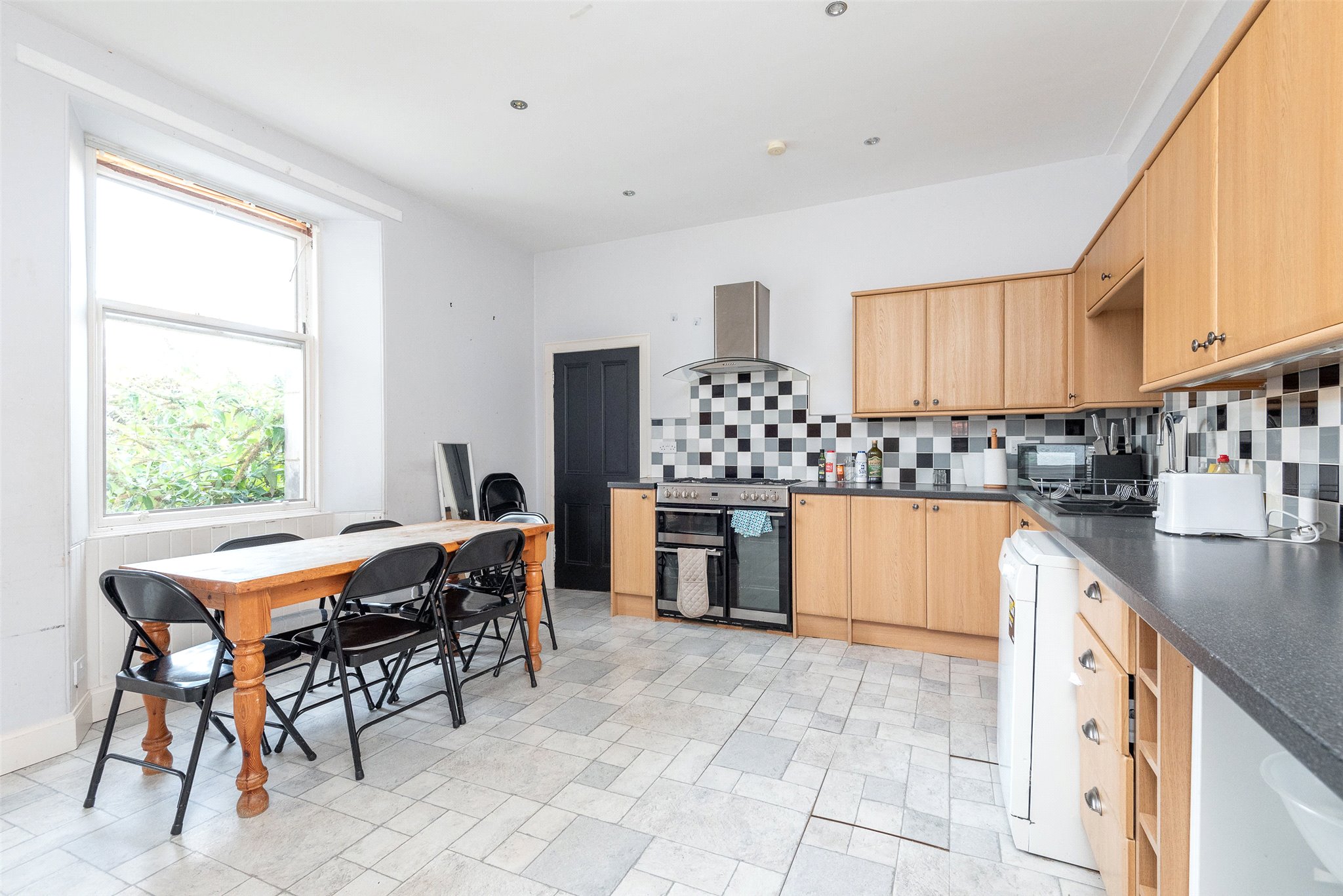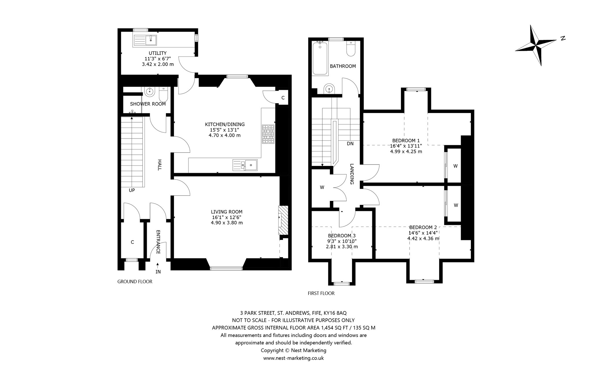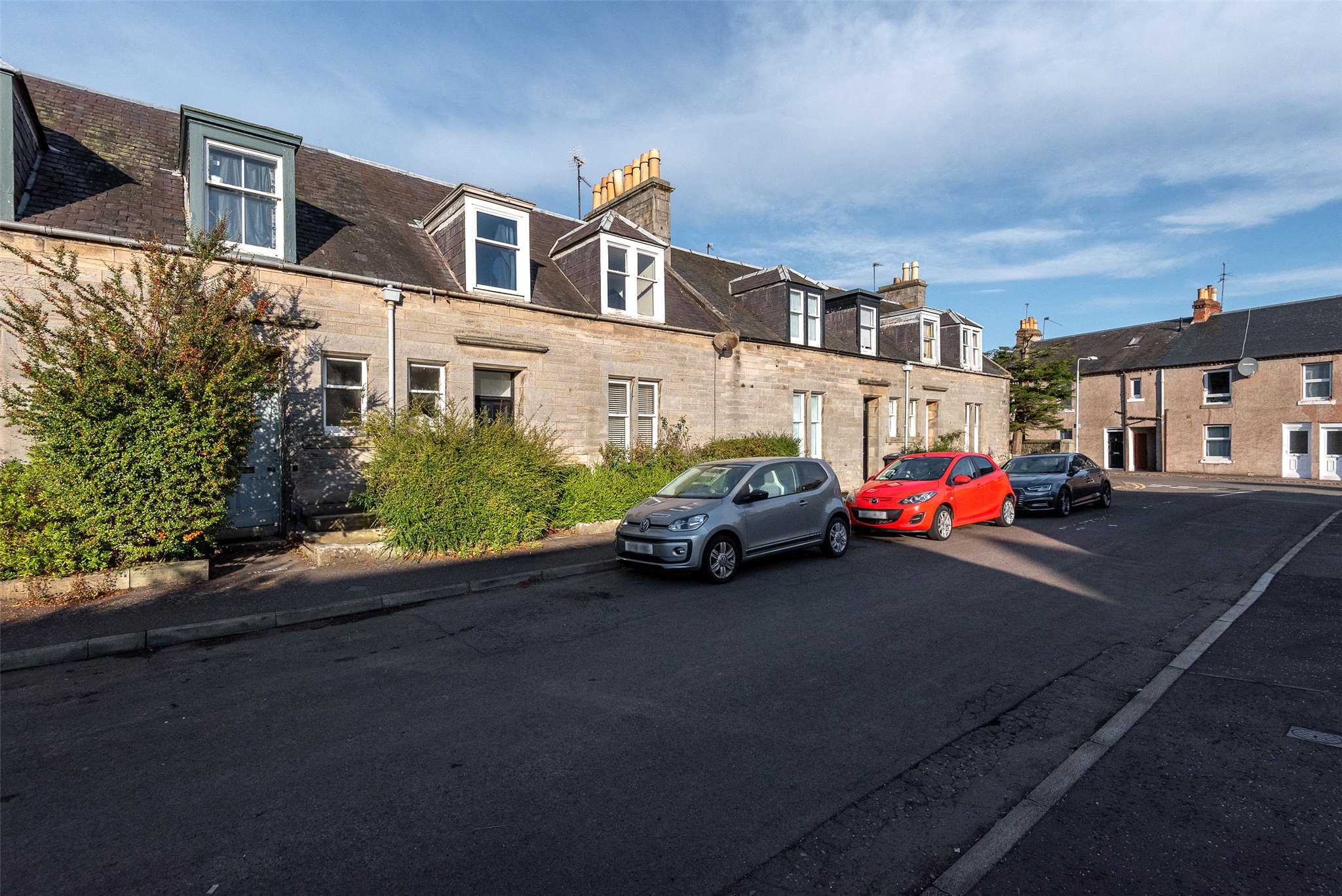 Just minutes from the centre of St Andrews and the university, this bright and spacious mid-terrace home is ideal for a range of buyers. A charming entrance vestibule with polished wooden flooring leads to an inviting east-facing living room overlooking Park Street, featuring a crisp neutral dècor, wooden flooring, a shelved press, and an open fireplace set in an elegant hearth. The light-filled west-facing kitchen at the rear offers ample space for informal dining, with oak-effect cabinetry, smooth grey worktops, and a monochrome tiled splashback, complemented by a range cooker and extractor hood. The adjoining utility room provides additional storage and access to the rear garden, while a convenient shower room completes the ground floor. Carpeted stairs with a mahogany banister lead to the first floor, where three double bedrooms await—each with an east or west-facing orientation. The spacious principal bedroom overlooks the rear garden and features built-in wardrobes. A well-appointed bathroom with a bath, wall-mounted shower, WC, washbasin, and chrome towel radiator serves all bedrooms.