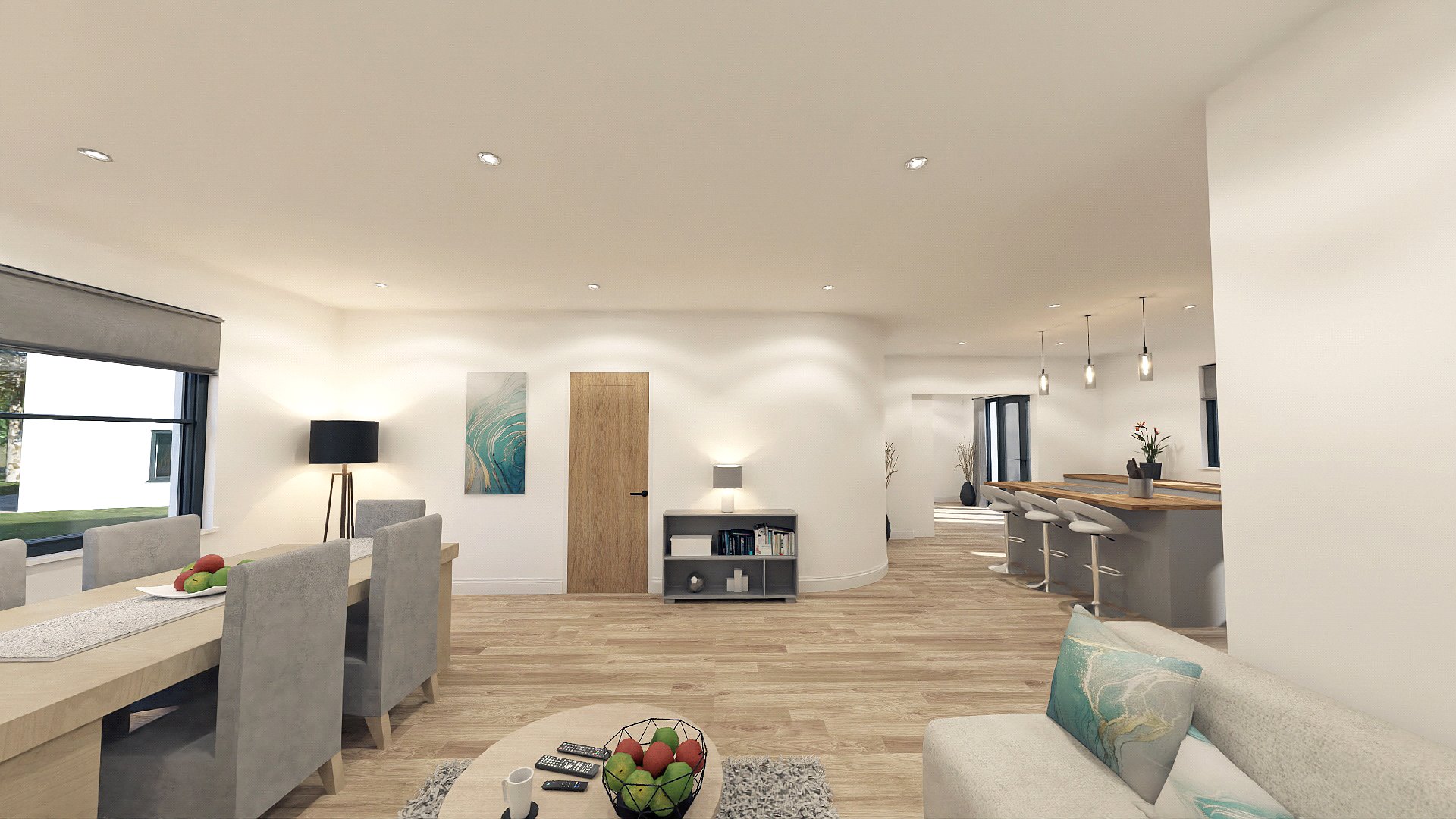 Plot 4 represents the epitome of modern living. Entering through a charming vestibule, a spacious sitting room awaits, complete with French doors that lead directly to the garden. Enjoying views stretching out over the Firth of Forth and the landscape beyond, offering a seamless flow between indoor and outdoor living. This space effortlessly connects to an open-plan kitchen, dining and family area, catering to all occasions. The kitchen is designed with both style and convenience in mind, featuring an adjoining utility room to keep residents’ main space organised. The curved wall to the staircase is mirrored in the kitchen/dining family area, providing a truly bespoke room.