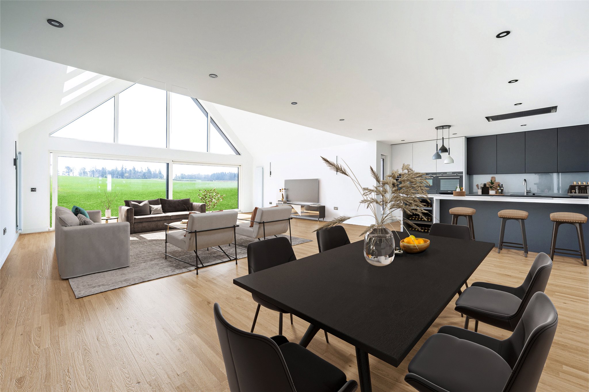 Designed by Frullani architects, built by Montrave Homes Ltd, 1 Kame View forms part of a small exclusive development set in a breathtaking rural location. Showcasing forward-thinking energy efficiency and designed with high-spec fixtures and fittings it perfectly blends contemporary style and luxury with an idyllic setting. Boasting a contemporary façade yet one sympathetic to the natural surroundings, the property makes a wonderful first impression. From a welcoming entrance vestibule, striking black grid double doors open into a generously proportioned and inviting foyer and hallway. From here you move through a further set of elegant doors to a spectacular south-facing living dining room and kitchen. Open-plan and flooded with light from VELUX windows and full-height triple-glazed windows/sliding doors that frame a captivating countryside aspect and lead to the garden it lies at the heart of the home and will make a fantastic setting for day-to-day living and entertaining. Custom-built, the sleek Leicht German kitchen combines white and grey wall and floor cabinetry with stone worktops. A full suite of high-spec SIEMENS integrated appliances includes an eye-level microwave, two ovens, and a ceiling extractor hood. The centrepiece is a desirable kitchen island with a built-in induction hob and wine fridges, doubling as a breakfast bar and stylish divider between the living and dining areas. Adjacent to the kitchen, a spacious utility room with access to the carport and garage offers additional storage and convenience. Moving through the residence you pass an indulgent Villeroy and Boch family bathroom featuring a wall-hung washbasin built into vanity, hidden cistern wall-hung WC, bath, and chrome towel radiator. Set against a backdrop of marble tiles it is beautifully finished. From here four light-filled double bedrooms await. Each has been thoughtfully designed to provide a serene and restful retreat with luxurious en-suite shower rooms and walk-in wardrobes.
