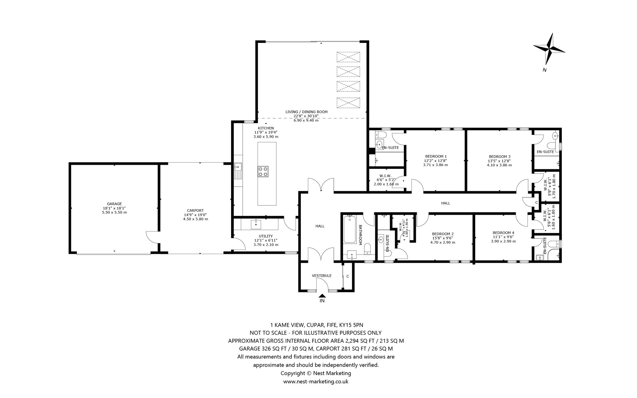 Entrance vestibule, foyer, hallway, living dining kitchen, utility, four bedrooms (each with en-suite and walk-in-wardrobe), bathroom
