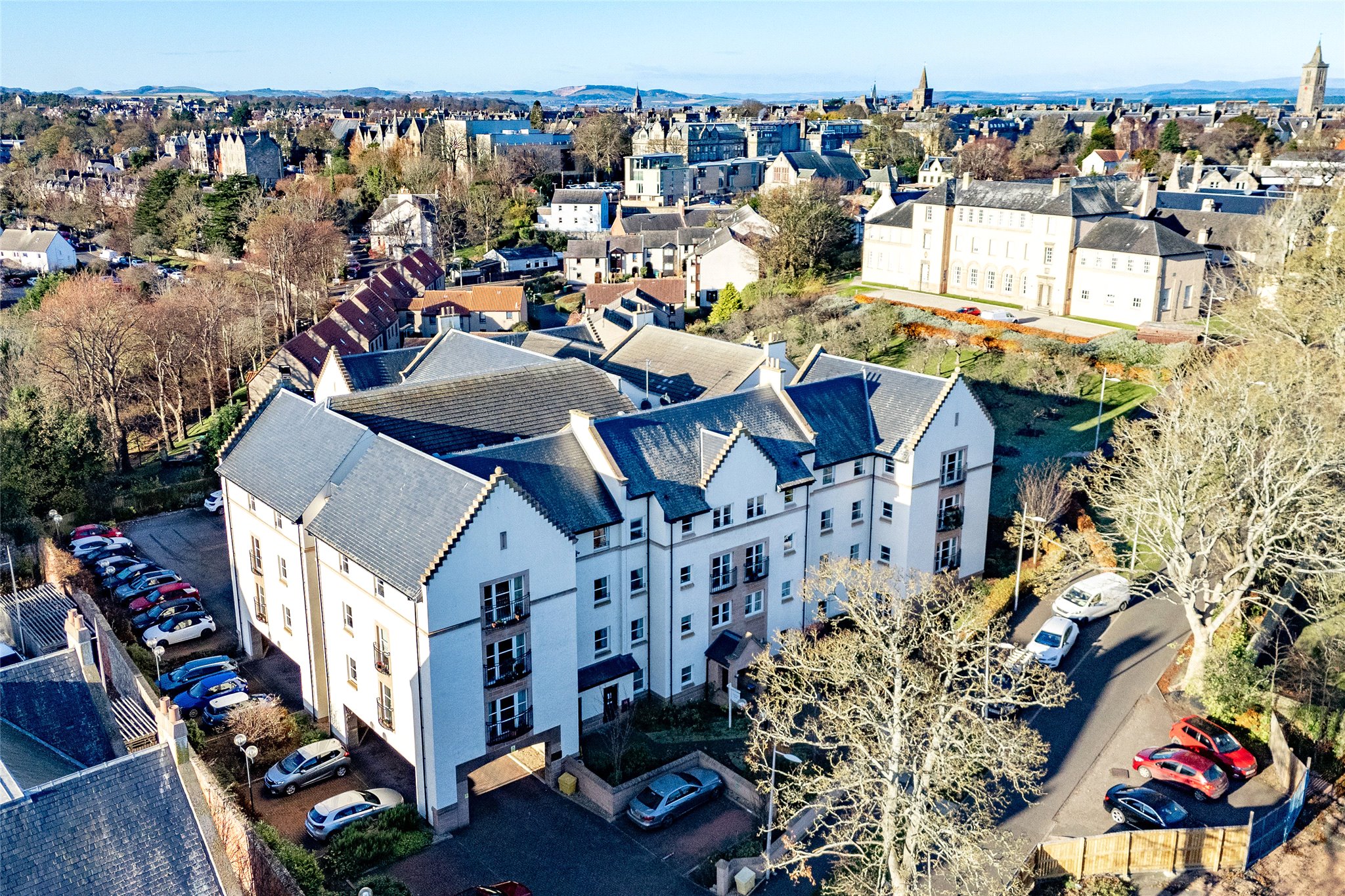 Set in the scenic grounds of the former St Leonard’s School, Scholars Gate enjoys a wonderful setting close to the centre of St Andrews. Scotland’s world-famous home of golf and the site of the country's oldest university, St Andrews is a thriving town catering to students, golfers, and residents alike. There is an array of shops and amenities to meet daily needs including boutique and independent retailers selling artisan produce and goods such as St Andrews Bakery, Mitchell’s Delicatessen, and Leuchars Quality Butchers through to well-known high street stores such as Sainsbury’s Local. Other popular retail destinations are Waterstones, Boots, and H&M. Thriving and cosmopolitan bars, restaurants, and cafès sit side-by-side offering fine dining through to casual lunches and drinks. Positioned on the stunning east coast of Fife, St Andrews is the perfect location from which to explore the characterful fishing villages that make up this scenic part of Scotland including Anstruther, St Monans, Crail, and Pittenweem. Dundee to the north is a thirty-minute drive and Edinburgh to the south is approx. 90 minutes by car or just over an hour by train from Leuchars.