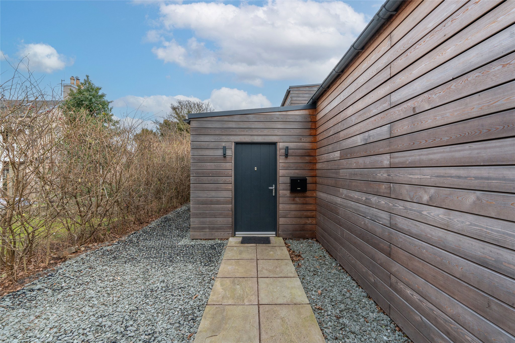 The enclosed south-east-facing garden is cultivated as a wild flower meadow with fruit trees and a border of sandstone paving. There is stair access down from the driveway to the house and this is fitted with a platform stair lift.