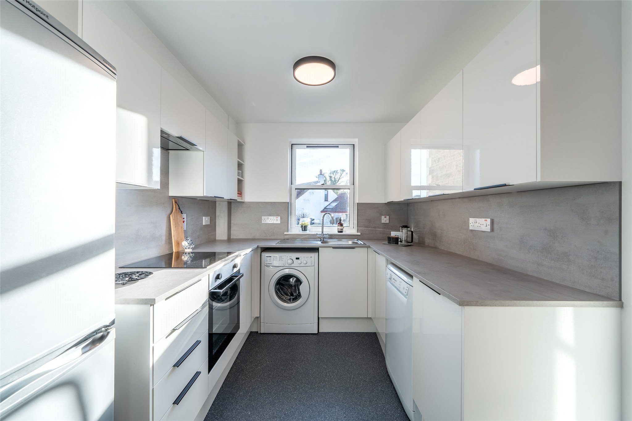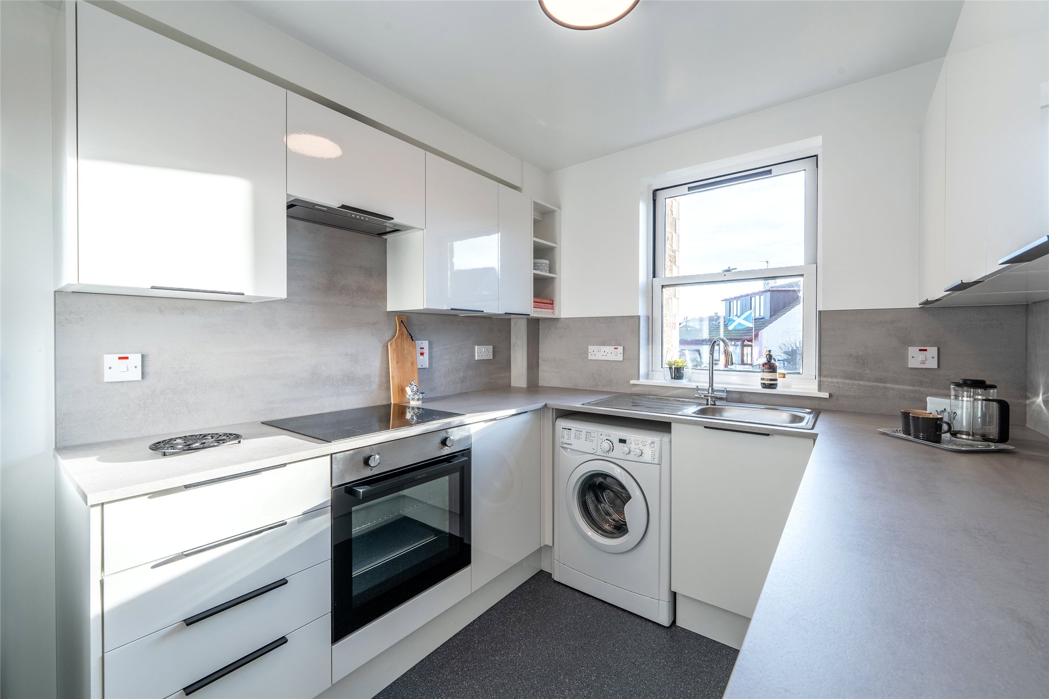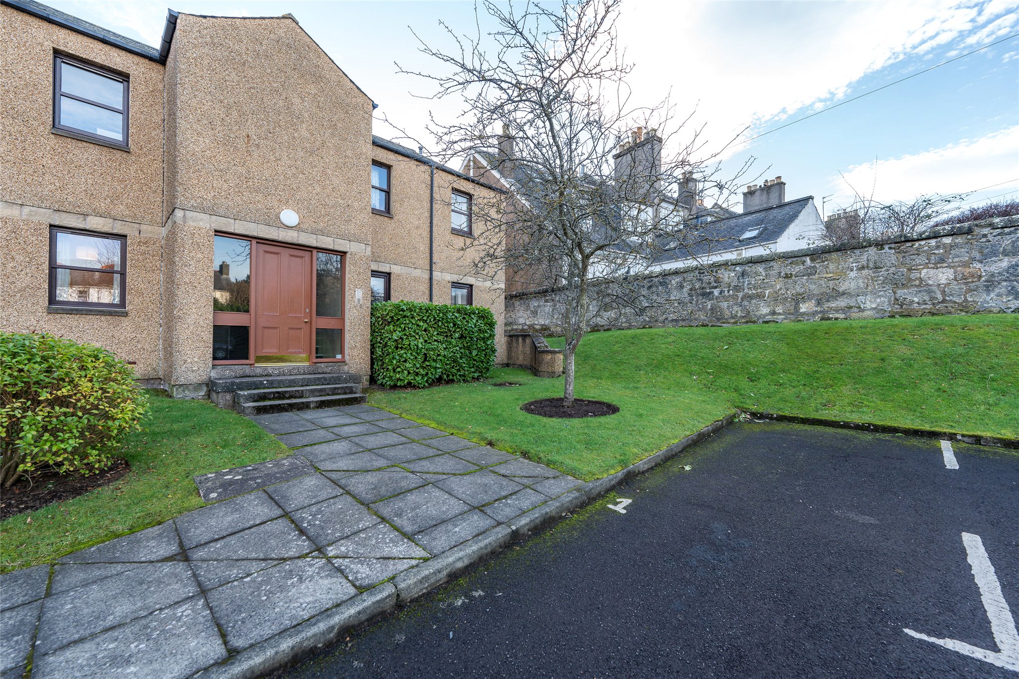 Nestled on the ground floor of an established development and enjoying stylish modern interiors, this two-bedroom property promises buyers a comfortable lifestyle minutes from the heart of St Andrews. A carpeted hallway leads you to a spacious south-east-facing living room. Enjoying an appealing neutral dècor and a generous layout it is a comfortable and inviting space that includes a sizeable area for dining. Adjoining is a newly fitted kitchen with a sleek finish. Gloss white wall and floor units are complemented by smooth grey worktops and high-spec integrated LAMONA appliances including an induction hob, oven and extractor hood. There is also a dishwasher, washing machine and fridge freezer. Accessed from the hallway, there are two carpeted double bedrooms. Tastefully decorated, the principal boasts built-in wardrobes. The apartment is completed by a bathroom featuring a bath with a wall-mounted shower, WC, washbasin, heated towel rail and ample storage in wall mounted unit.