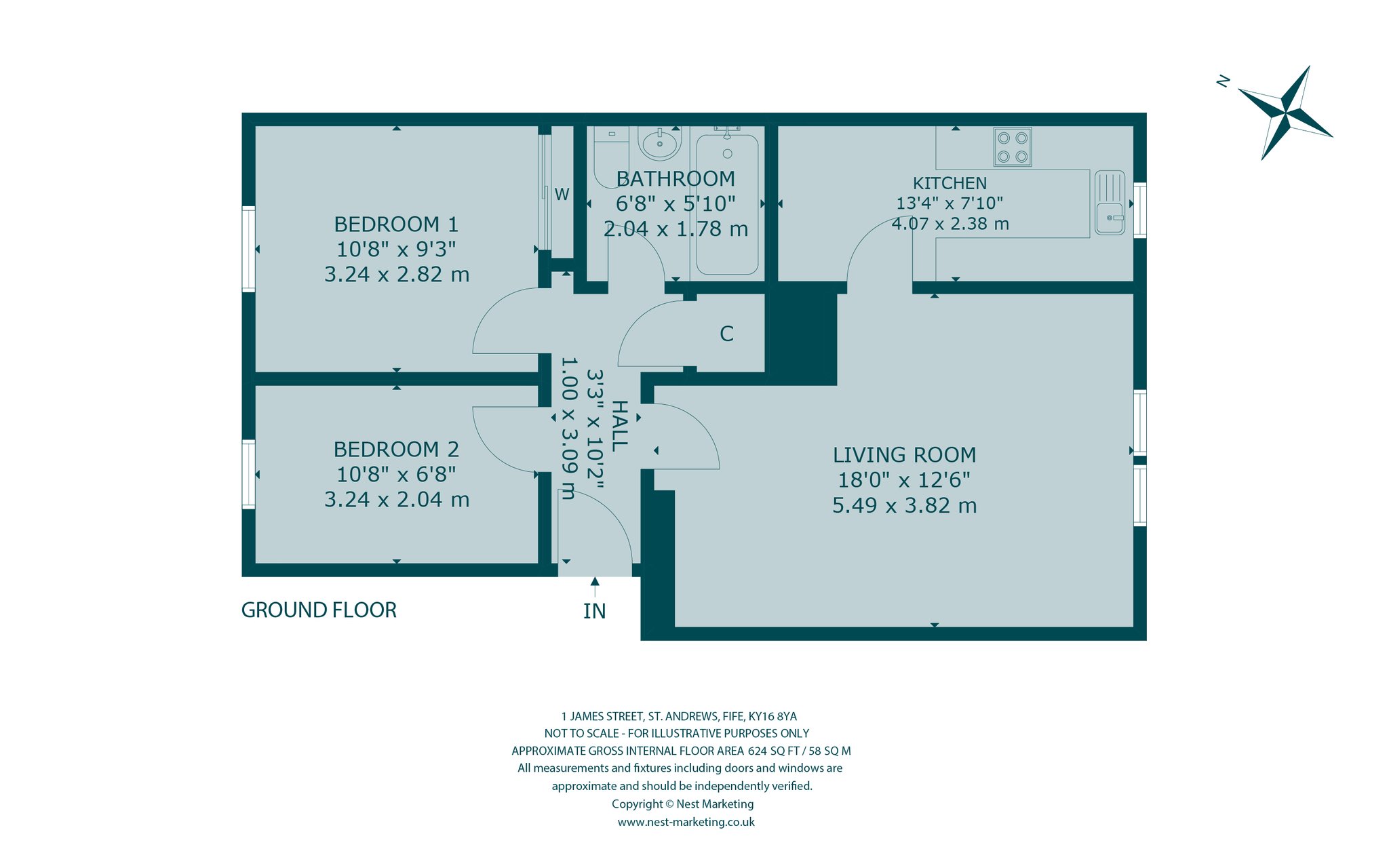 Entrance hallway, living room, kitchen, two bedrooms, bathroom