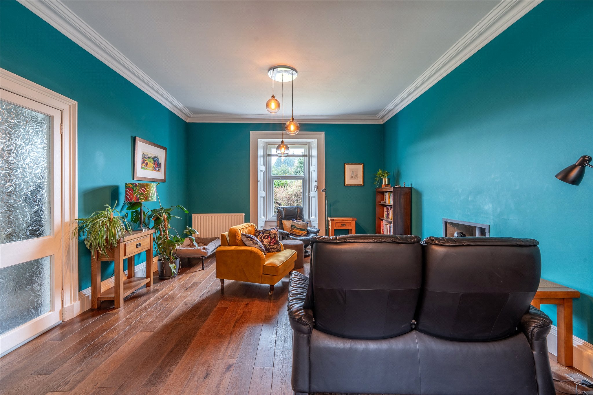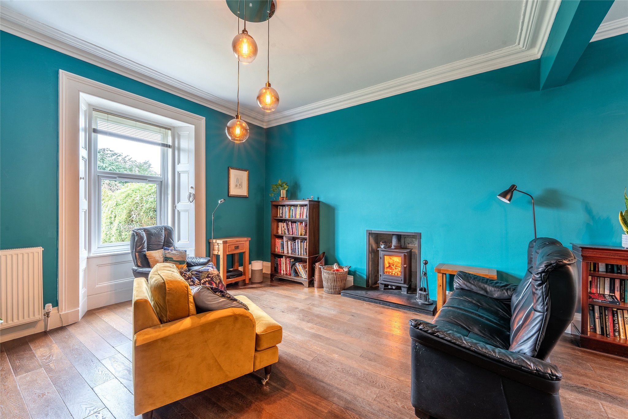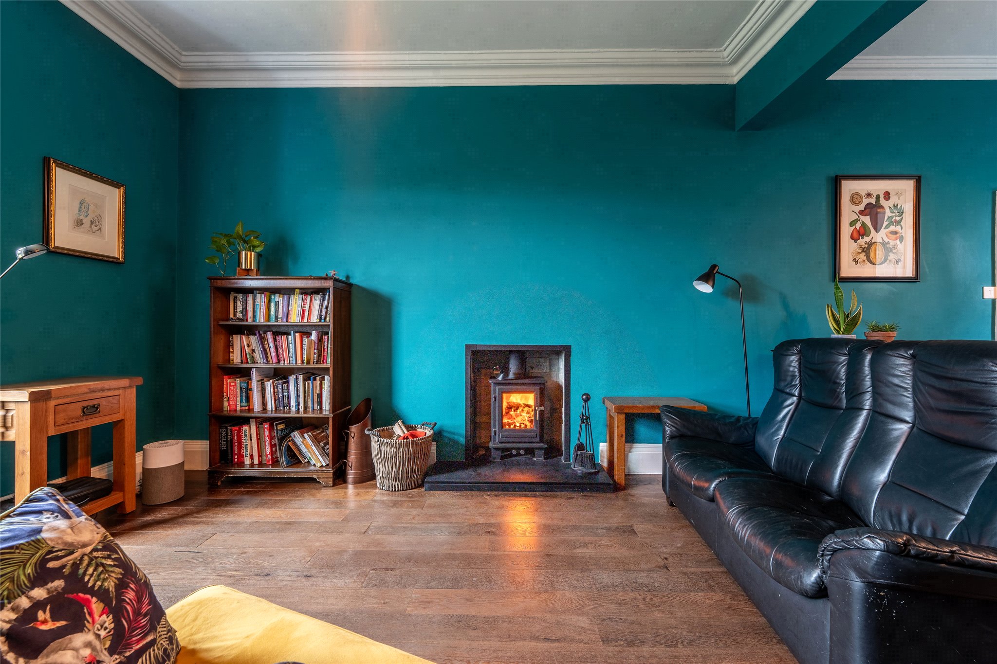 A neat lawn flanks the pathway leading to the front door, which opens into a hallway finished in shades of grey and white. To your left, a bright and spacious living room awaits. Featuring handsome wooden flooring and a multi fuel stove, this dual-aspect space exudes warmth and allows for a variety of furniture configurations.