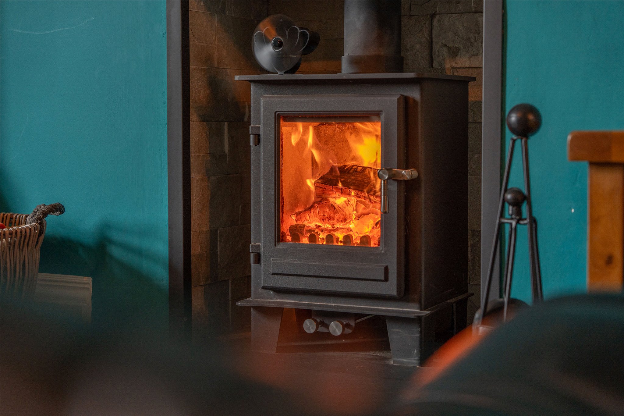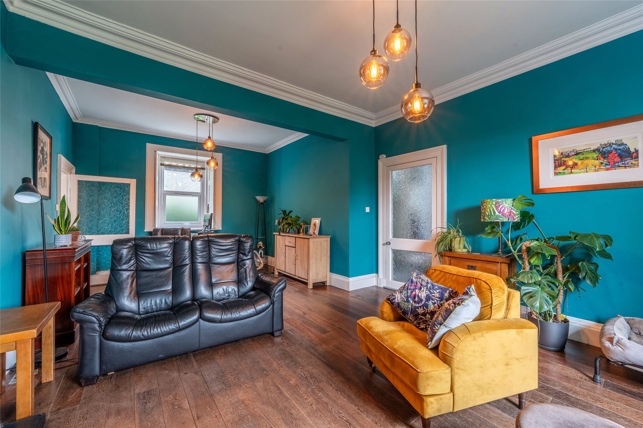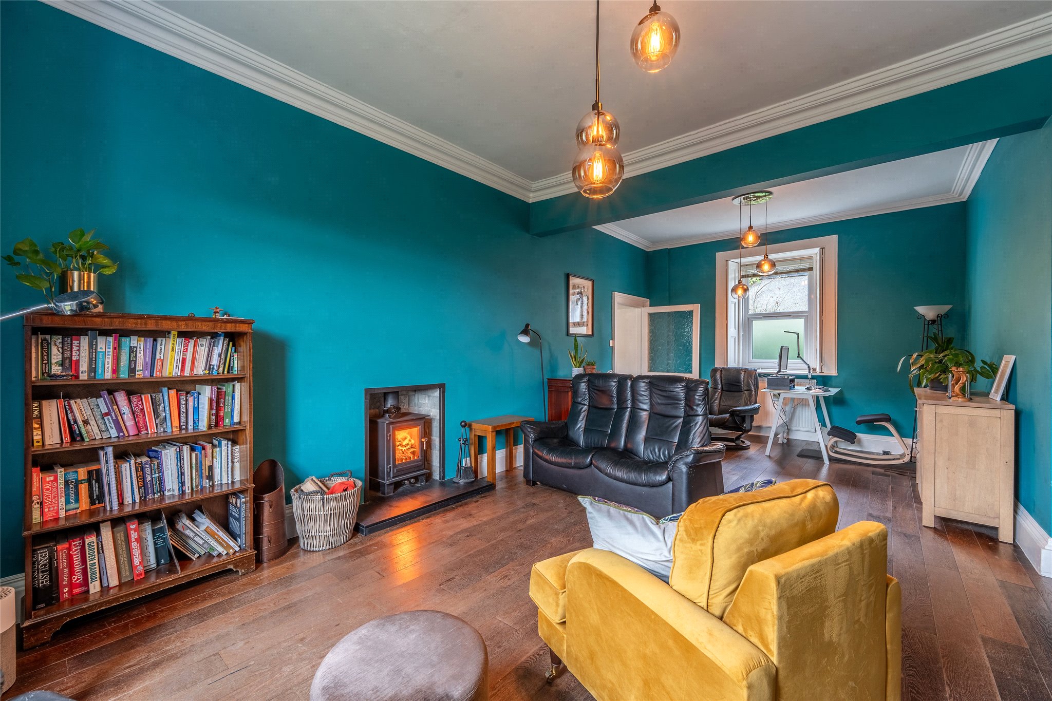 A neat lawn flanks the pathway leading to the front door, which opens into a hallway finished in shades of grey and white. To your left, a bright and spacious living room awaits. Featuring handsome wooden flooring and a multi fuel stove, this dual-aspect space exudes warmth and allows for a variety of furniture configurations.