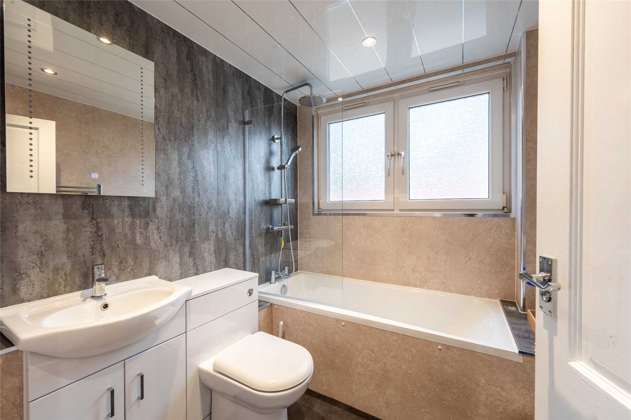 Two additional bedrooms complete the upper level, all sharing access to a bathroom featuring a hidden cistern WC, a washbasin built into the vanity, and a bath with a wall-mounted rainfall shower. The house is double glazed throughout.