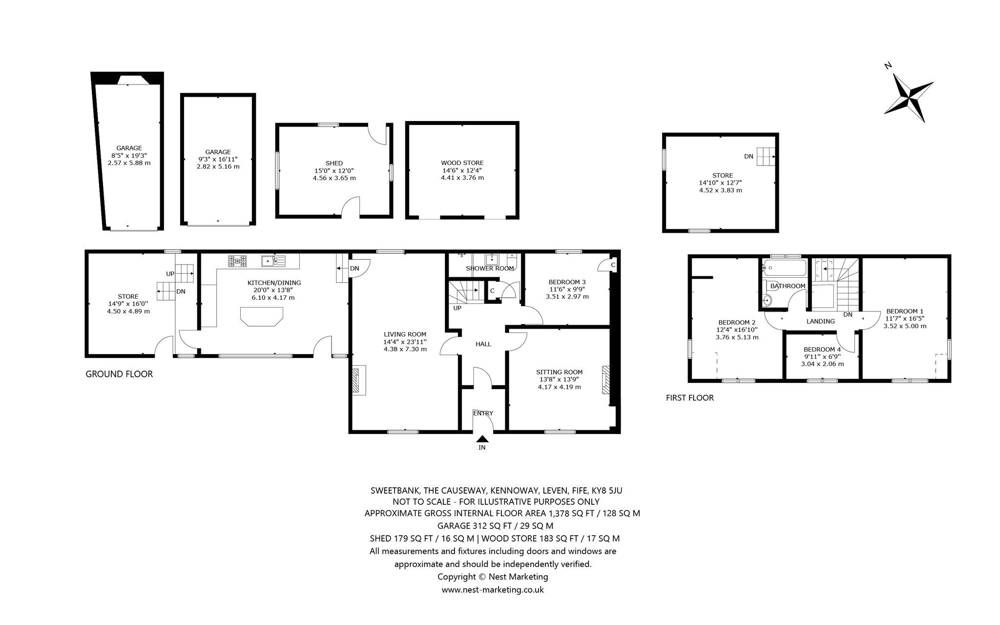 Entrance vestibule, hallway, living room, sitting room, kitchen, bedroom, shower room, two storey storage room