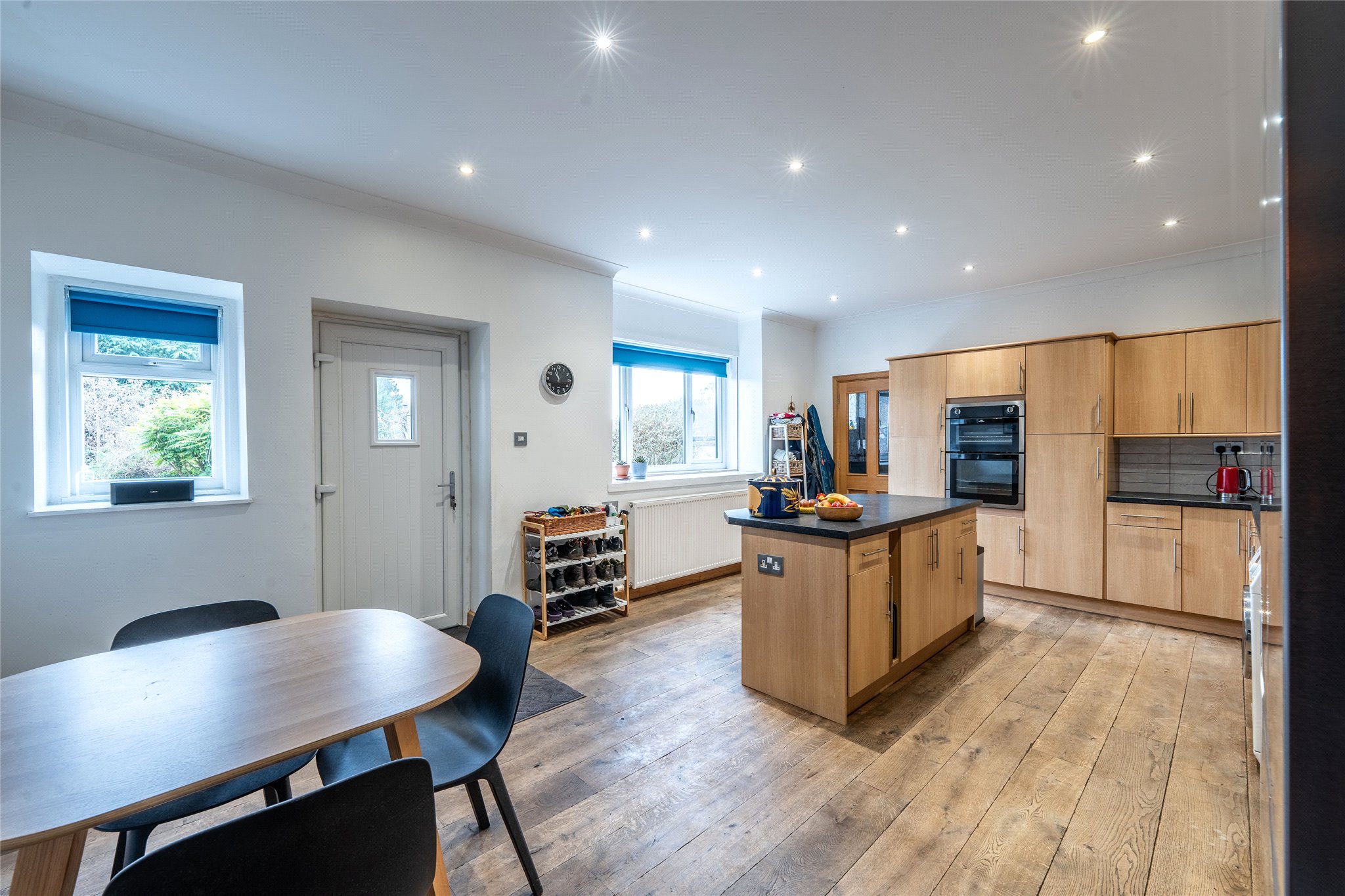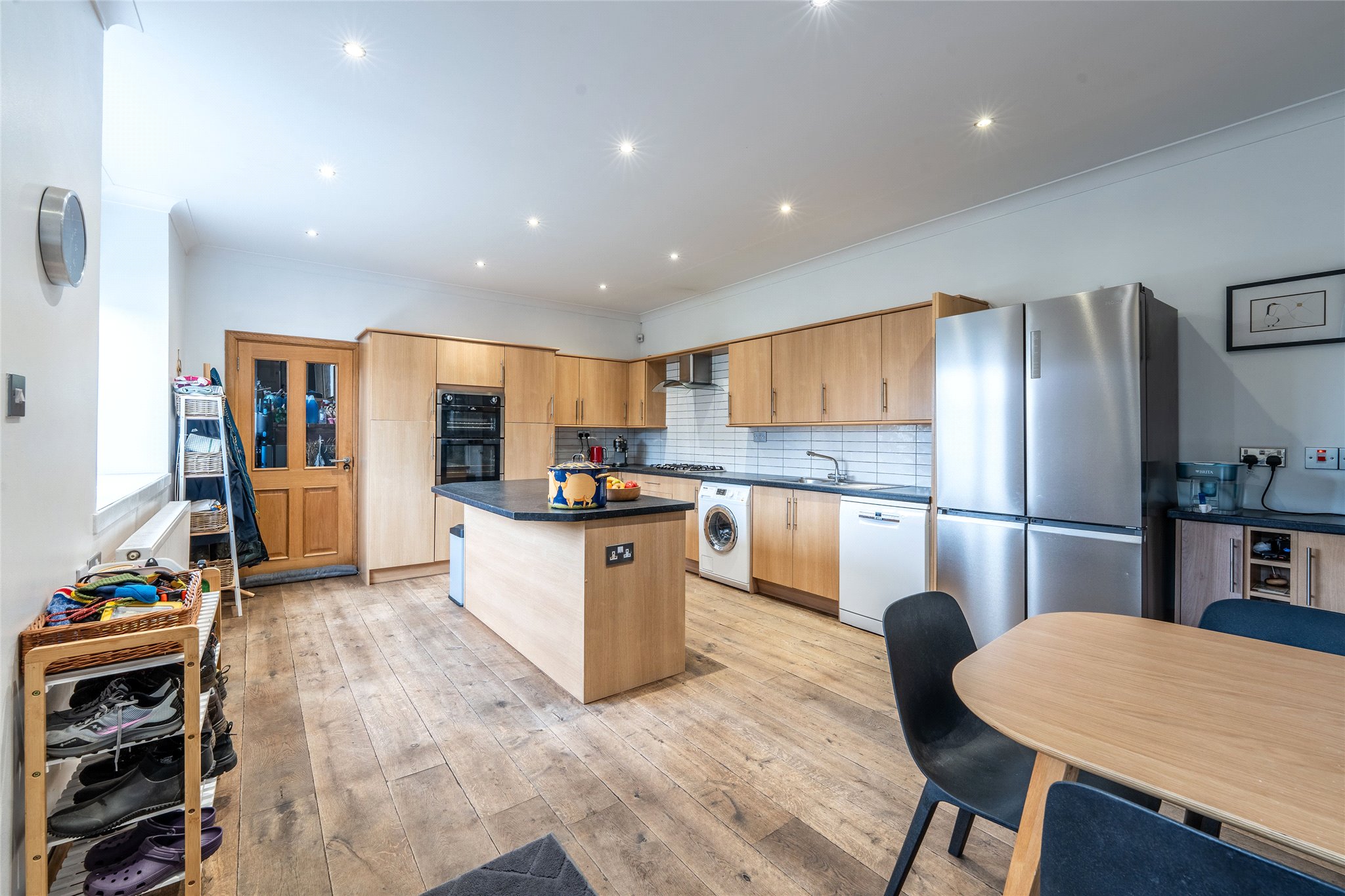 From here, you move into the large kitchen. Generously proportioned, it is perfect for dining and is fitted with wall and floor cabinets, smooth worktops, and a metro-tiled splashback. Integrated appliances include an extractor hood, gas hob, eye-level grill, and oven, while a kitchen island adds extra storage and worktop space.