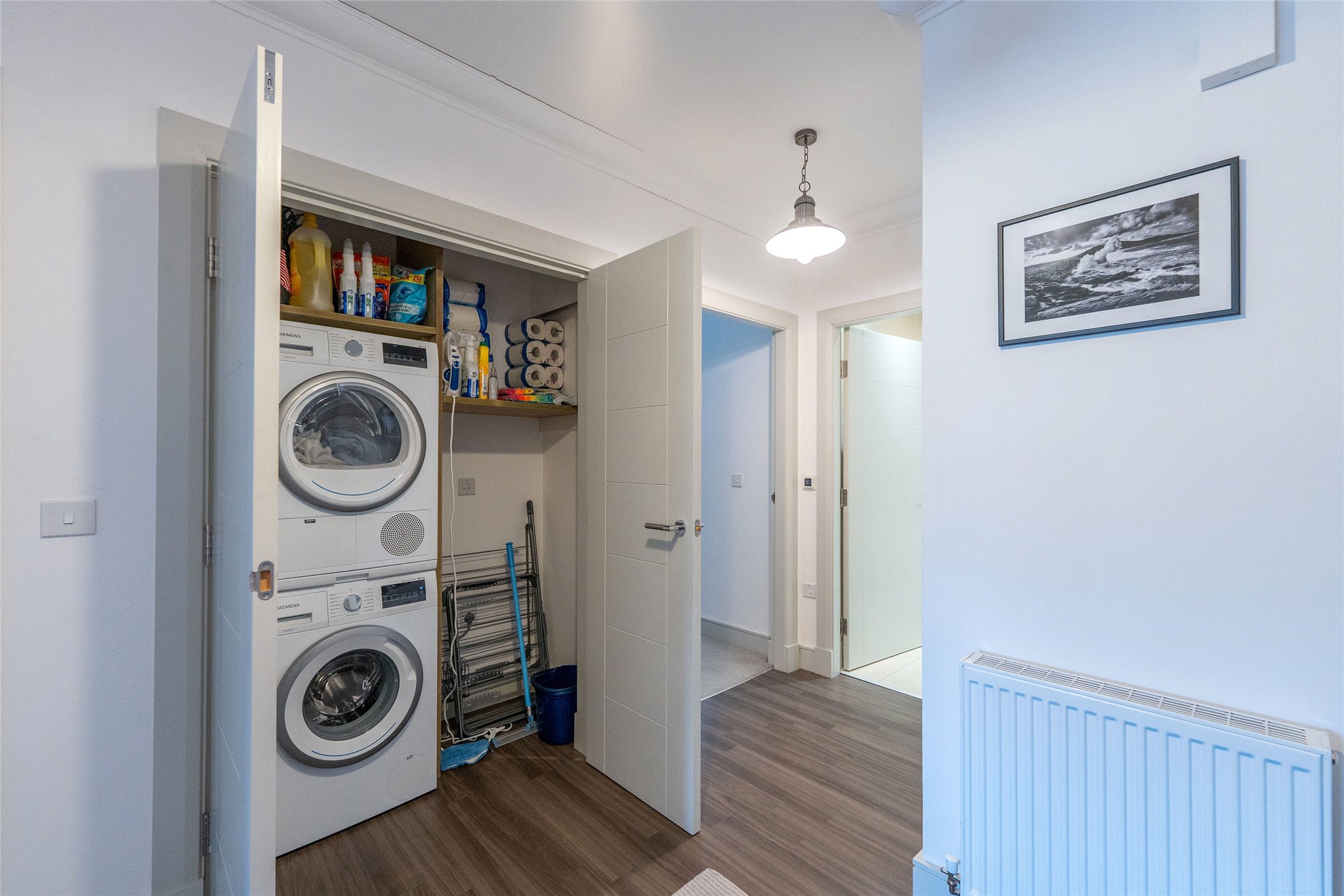Presented in pristine, turn-key condition, this two-bedroom new-build apartment, just minutes from the centre of St Andrews, boasts a deceptively spacious layout, an easterly orientation, and high-quality finishes making it perfect for investors, first-time buyers, and professionals. Lying in well-kept shared landscaped grounds, stairs take you to the first-floor (left) property where the front door opens into a spacious and inviting hallway equipped with a built-in utility cupboard with washing machine and dryer. Adorned with handsome Amtico flooring it guides you through double doors towards the generously proportioned open-plan living room and kitchen. Bathed in natural light and with a continuation of the hallway’s interior design, this dual-aspect space which also allows for dining, has been thoughtfully designed to suit modern living, offering a delightful environment for both relaxation and entertaining. The generously sized kitchen, separated from the living area by a half-peninsula counter, showcases light grey wall and floor cabinetry with under-base lighting, complemented by natural-hued worktops. High-spec integrated SIEMENS appliances only add to the aesthetic appeal and include an eye-level grill, oven, and induction hob. Returning to the hallway, the east-facing carpeted principal double bedroom is a light and airy retreat with two built-in wardrobes and a stylish contemporary monochrome shower room showcasing large gloss grey tiles, a hidden cistern WC, washbasin, concealed storge and underfloor heating. The second twin-windowed double bedroom mirrors the principal in terms of orientation, space, and décor. Completing the layout is a well-appointed bathroom featuring a wall-mounted rainfall shower over the bath, a hidden cistern WC, a chrome towel radiator, concealed storage and washbasin also with underfloor heating. Large porcelain floor and wall tiles create a soothing feel.