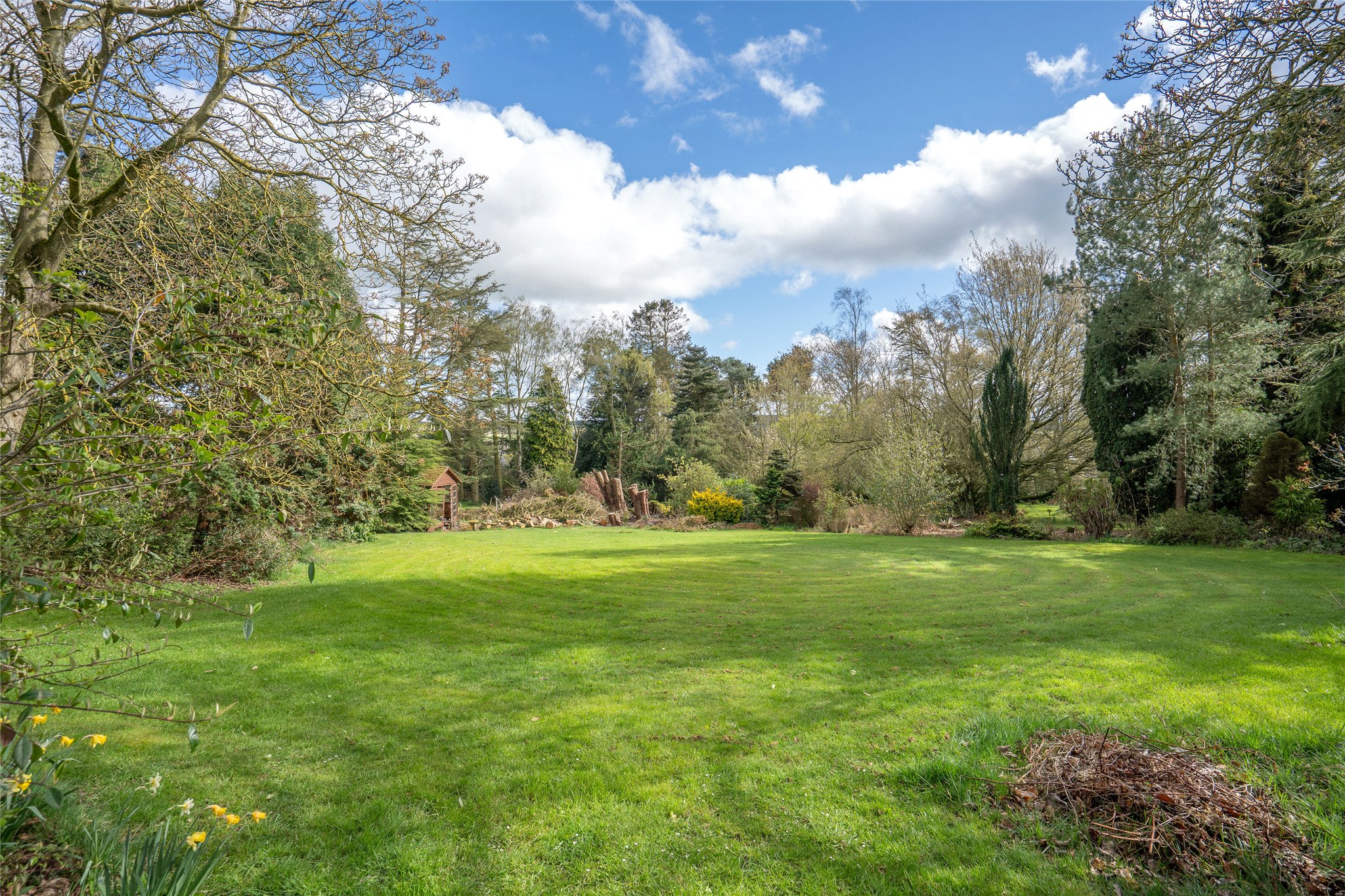 The property is approached by a long drive culminating in a parking area. Lying to the north and north-west the mature and expansive garden is largely laid to lawn and interspersed by a variety of established trees, flowering borders, and shrubs to create a tranquil and private haven. A paved alfresco area overlooking the lawn and situated directly in front of the house is perfect for relaxing whilst the garden itself offers a variety of secluded seating areas. There are a variety of outbuildings including a wood store.
