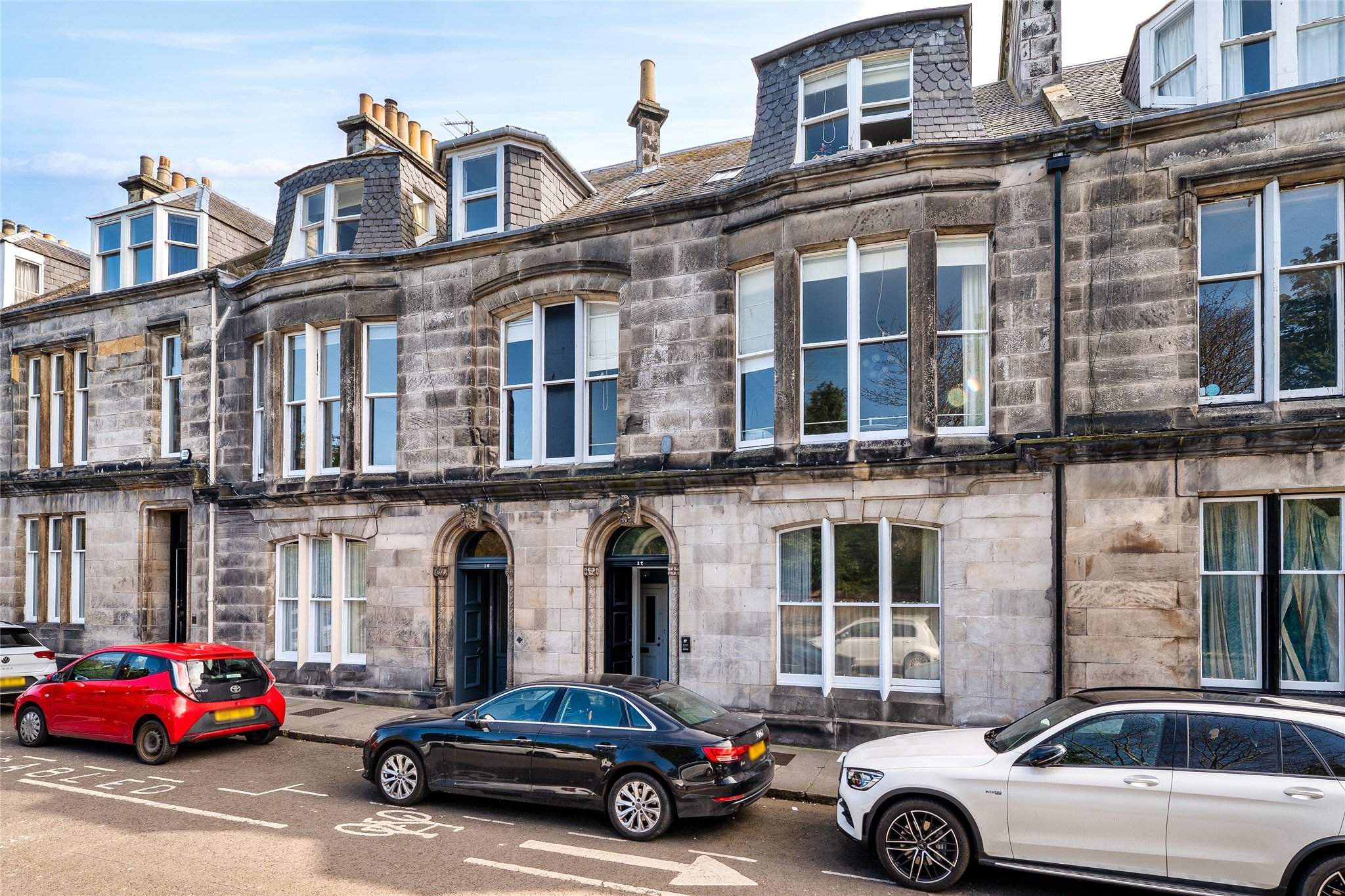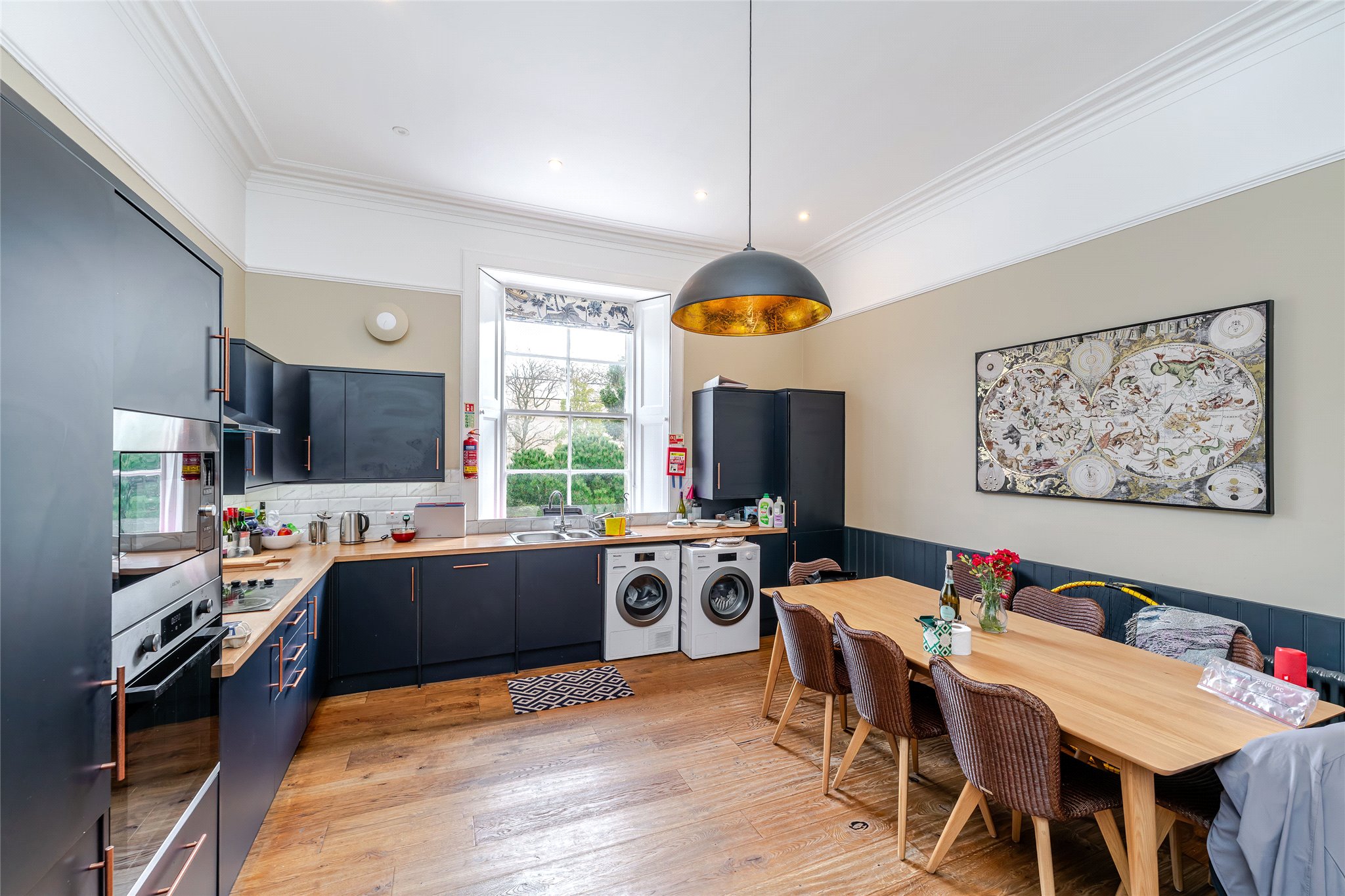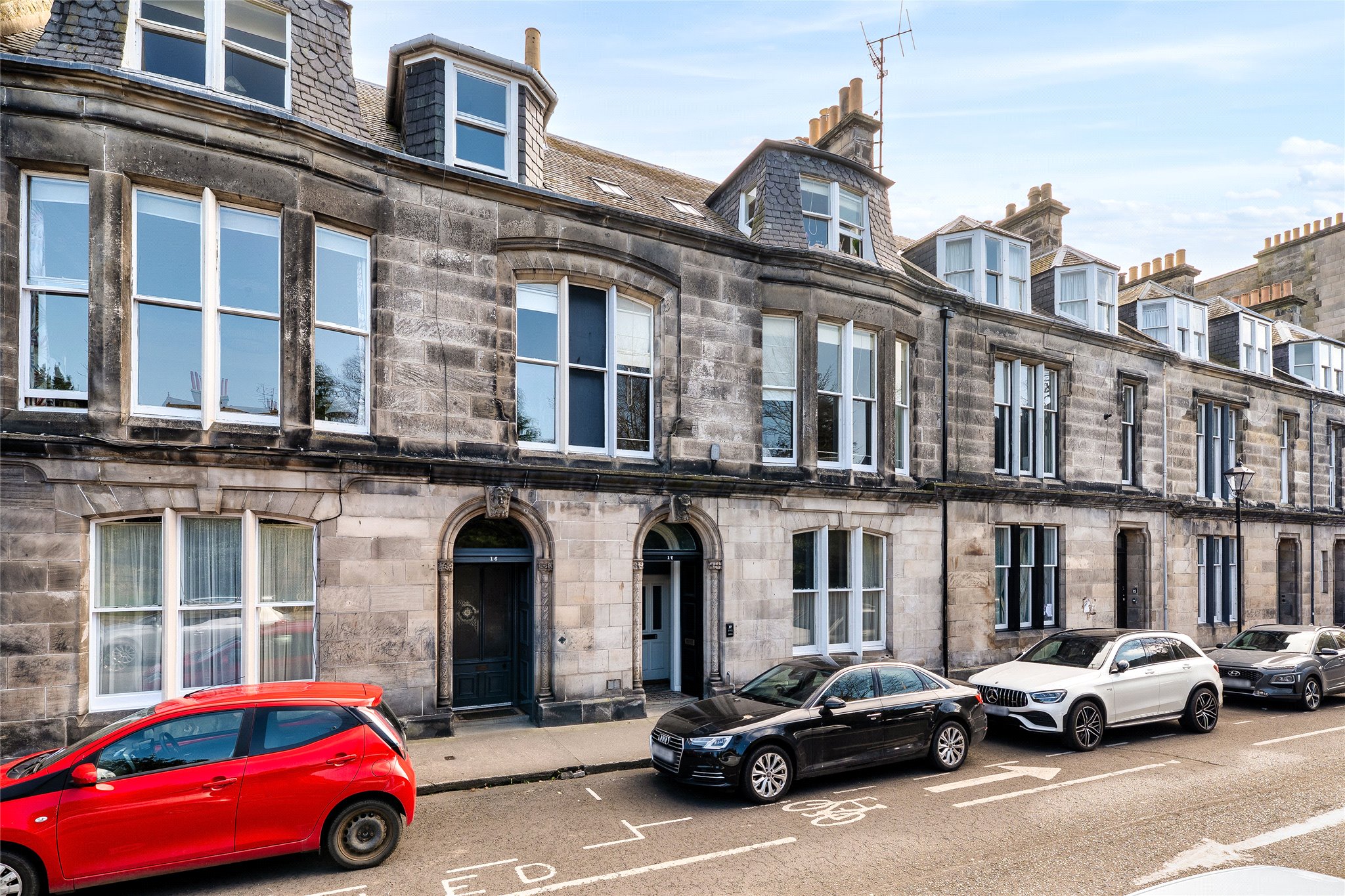 Situated within the prestigious St Andrews Conservation Area, and forming part of a traditional C-listed townhouse, this light-filled five-bedroom double-upper property beautifully blends fine period details and high-quality finishes. A successful 5 person HMO it offers a rare opportunity for buyers to acquire a luxurious residence or lucrative investment. From the moment you enter, the charm of its period features is evident with the shared ground floor vestibule adorned with ornate pillars and original mosaic floor tiling. A striking original staircase with intricate ironwork and an oak banister then leads to the first floor, where you'll find a stunning west-facing living room bathed in natural light from elegant, curved bay windows overlooking Queen’s Gardens. Enjoying generous proportions and boasting high ceilings, intricate cornicing, and a magnificent white marble mantelpiece framing a stylish living flame fireplace it exudes a sense of understated sophistication and comfort. To the rear, an impressive east-facing dining kitchen is thoughtfully designed for relaxed living and entertaining. L-shaped in layout, it features rich dark blue cabinetry with gold-effect hardware, wood-effect worktops, and a crisp white metro-tiled splashback. Integrated high-spec appliances include a microwave, oven, hob, extractor hood, and an American-style fridge/freezer. The first floor is completed by a sizeable modern bathroom featuring a bath, shower enclosure, towel radiator, hidden cistern WC, and a washbasin built into vanity, alongside a bright west-facing double bedroom. Upstairs, the principal double bedroom offers a peaceful, east-facing retreat. Tastefully decorated and complete with built-in wardrobes, it also benefits from a luxurious en-suite rainfall shower room with a chrome towel radiator, washbasin built into a wall-hung vanity, metro tiling, and a hidden cistern WC. A second double bedroom mirrors the same refined style and en-suite features, while the remaining two double bedrooms each with built-in storage, share a well-appointed shower room.