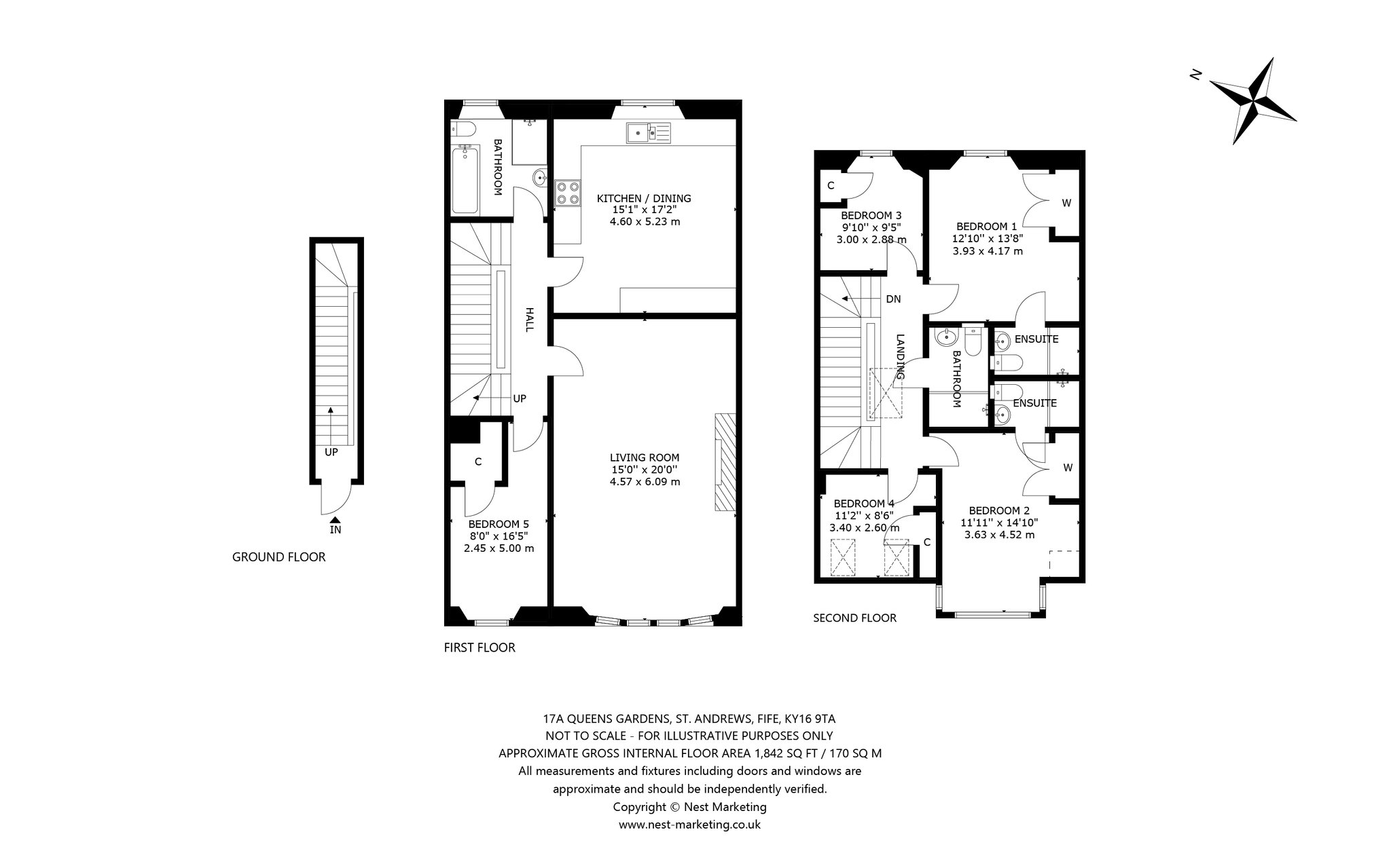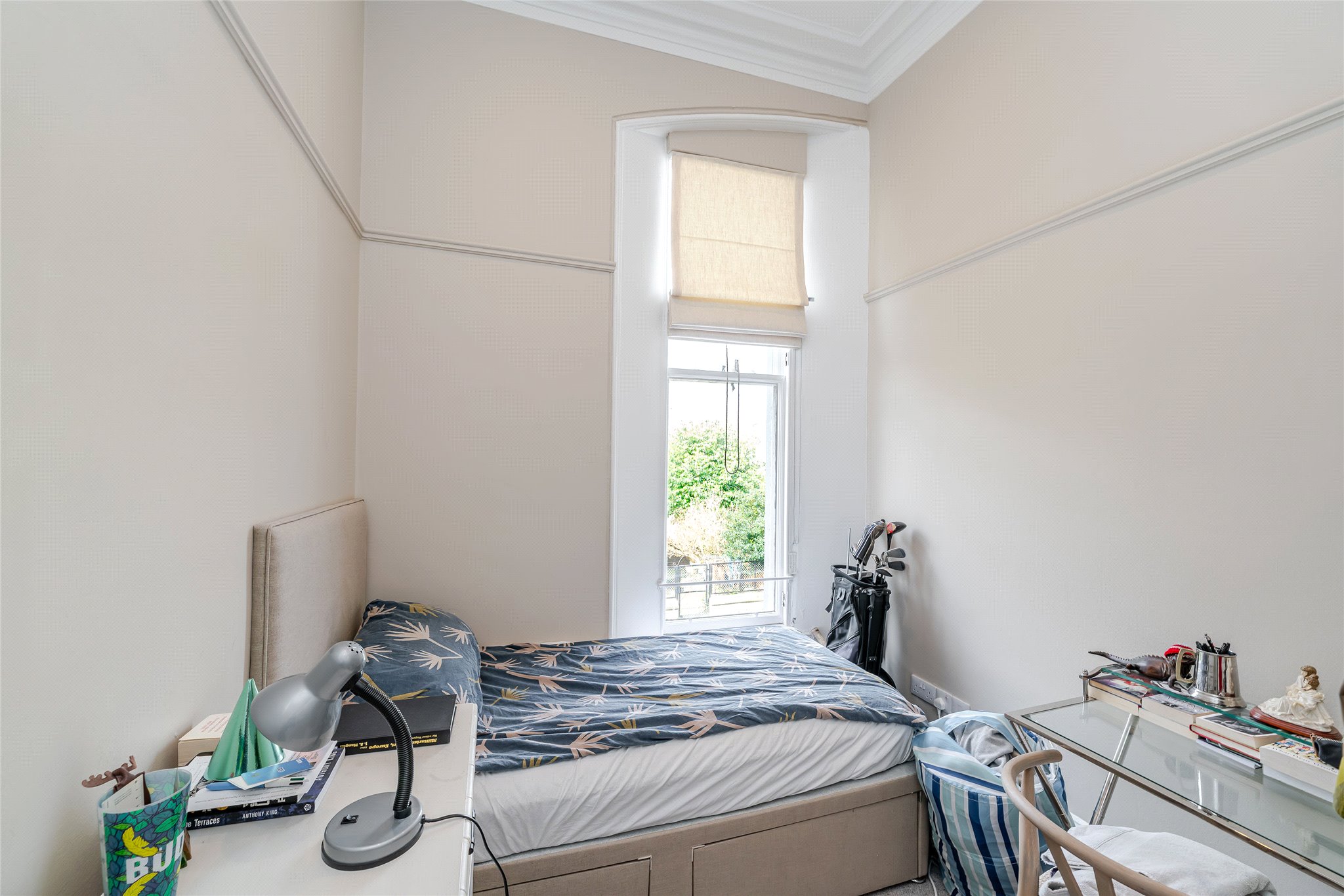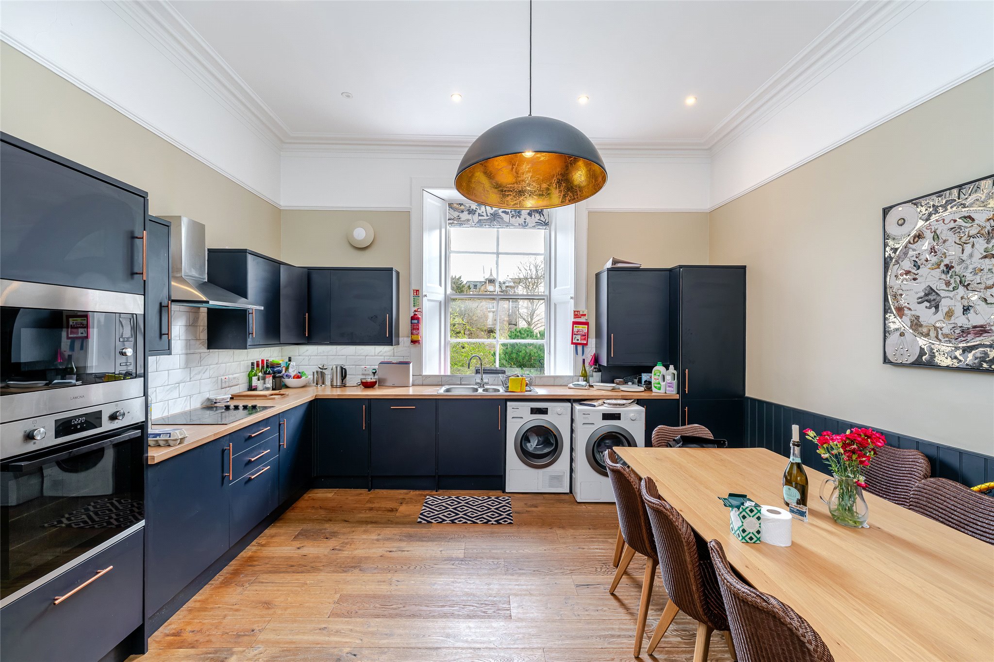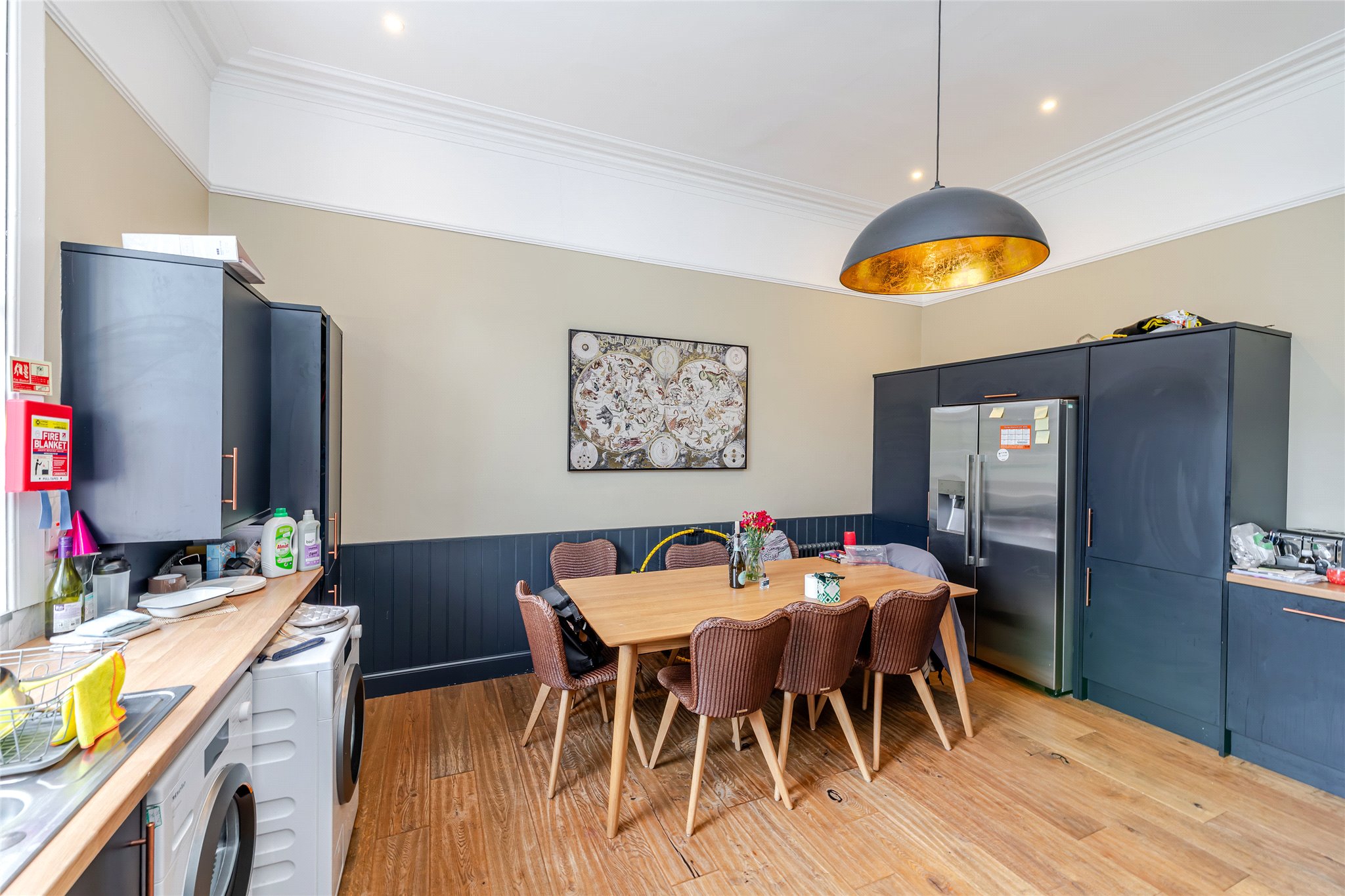 Situated within the prestigious St Andrews Conservation Area, and forming part of a traditional C-listed townhouse, this light-filled five-bedroom double-upper property beautifully blends fine period details and high-quality finishes. A successful 5 person HMO it offers a rare opportunity for buyers to acquire a luxurious residence or lucrative investment. From the moment you enter, the charm of its period features is evident with the shared ground floor vestibule adorned with ornate pillars and original mosaic floor tiling. A striking original staircase with intricate ironwork and an oak banister then leads to the first floor, where you'll find a stunning west-facing living room bathed in natural light from elegant, curved bay windows overlooking Queen’s Gardens. Enjoying generous proportions and boasting high ceilings, intricate cornicing, and a magnificent white marble mantelpiece framing a stylish living flame fireplace it exudes a sense of understated sophistication and comfort. To the rear, an impressive east-facing dining kitchen is thoughtfully designed for relaxed living and entertaining. L-shaped in layout, it features rich dark blue cabinetry with gold-effect hardware, wood-effect worktops, and a crisp white metro-tiled splashback. Integrated high-spec appliances include a microwave, oven, hob, extractor hood, and an American-style fridge/freezer. The first floor is completed by a sizeable modern bathroom featuring a bath, shower enclosure, towel radiator, hidden cistern WC, and a washbasin built into vanity, alongside a bright west-facing double bedroom. Upstairs, the principal double bedroom offers a peaceful, east-facing retreat. Tastefully decorated and complete with built-in wardrobes, it also benefits from a luxurious en-suite rainfall shower room with a chrome towel radiator, washbasin built into a wall-hung vanity, metro tiling, and a hidden cistern WC. A second double bedroom mirrors the same refined style and en-suite features, while the remaining two double bedrooms each with built-in storage, share a well-appointed shower room.