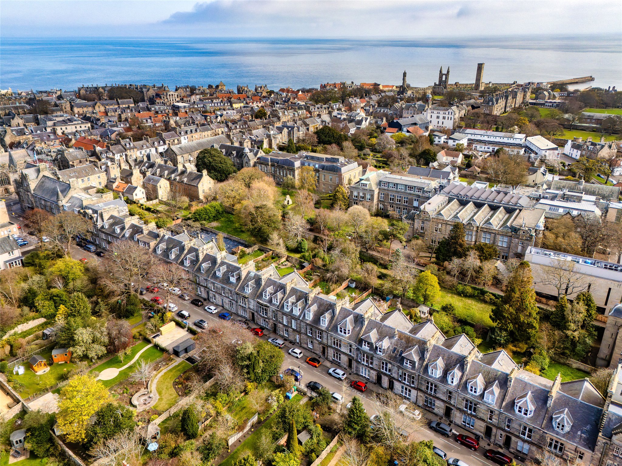 Occupying a prime position within St Andrew’s prestigious conservation area, Queen’s Gardens is just minutes from the bustling town centre, university, and the Old Course. Scotland’s world-famous home of golf and the site of the country's oldest university, St Andrews is a thriving town catering to students, golfers, and residents alike. There is an array of shops and amenities to meet daily needs including boutique and independent retailers selling artisan produce and goods such as St Andrews Bakery, Mitchell’s Delicatessen, and Leuchars Quality Butchers through to well-known high street stores such as Sainsbury’s Local. Other popular retail destinations are Waterstones, Boots, and H&M. Thriving and cosmopolitan bars, restaurants, and cafès sit side-by-side offering fine dining through to casual lunches and drinks. Education at all levels is well-catered for. Positioned on the stunning east coast of Fife, St Andrews is the perfect location from which to explore the characterful fishing villages that make up this scenic part of Scotland including Anstruther, St Monans, Crail, and Pittenweem. Dundee to the north is a thirty-minute drive and Edinburgh to the south is approx. 90 minutes by car or just over an hour by train from Leuchars.