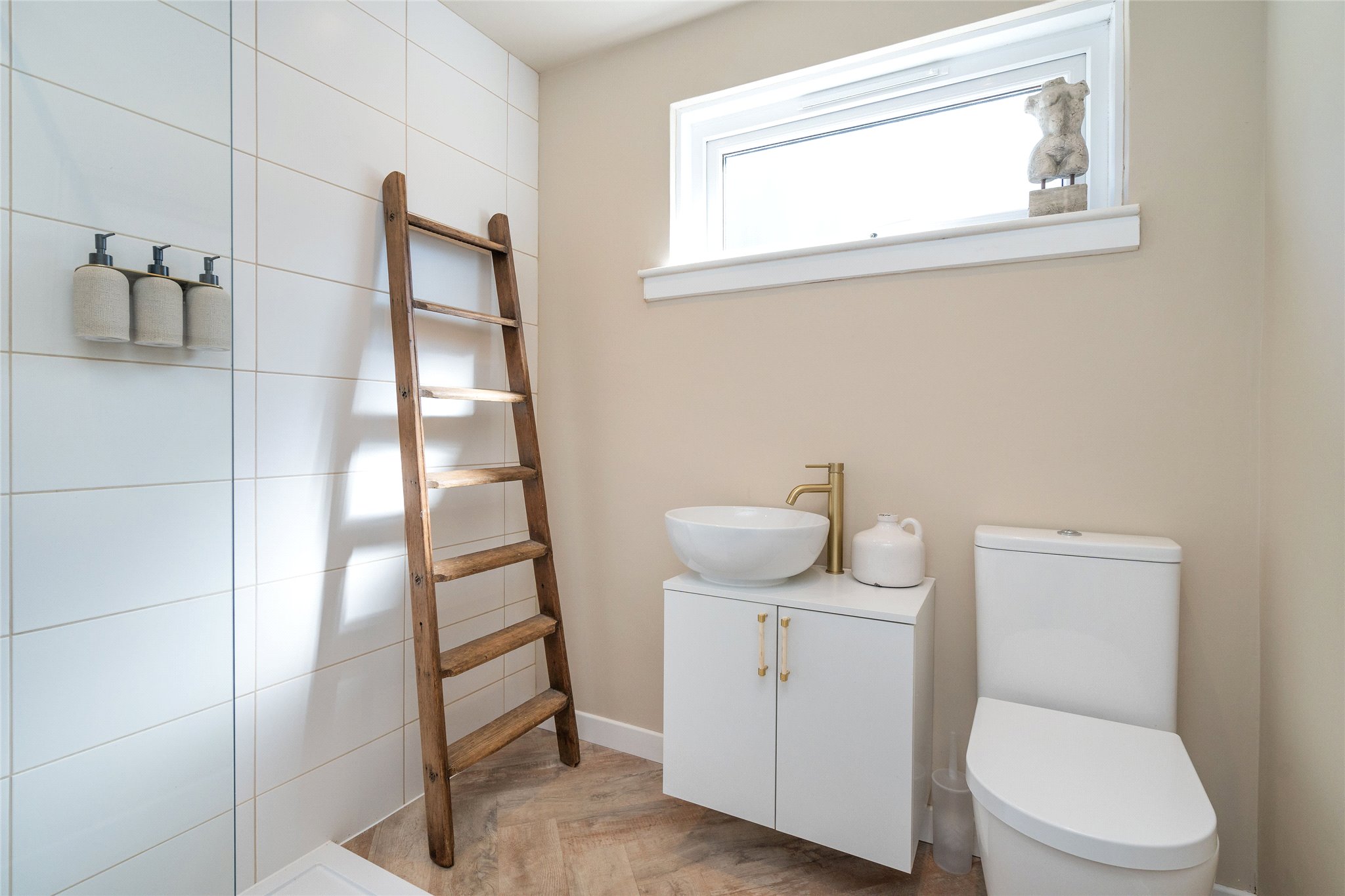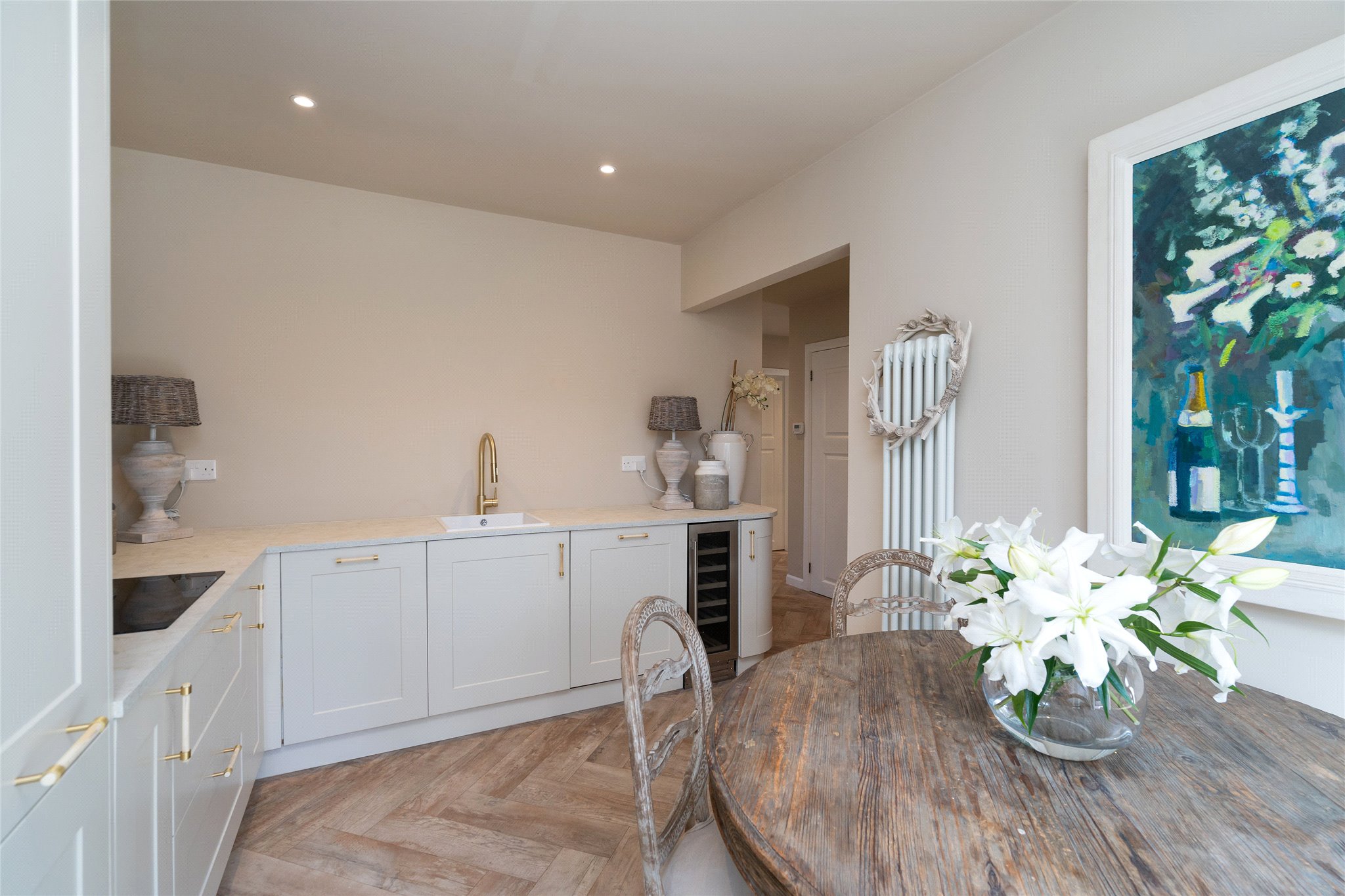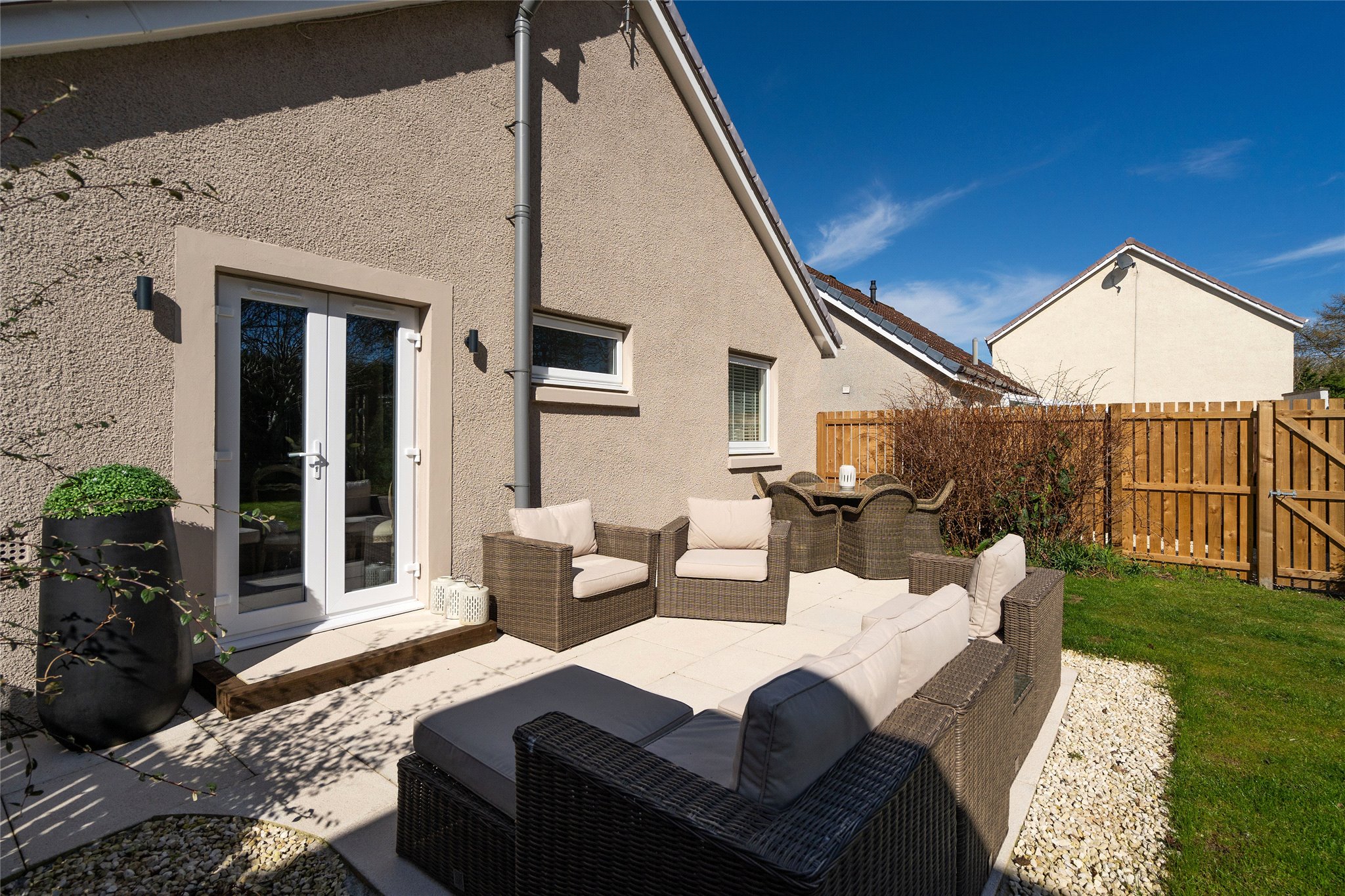 Beautifully presented with high-spec and luxurious fixtures and finishes, a timeless interior design, and plentiful natural light, this three-bedroom bungalow within easy reach of St Andrews town centre, presents a rare opportunity. A gravel driveway bordering a neat manicured lawn with established plants leads to the front door. Stepping inside, an elegantly decorated hallway sets the tone for the home’s stylish interiors, with warm neutral wall finishes and classic parquet flooring. To the right, a west-facing living room is bathed in natural light from a large picture window overlooking the front garden. Plush carpeting, a serene colour palette, and ambient lighting create a welcoming atmosphere, while the spacious layout allows for versatile furniture arrangements, making it an ideal space to unwind. Across the hallway, a stunning contemporary dining kitchen awaits, featuring French doors that open onto the south-east-facing rear garden. Continuing the parquet flooring from the hallway, the kitchen is adorned with bespoke white cabinetry, accented by gold-effect hardware and sleek white marble-effect worktops. High-spec integrated appliances including a wine fridge, hob, eye-level grill, and oven only enhance the aesthetic appeal. A separate utility room provides additional storage. The principal double bedroom is a luxurious retreat, filled with natural light and decorated in soft, neutral hues. Adding to its indulgence, a freestanding bath offers a spa-like sanctuary within the room. Completing the ground floor accommodation are two light and airy double bedrooms, one with built-in wardrobes, and a stunning design-led shower room featuring a circular countertop washbasin and WC. The property benefits from an attic