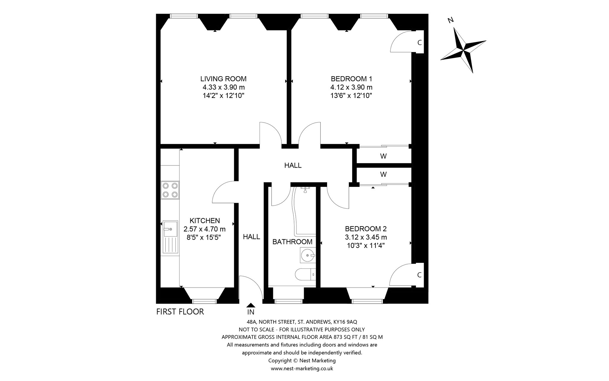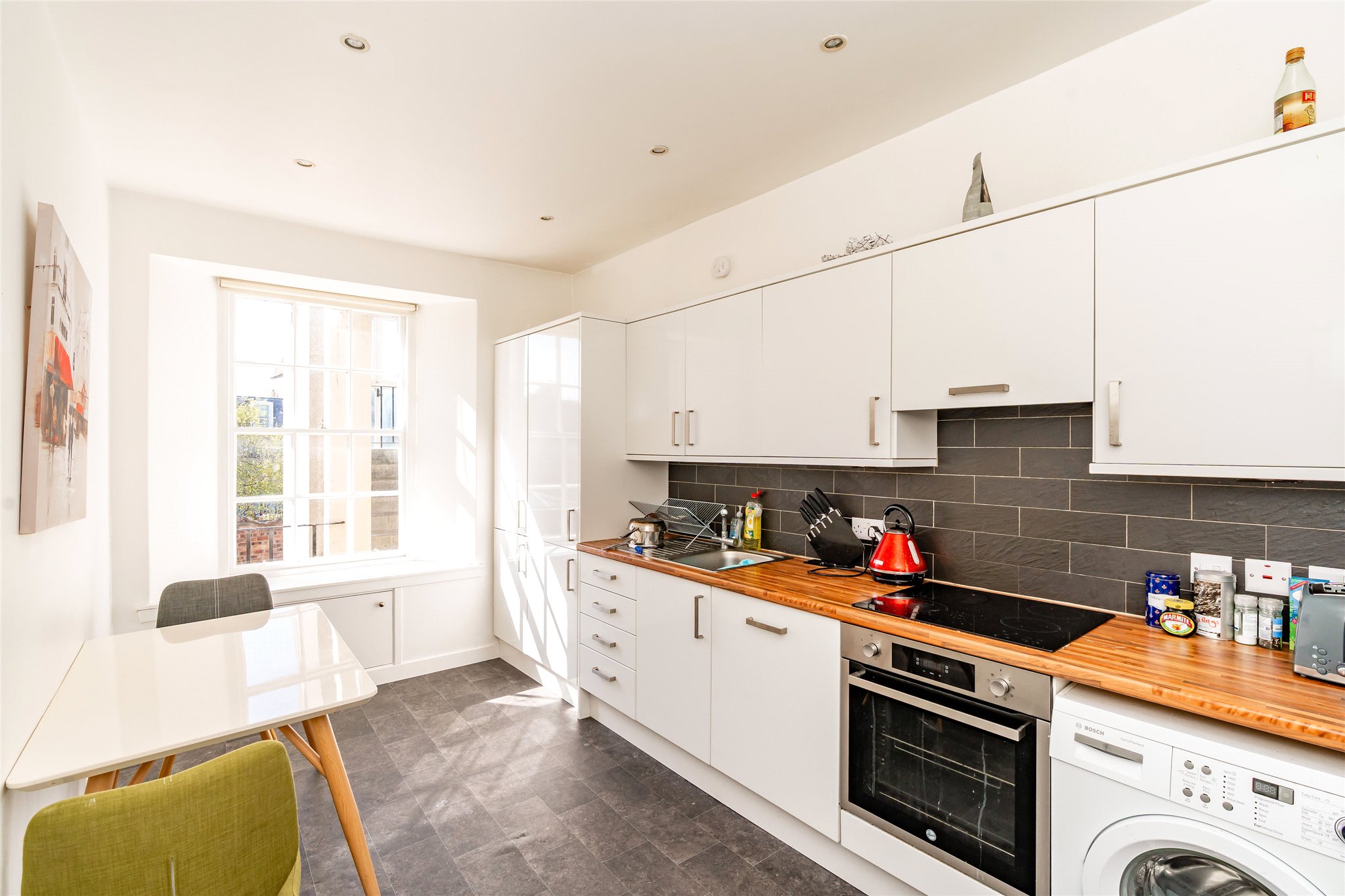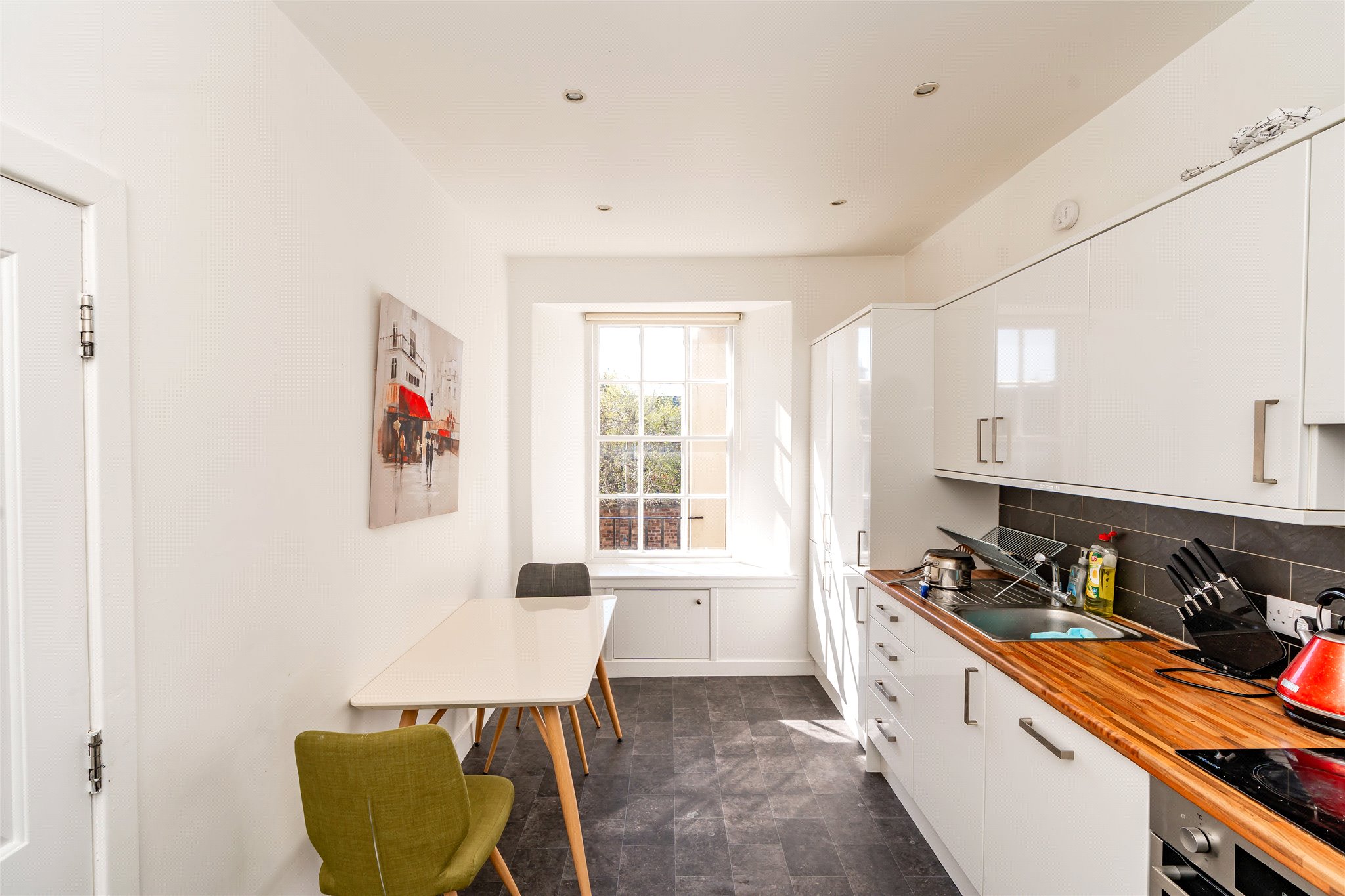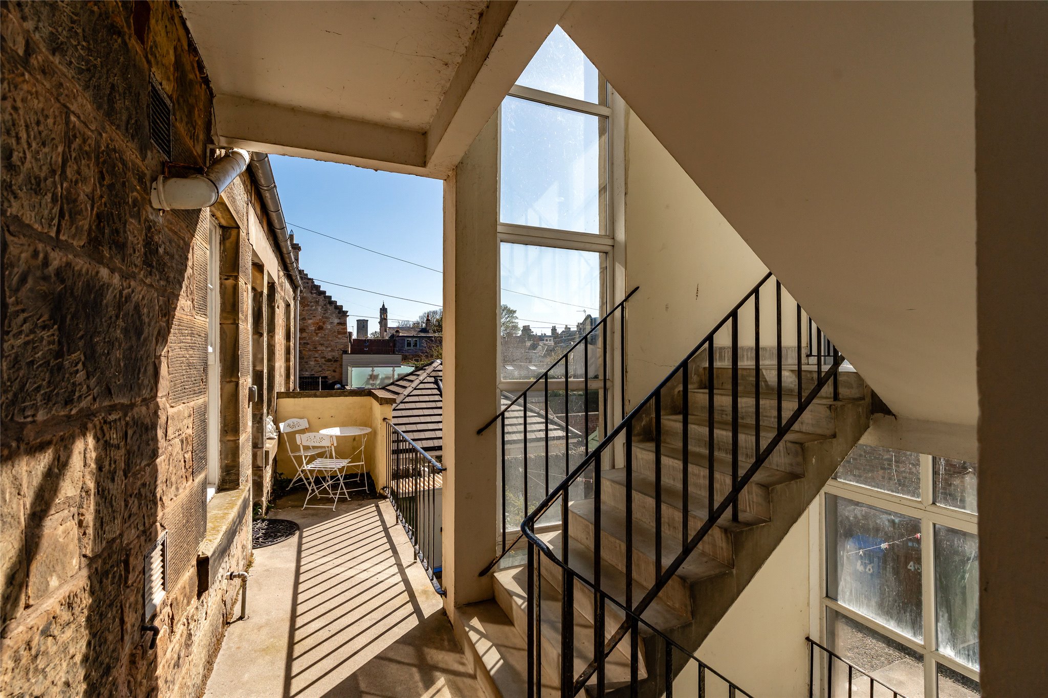 Constructed circa 1830 and category C listed, 48A North Street is an outstanding bright spacious two bed first floor apartment in a charming period building right in the heart of the town. Behind the beautiful stone / slate façade a vennel / close gives access from the street through to the shared rear drying green and external rear stair, which provides access to the upper floors in the building. Accessed off a useful small balcony / platform the fresh well-presented accommodation is deceptively spacious and very bright, with light flooding in both front and back. The main sitting room is of a good size and well-proportioned with two large windows looking out over North Street to the university buildings opposite. There are two double bedrooms both with good storage, with a good-sized bathroom and generous well-appointed kitchen completing the accommodation.