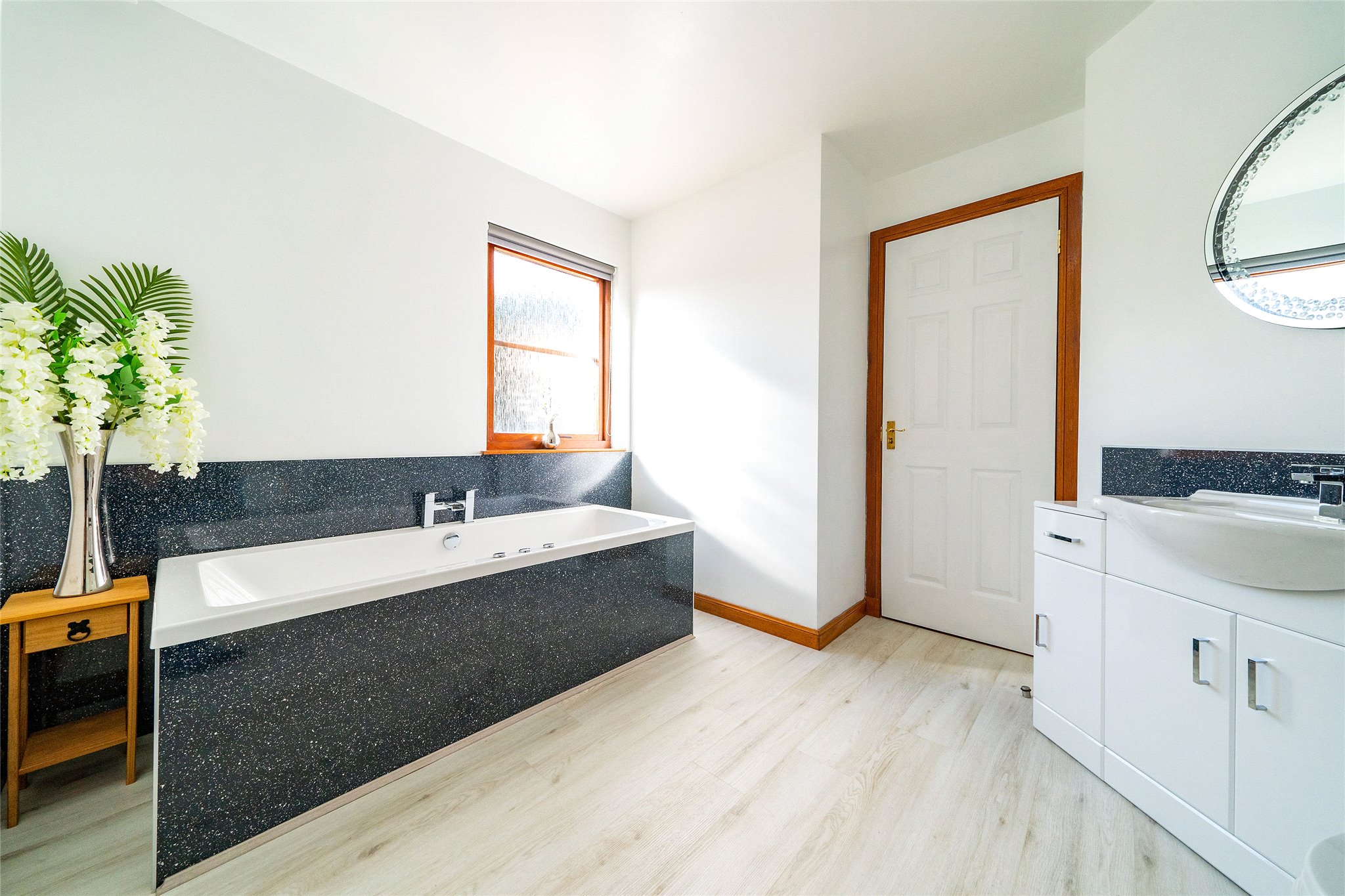 Occupying a superb position in the sought-after village of Lower Largo just minutes from its scenic beach and harbour, this well-presented five-bedroom detached family home complete with gardens and off-street parking presents a rare opportunity. Peacefully nestled on a no-through road in the shadow of the Lower Largo Viaduct, a neatly manicured lawn and driveway frame a pathway that leads to the front door of this impressive property. Stepping inside, a welcoming hallway guides you up a small set of stairs where double doors open into an impressive living and dining room. Bathed in natural light from large south-west-facing windows overlooking the front garden and boasting generous proportions, it is perfect for entertaining or unwinding with friends and family. Elegant French doors in the adjoining dining area open directly onto the rear garden, creating a seamless indoor-outdoor connection. Returning to the hallway, the stylish breakfasting kitchen showcases wood-effect cabinetry with under-base lighting complemented by smooth grey worktops and splashbacks. Integrated appliances include a high-spec Flavel range cooker and extractor hood. A separate utility room, with direct garden access, provides additional storage and convenience. Also located on this floor is a bright and good-sized double bedroom, alongside a luxurious family bathroom featuring a double shower enclosure, chrome towel radiator, washbasin built into vanity, hidden cistern WC, and a jacuzzi bath. Upstairs, the principal bedroom is a true standout. Incredibly spacious, it features plush carpeting, dual built-in wardrobes, and a skylit en-suite shower room fitted with a double enclosure, washbasin built into vanity, WC, and chrome towel radiator. Three further sizeable double bedrooms, all tastefully decorated complete the first floor. These share access to a contemporary shower room equipped with a WC, washbasin, and chrome towel radiator.