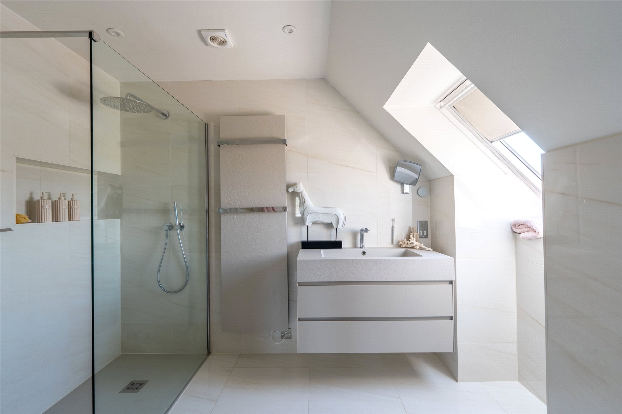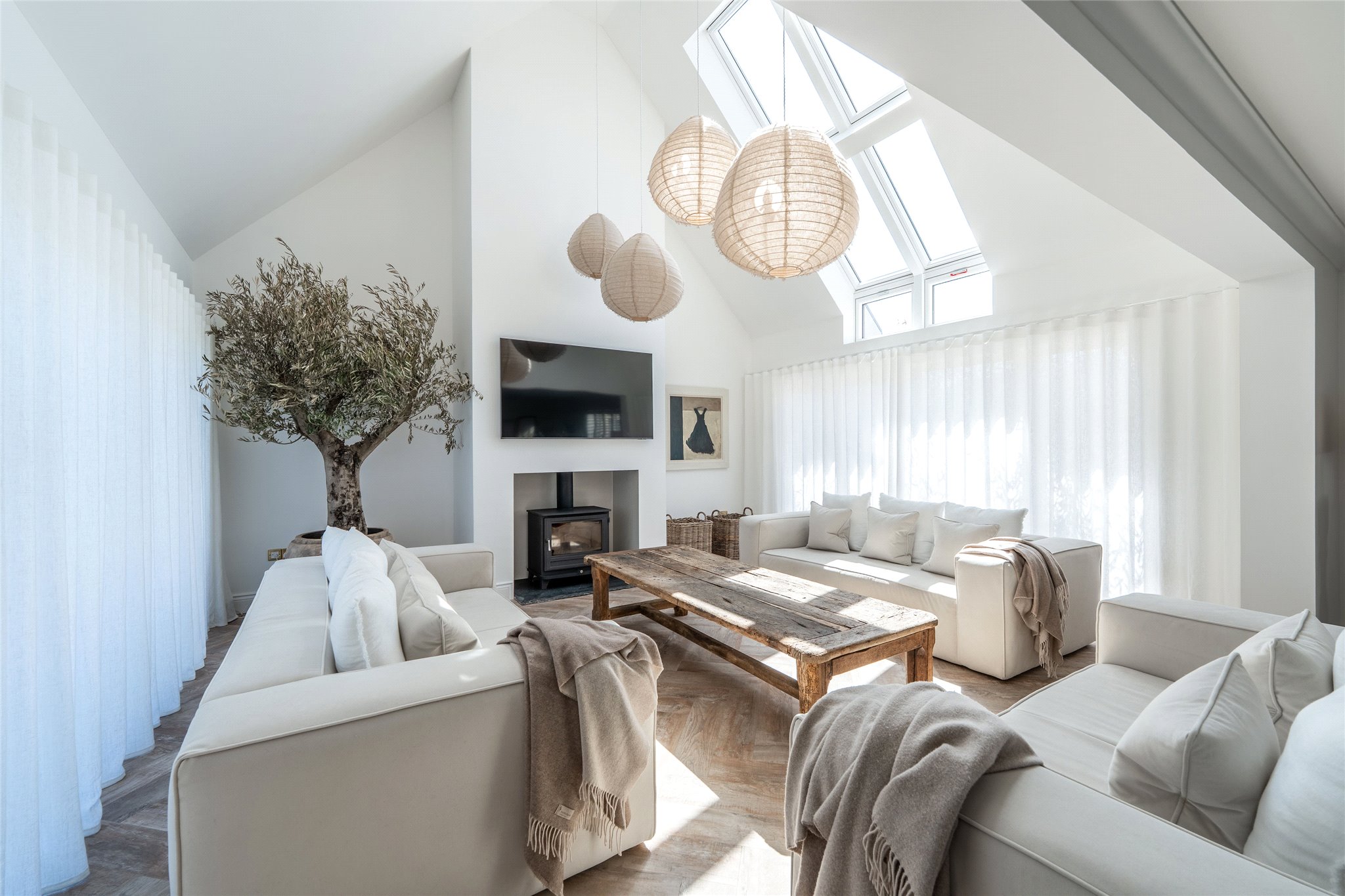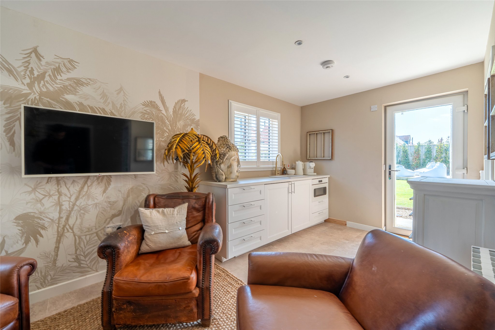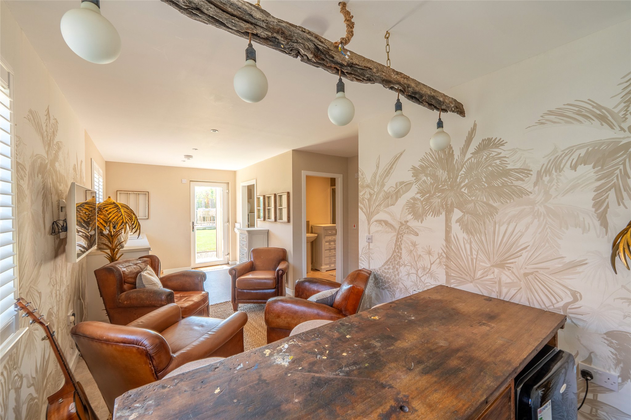 A highlight is the self-contained, timber-clad guest house, discreetly positioned behind raised sleeper beds. Thoughtfully designed, it comprises an open-plan living room and kitchen, two light and airy double bedrooms, and a modern shower room. Whether used to host visiting friends and family, or to provide a private retreat for older children, it offers superb flexibility and comfort.