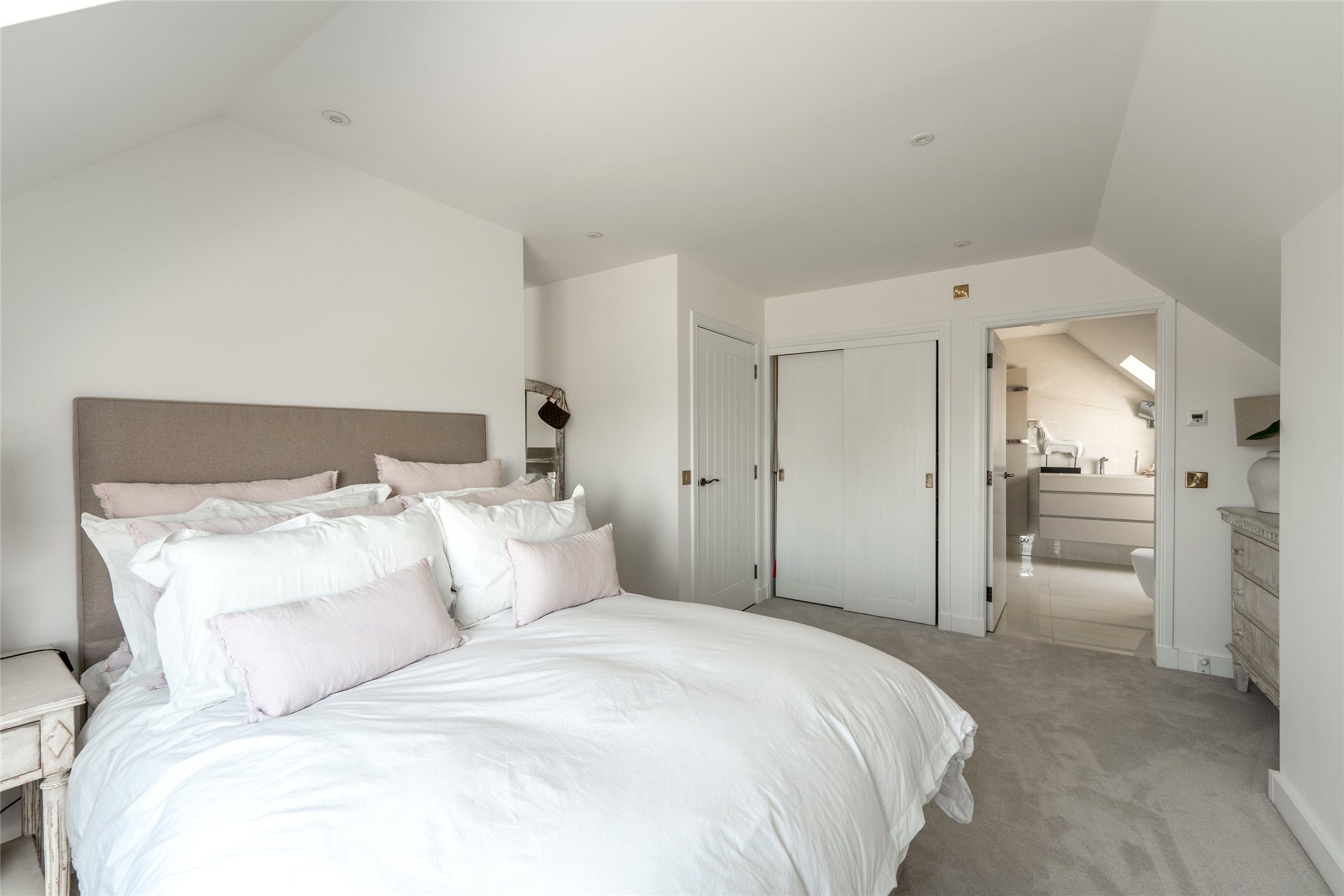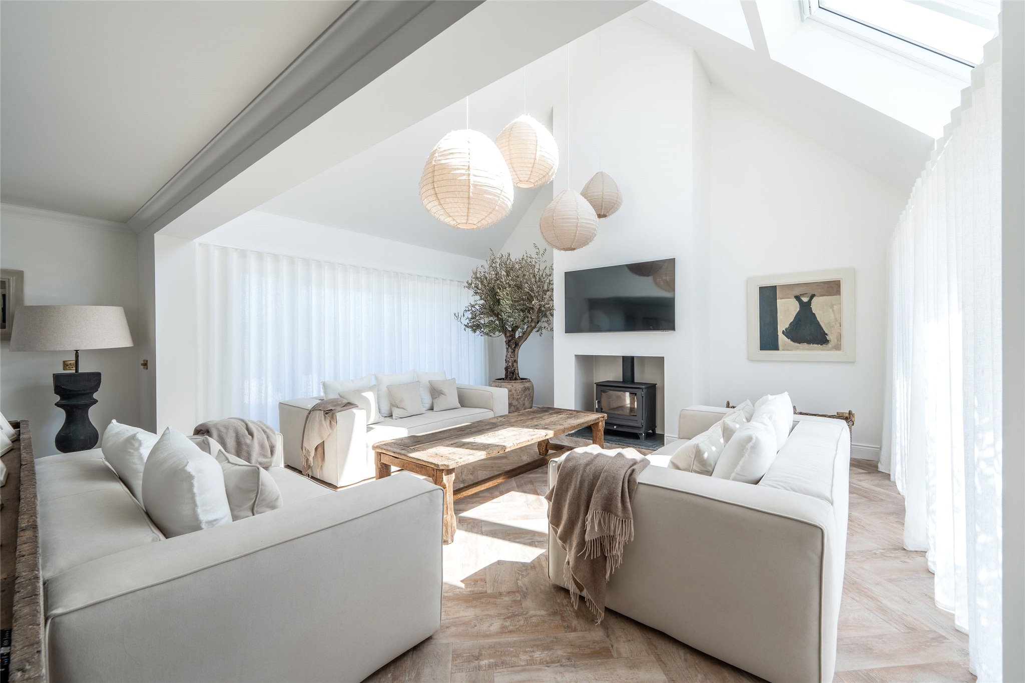 This beautifully presented Carridean Homes four-bedroom residence is a truly exceptional family home. Finished to an incredibly high standard its exquisite contemporary interior strikes the perfect balance between refined elegance and everyday comfort to create a residence that is as luxurious as it is warm and inviting. Framed by a sweeping driveway and neat front lawn, this remarkable home opens into a grand entrance vestibule and hallway adorned with parquet flooring, ambient lighting, and a crisp neutral palette, setting an elegant tone for the interiors beyond. To the right, glazed French doors reveal a captivating dual-aspect living and dining room. Featuring a soaring double-height ceiling, skylights, and sliding garden doors, this spectacular space is enhanced by parquet flooring, a log-burning stove, and louvred shutters. The result is a perfect blend of warmth and understated sophistication. Thoughtfully designed to function either as one expansive living and reception area or two distinct zones, as styled by the current owners, it offers excellent versatility. Across the hall, the west-facing dining kitchen provides an inviting setting for everyday living and entertaining. With direct access to the rear garden, it centres around a focal island with seating for four and handcrafted bespoke cabinetry in natural hues, complemented by white Silestone worktops. A suite of high-spec integrated appliances includes an induction hob, ceiling-mounted extractor, dishwasher, eye-level oven and grill, and American-style fridge/freezer. Bright and airy, the space with a light-filled and comfortable seating area is finished in fresh white tones and a continuation of the parquet flooring. A spacious utility room echoes the kitchen's design, offering additional storage and convenient access to the integrated double garage. Completing the array of reception areas is a versatile dual-aspect sitting room currently used as a home gym with sliding doors opening onto the garden. A guest WC by Peden & Pringle, featuring a TOTO remote-controlled washlet, completes the ground floor. The staircase, dressed in refined herringbone carpeting, leads to a light-filled first-floor landing and hallway. Here, three beautifully appointed double bedrooms await. The carpeted principal suite is a luxurious retreat, with built-in wardrobes and French doors opening to a west-facing Juliet balcony framing a freestanding bath. An underfloor heated en-suite shower room is exquisitely finished in porcelain tile, with a wall-hung hidden cistern TOTO washlet, integrated wall-hung vanity, ceramic towel rail, and an expansive Keuco ceiling-mounted rainfall shower. Two of the double bedrooms benefit from bespoke en-suite shower rooms, all executed to the same high standard. One features an enviable dressing room whilst another has been fitted with custom-made cabinetry. Designed with modern comfort and efficiency in mind, the home is further enhanced by high-spec conference telecoms and a dedicated internet line ideal for home working.