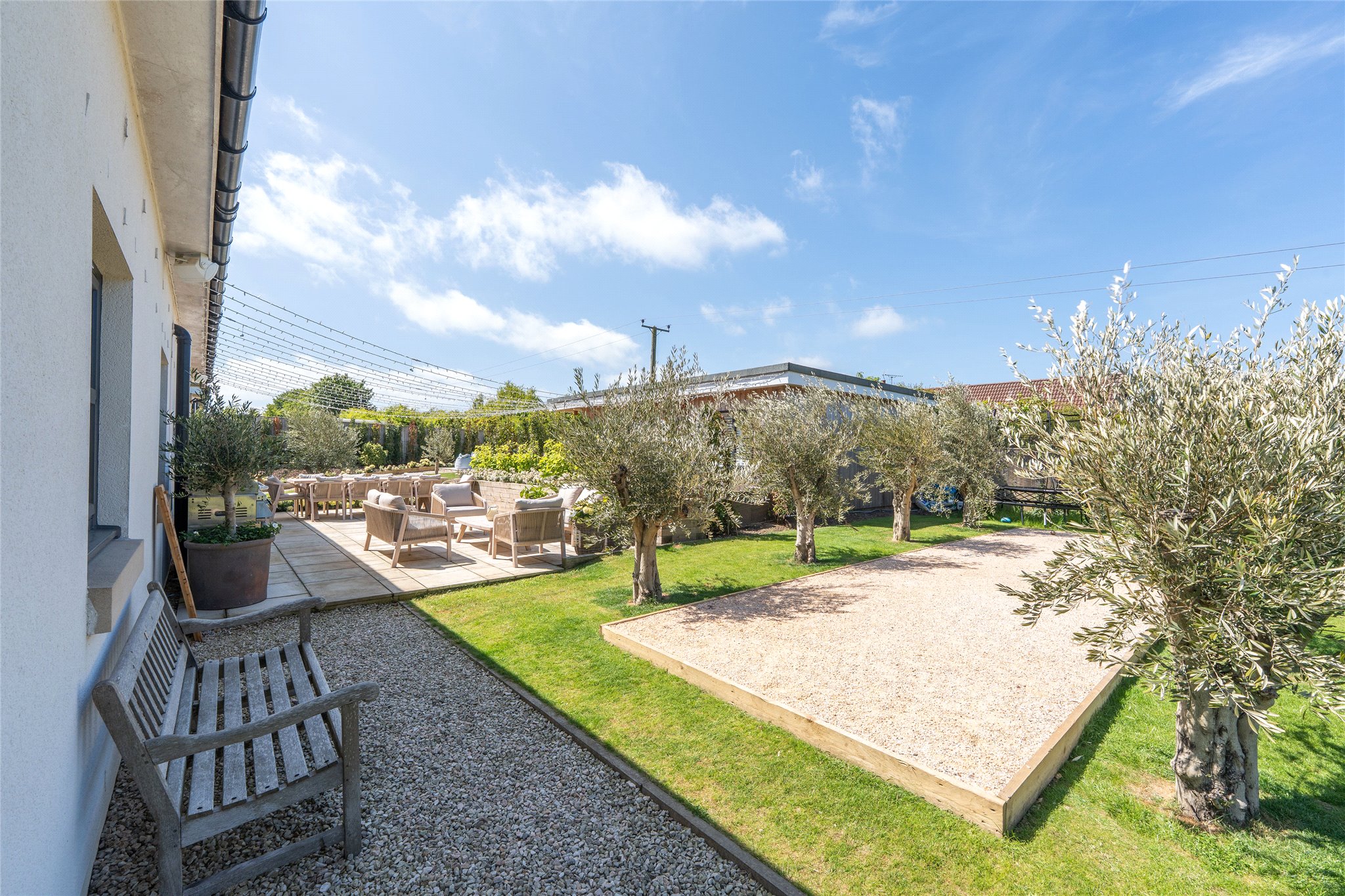 At its heart lies a manicured lawn, complemented by a bespoke garden boules court framed by olive trees. Three expansive alfresco seating areas, laid in luxurious sandstone paving, provide perfect sun-soaked spots for dining, lounging, and memorable gatherings.