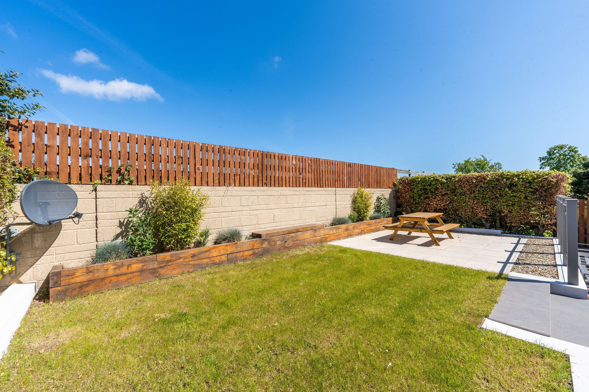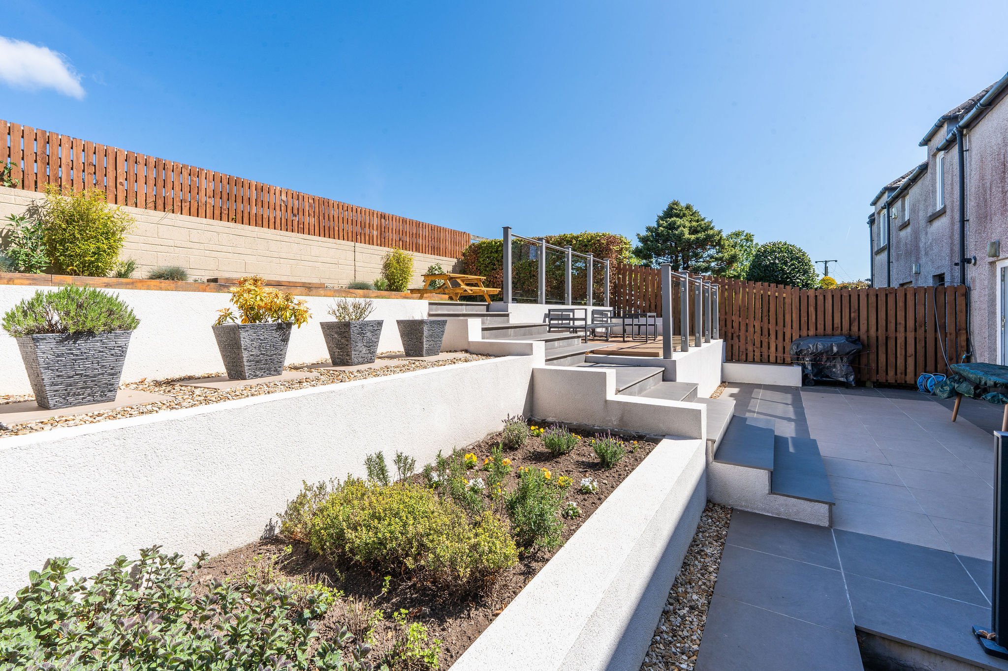 The private, enclosed rear garden has been thoughtfully landscaped to create multiple