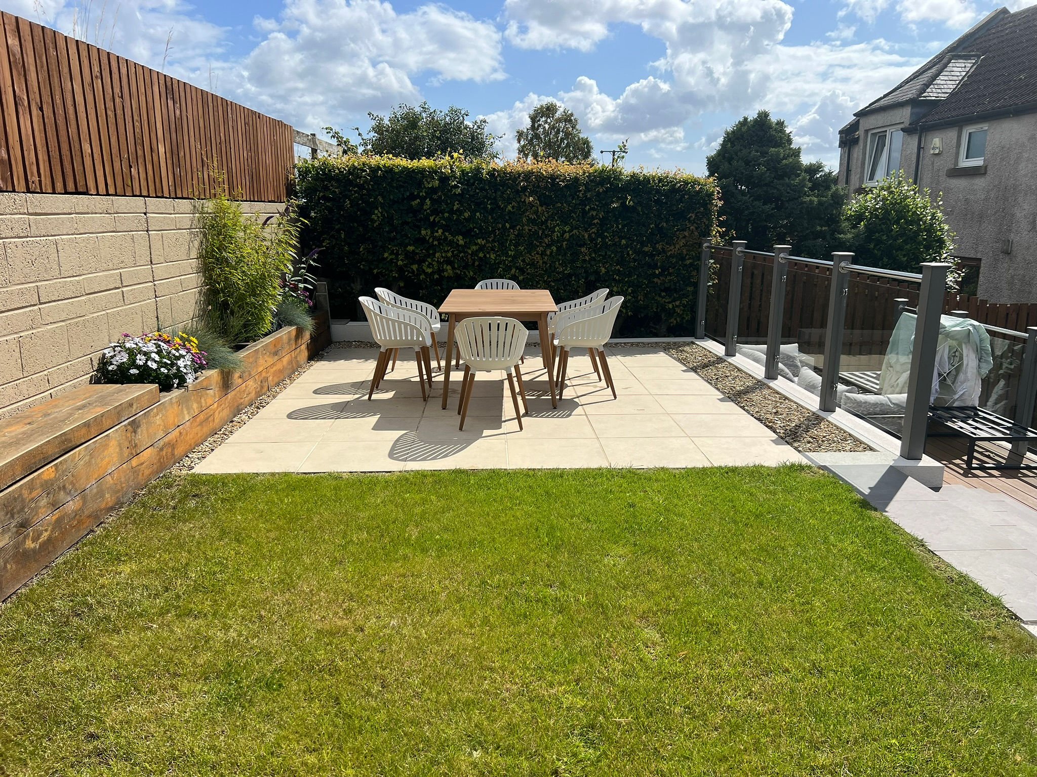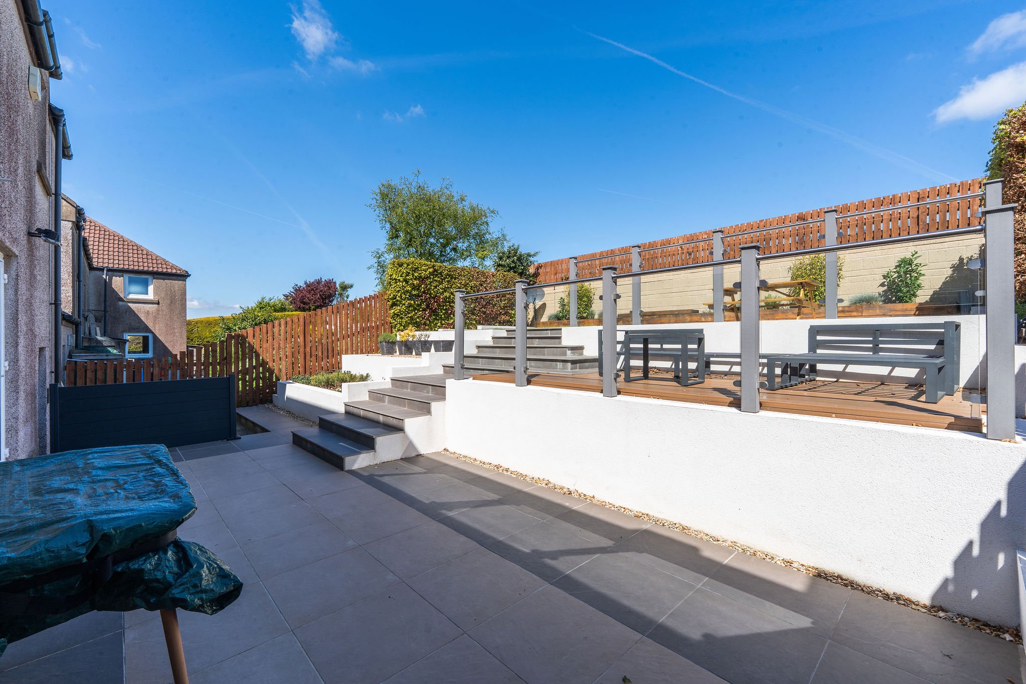 steps to two elevated seating areas, one laid to weatherproof composite decking with a glass balustrade, and the other combining porcelain tiling and lawn, perfect for alfresco dining or peaceful relaxation.