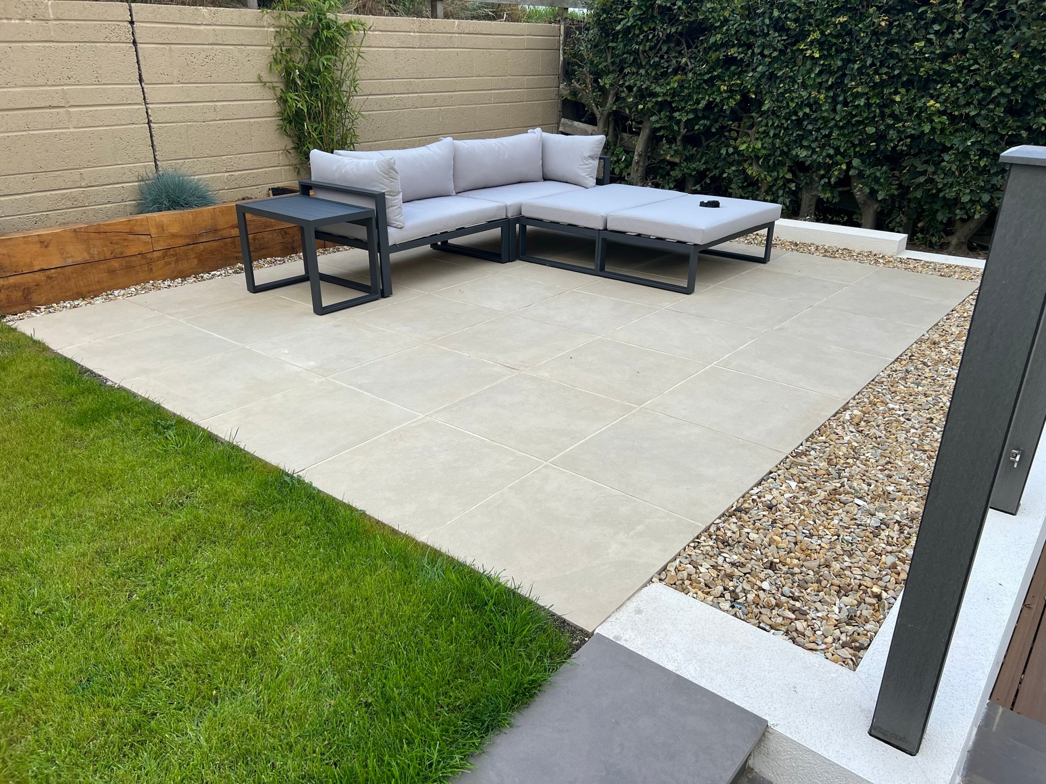 inviting outdoor spaces. A patio with fully laid porcelain outdoor tiling leads via planted
