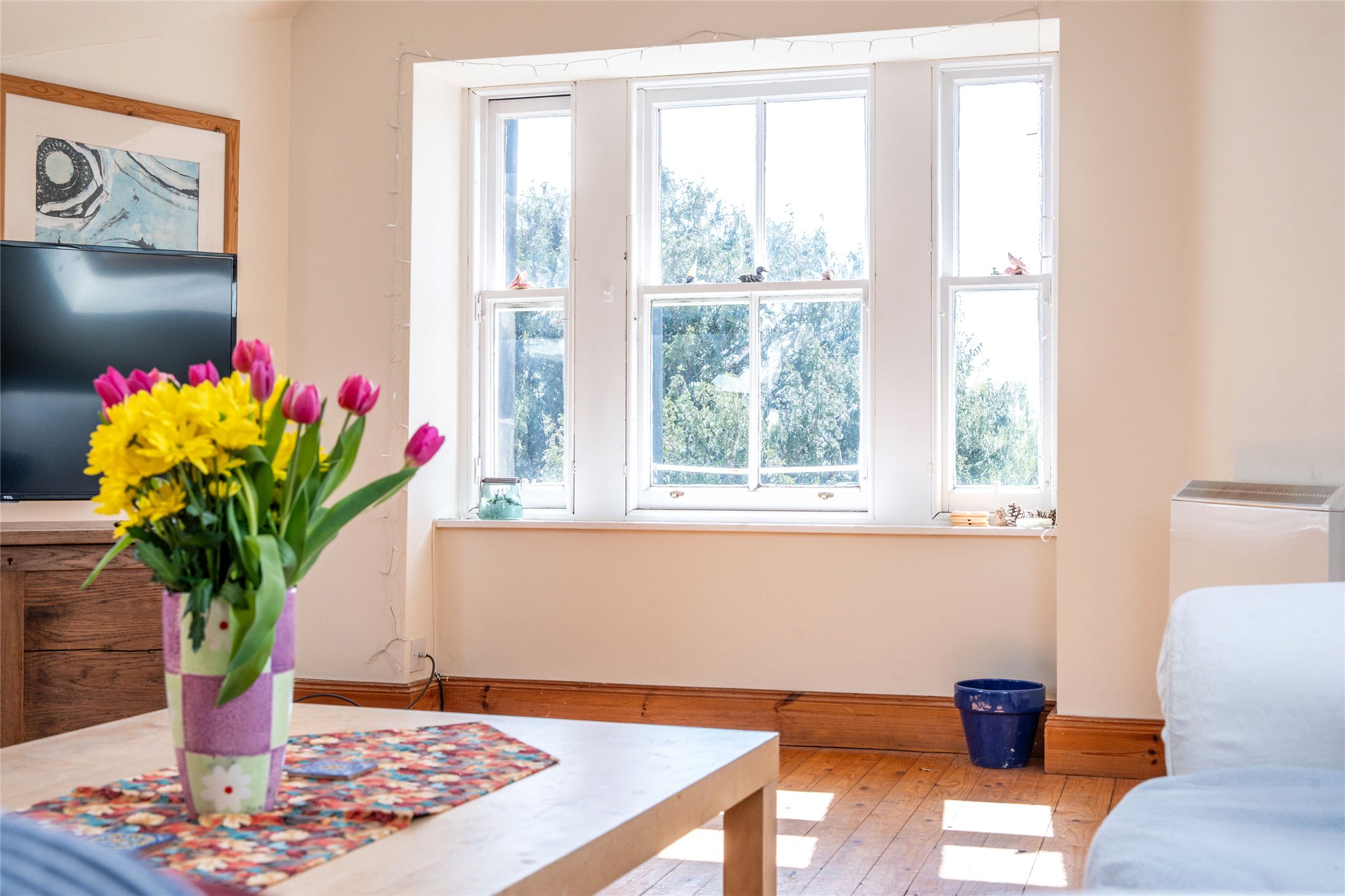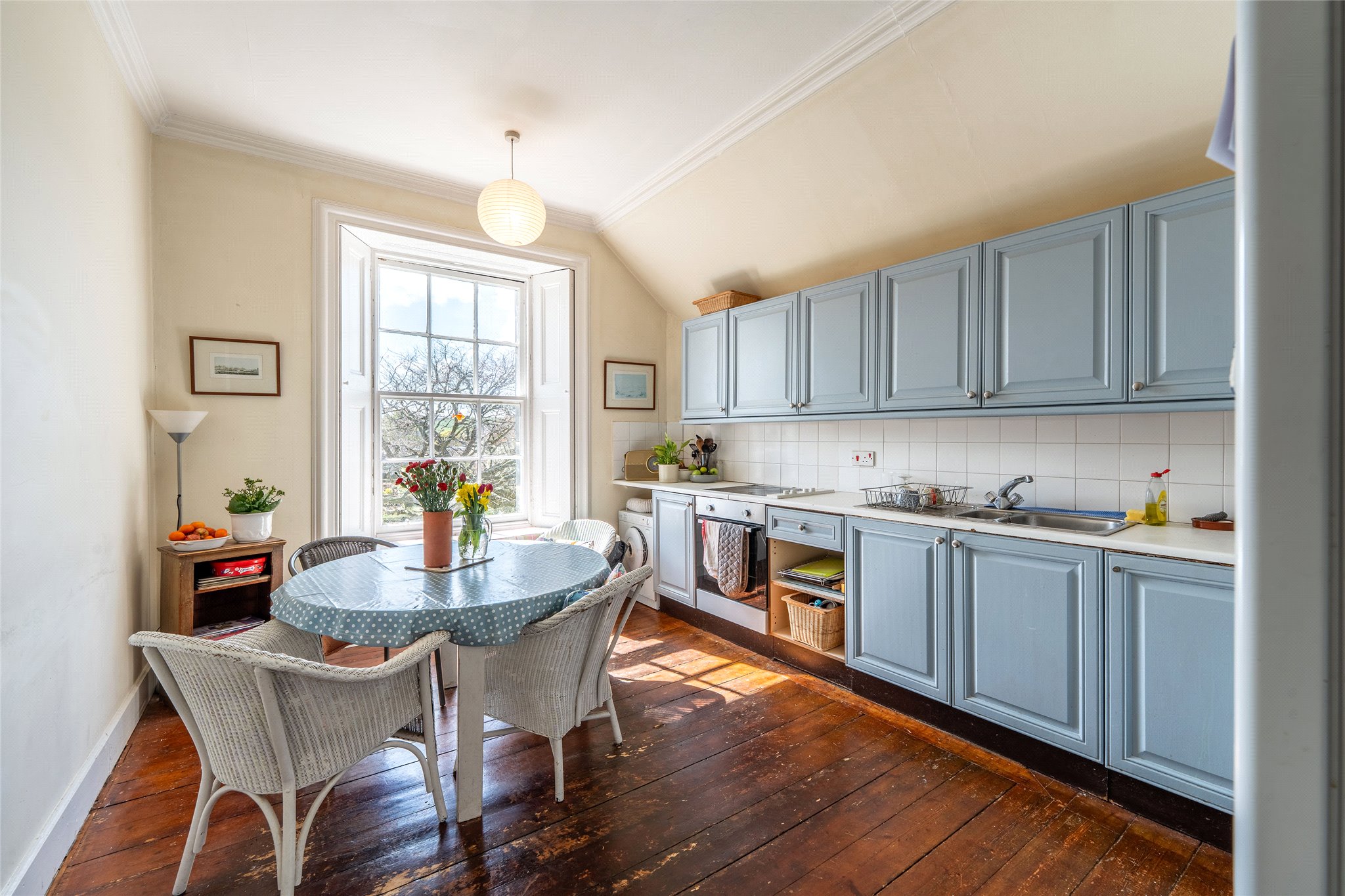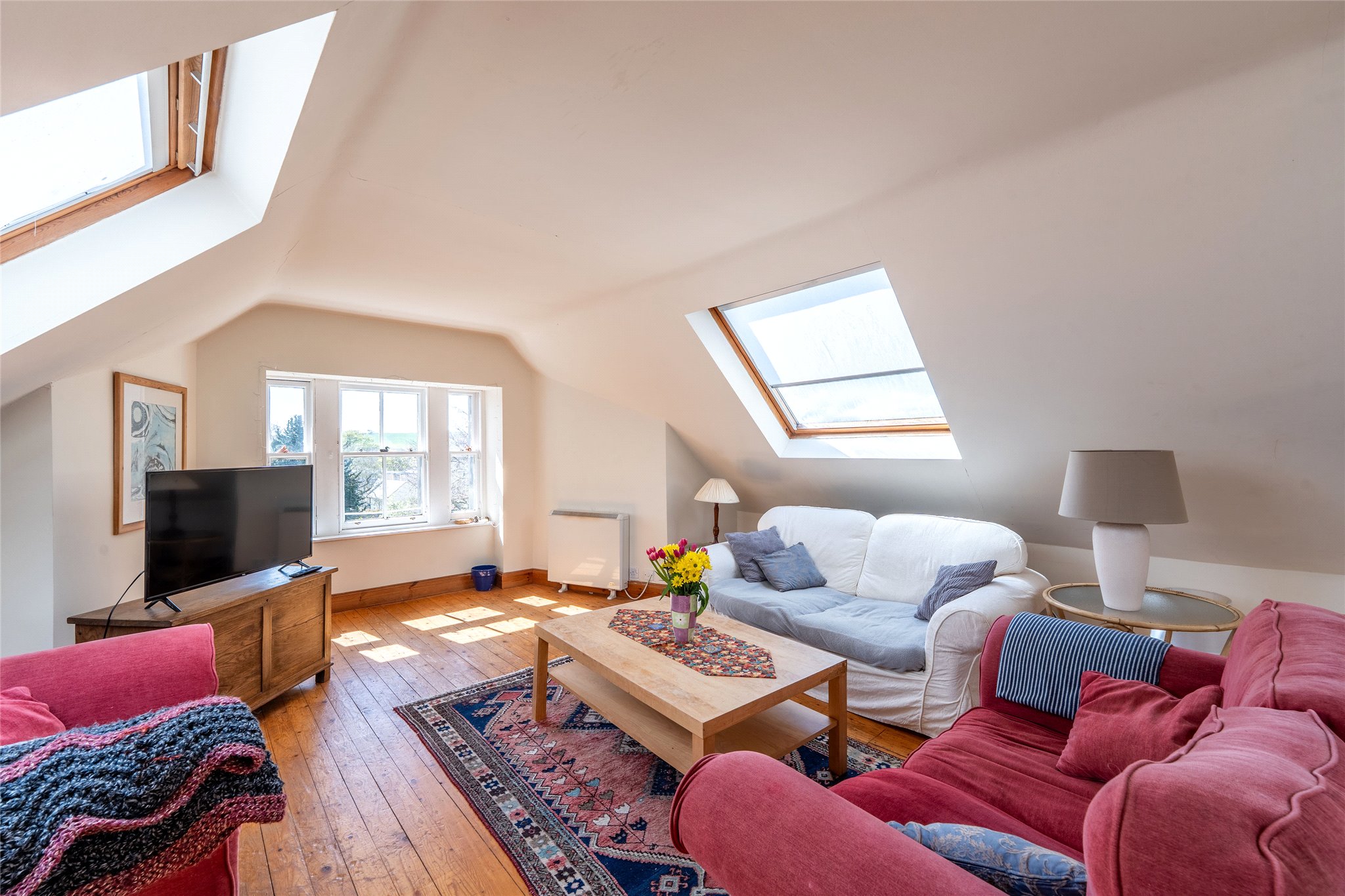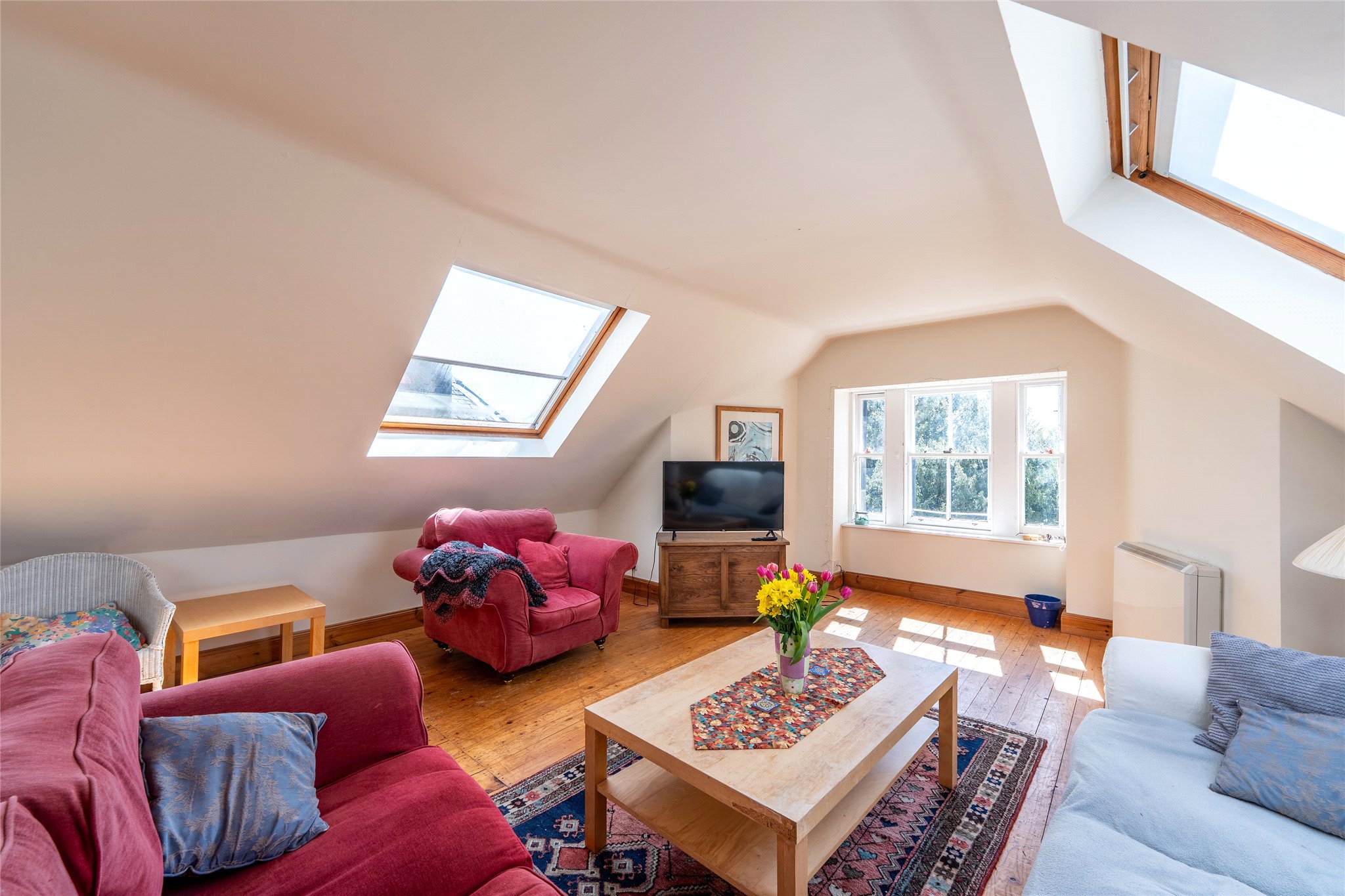 Occupying the third floor of a handsome B-listed building dating back to the mid-19th century and set in the heart of St Andrews, this is an impressive two-bedroom apartment enjoying a spacious light-filled interior and combining modern touches with fine period details. Accessed via a shared entrance vestibule and hallway adorned with original mosaic tiled flooring the front door opens into a generous, carpeted hallway. From here, a partially glazed door leads to a short flight of stairs ascending to an impressive living room. Boasting generous proportions and bathed in natural light from its southerly aspect and expansive VELUX windows, this inviting space offers a serene atmosphere, enhanced by a soft neutral décor and handsome wooden flooring. Returning to the hallway, the south-facing dining kitchen is equally appealing. Featuring an original sash and case window and wooden flooring, shaker-style units in a duck egg blue are complemented by a white tiled splashback, and smooth white worktops whilst integrated appliances include a hob, oven, and extractor hood. Across the hall, two exceptionally spacious and bright carpeted double bedrooms each showcase original features including sash and case windows with working shutters, built-in storage, and striking open cast iron fireplaces. Completing the accommodation is a classically styled family bathroom equipped with a bath and wall-mounted shower, WC, cast-iron towel radiator, washbasin, and a charming window seat.