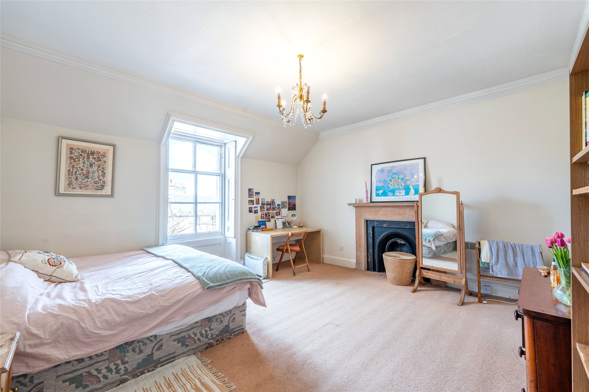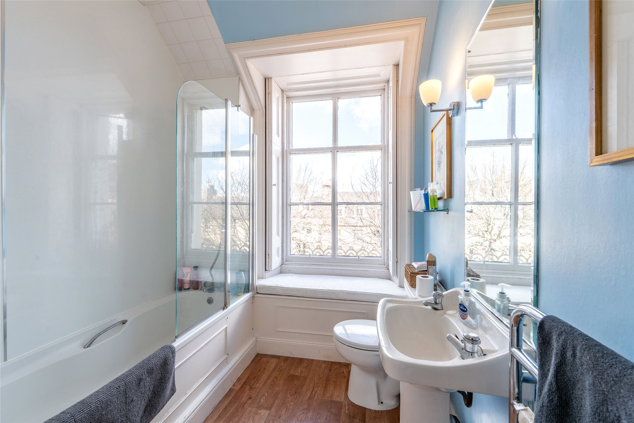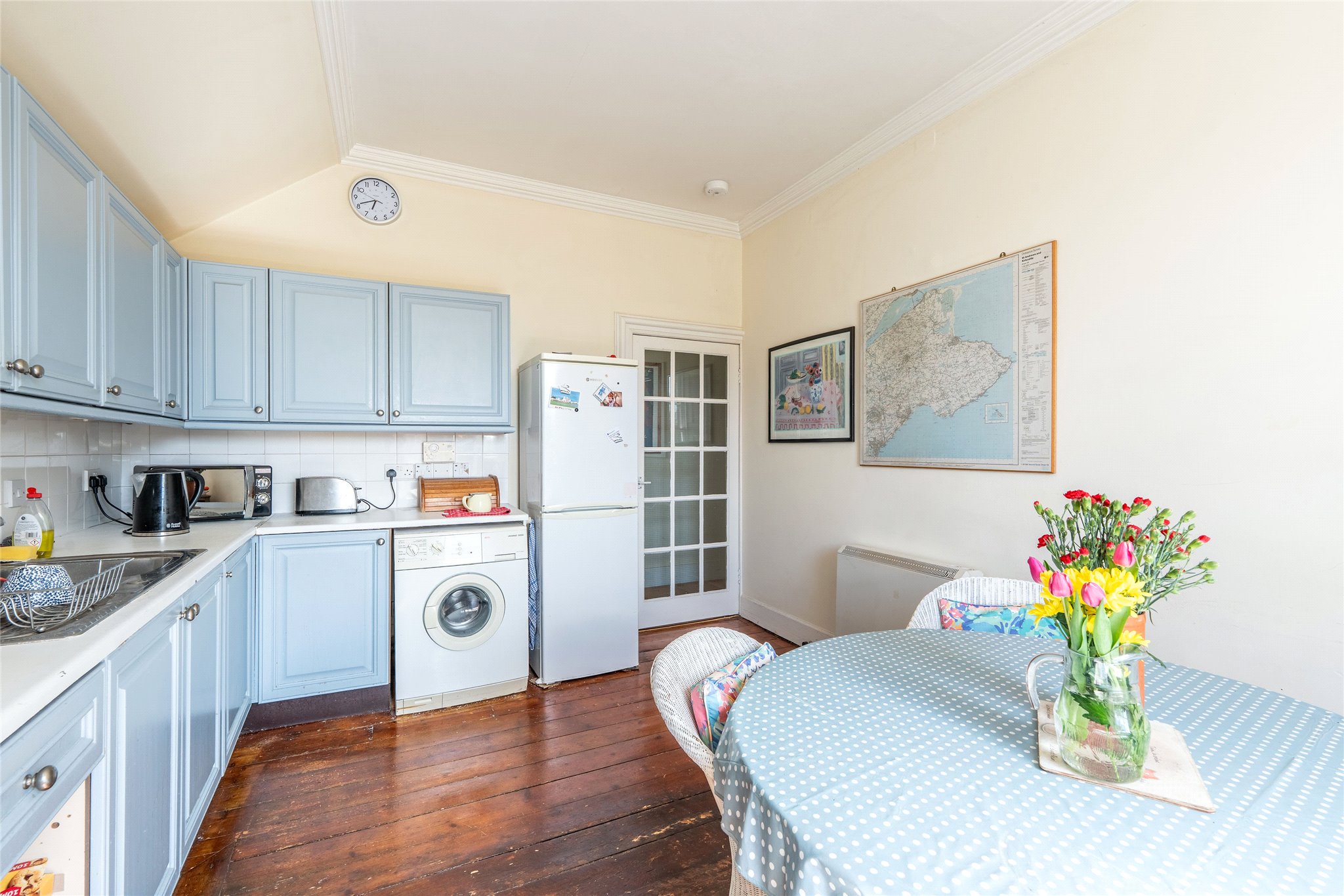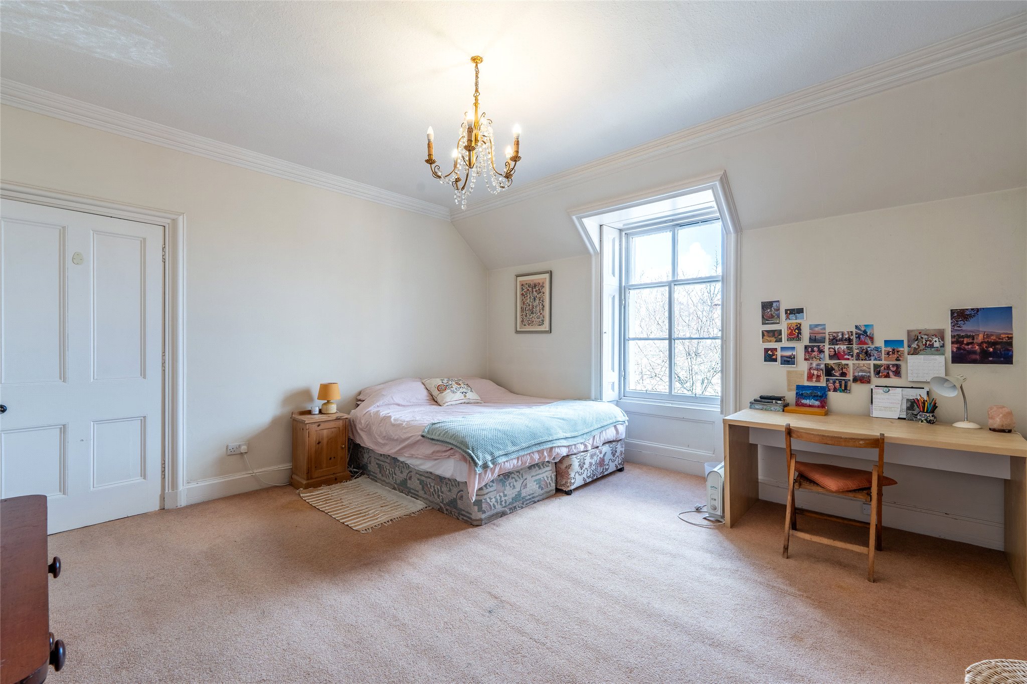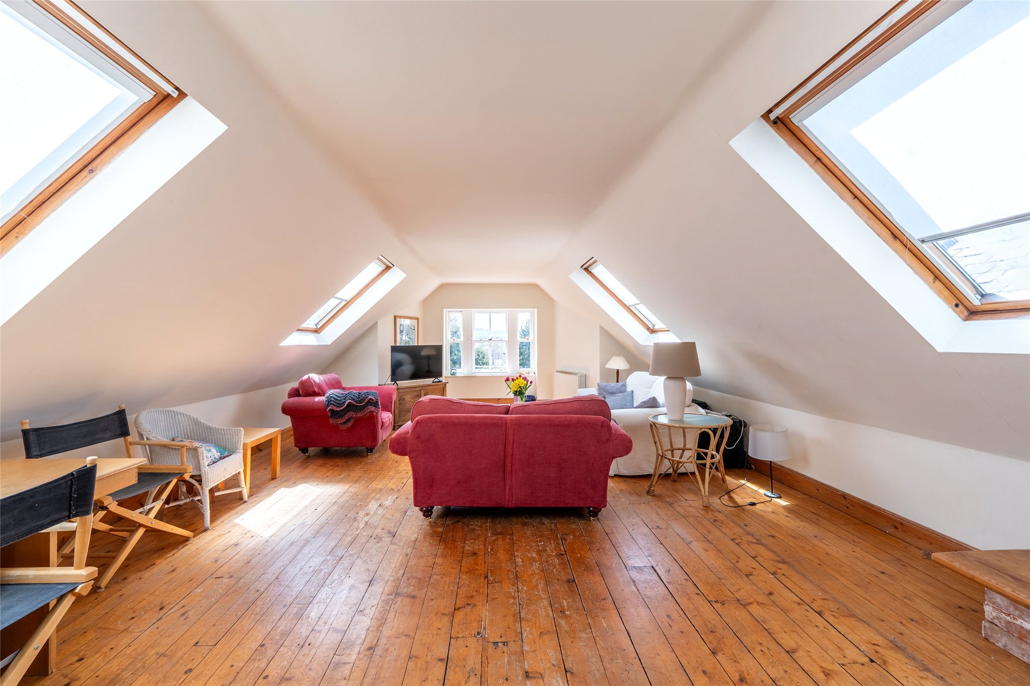 Occupying the third floor of a handsome B-listed building dating back to the mid-19th century and set in the heart of St Andrews, this is an impressive two-bedroom apartment enjoying a spacious light-filled interior and combining modern touches with fine period details. Accessed via a shared entrance vestibule and hallway adorned with original mosaic tiled flooring the front door opens into a generous, carpeted hallway. From here, a partially glazed door leads to a short flight of stairs ascending to an impressive living room. Boasting generous proportions and bathed in natural light from its southerly aspect and expansive VELUX windows, this inviting space offers a serene atmosphere, enhanced by a soft neutral décor and handsome wooden flooring. Returning to the hallway, the south-facing dining kitchen is equally appealing. Featuring an original sash and case window and wooden flooring, shaker-style units in a duck egg blue are complemented by a white tiled splashback, and smooth white worktops whilst integrated appliances include a hob, oven, and extractor hood. Across the hall, two exceptionally spacious and bright carpeted double bedrooms each showcase original features including sash and case windows with working shutters, built-in storage, and striking open cast iron fireplaces. Completing the accommodation is a classically styled family bathroom equipped with a bath and wall-mounted shower, WC, cast-iron towel radiator, washbasin, and a charming window seat.