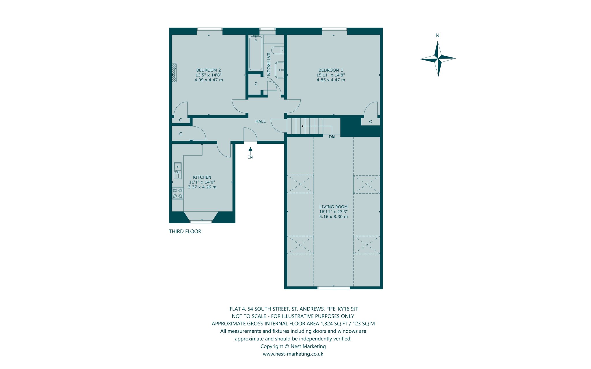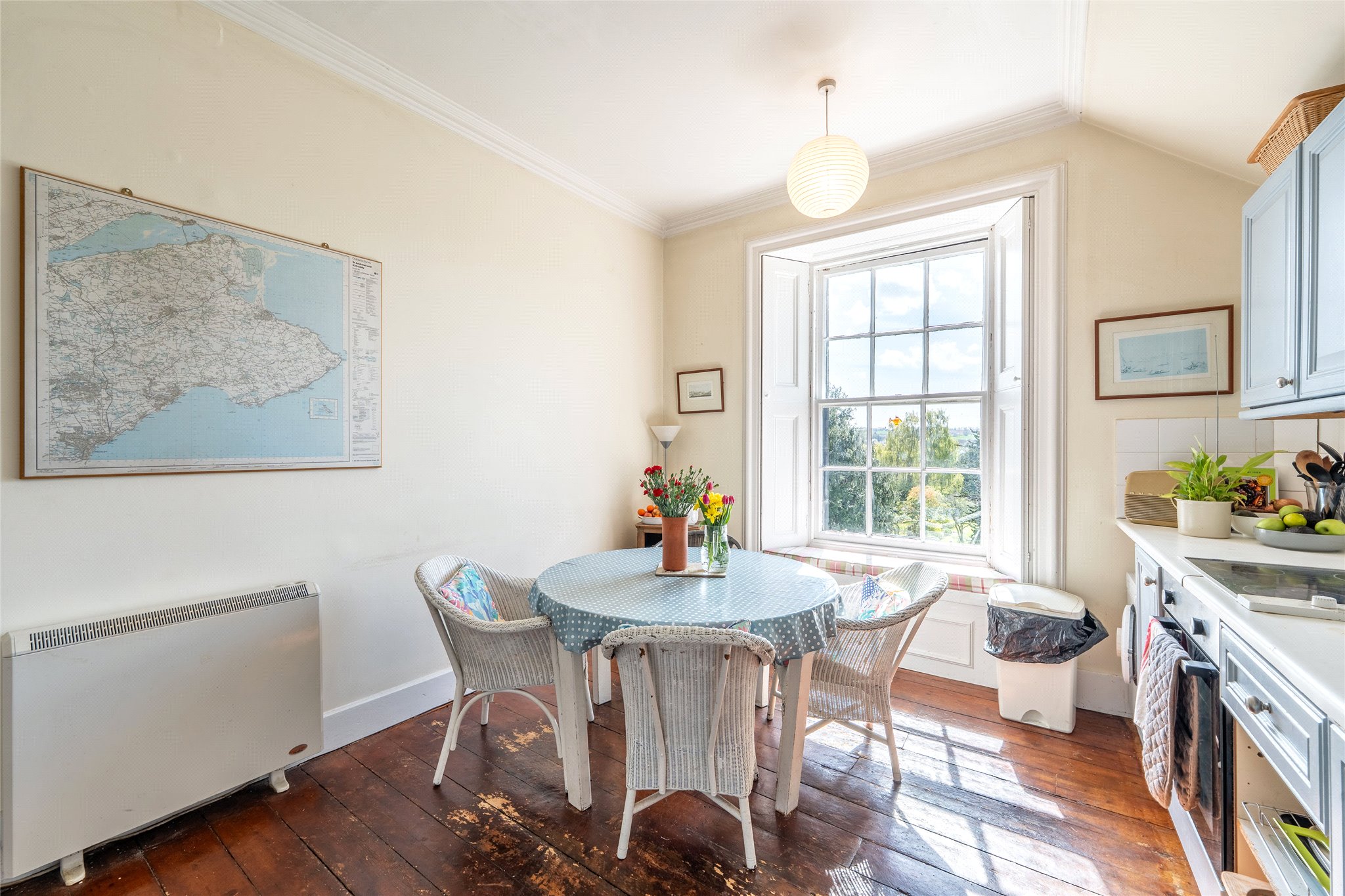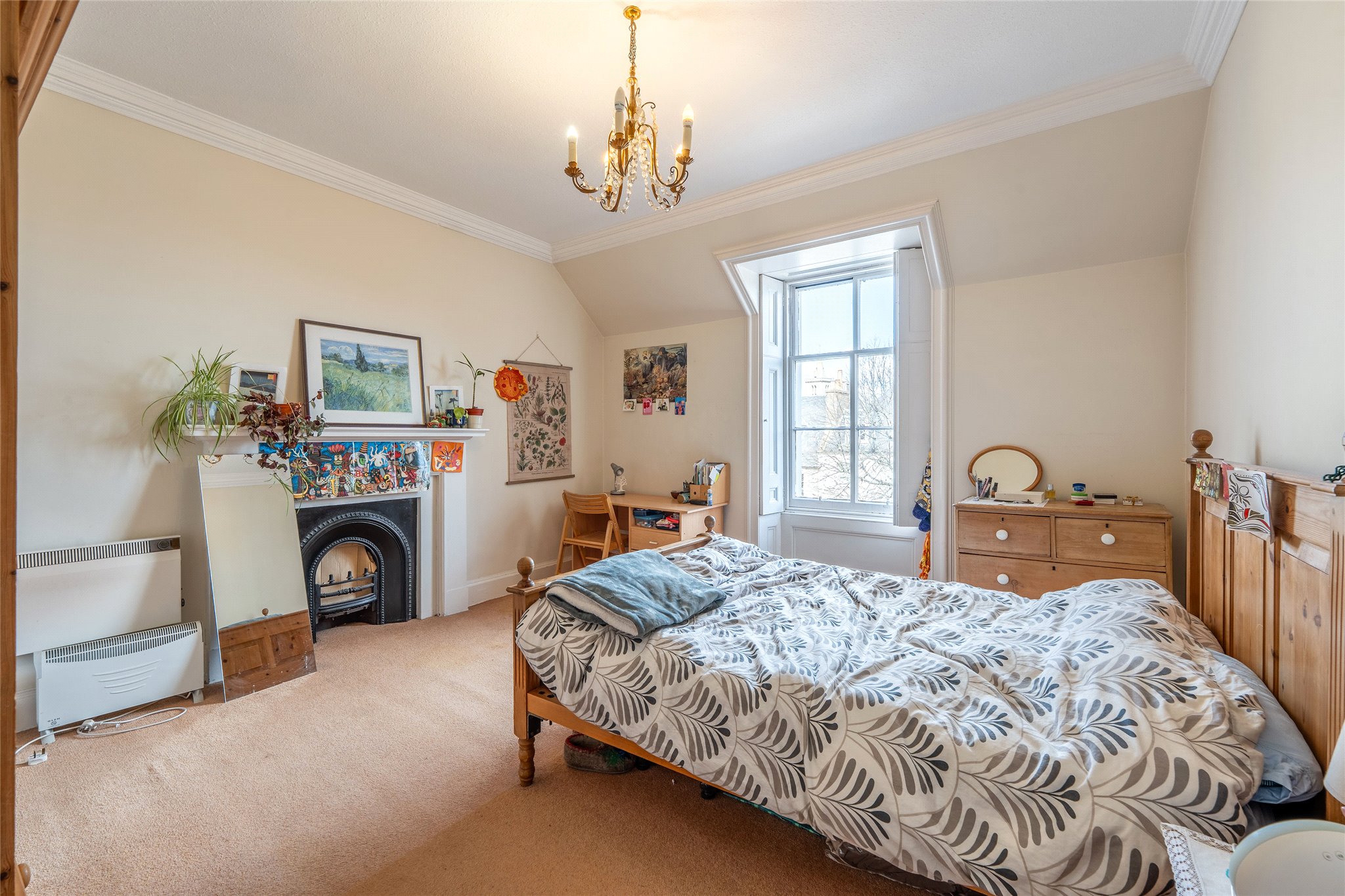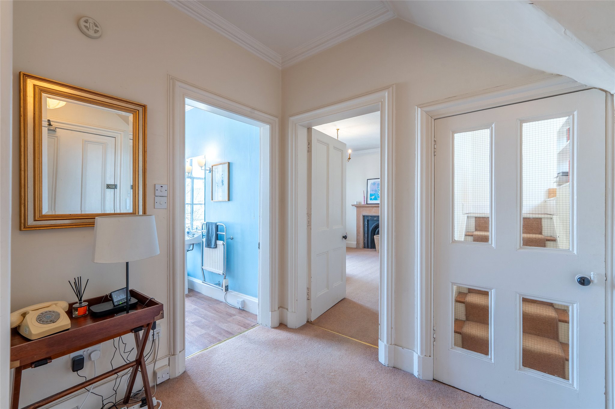 Occupying the third floor of a handsome B-listed building dating back to the mid-19th century and set in the heart of St Andrews, this is an impressive two-bedroom apartment enjoying a spacious light-filled interior and combining modern touches with fine period details. Accessed via a shared entrance vestibule and hallway adorned with original mosaic tiled flooring the front door opens into a generous, carpeted hallway. From here, a partially glazed door leads to a short flight of stairs ascending to an impressive living room. Boasting generous proportions and bathed in natural light from its southerly aspect and expansive VELUX windows, this inviting space offers a serene atmosphere, enhanced by a soft neutral décor and handsome wooden flooring. Returning to the hallway, the south-facing dining kitchen is equally appealing. Featuring an original sash and case window and wooden flooring, shaker-style units in a duck egg blue are complemented by a white tiled splashback, and smooth white worktops whilst integrated appliances include a hob, oven, and extractor hood. Across the hall, two exceptionally spacious and bright carpeted double bedrooms each showcase original features including sash and case windows with working shutters, built-in storage, and striking open cast iron fireplaces. Completing the accommodation is a classically styled family bathroom equipped with a bath and wall-mounted shower, WC, cast-iron towel radiator, washbasin, and a charming window seat.