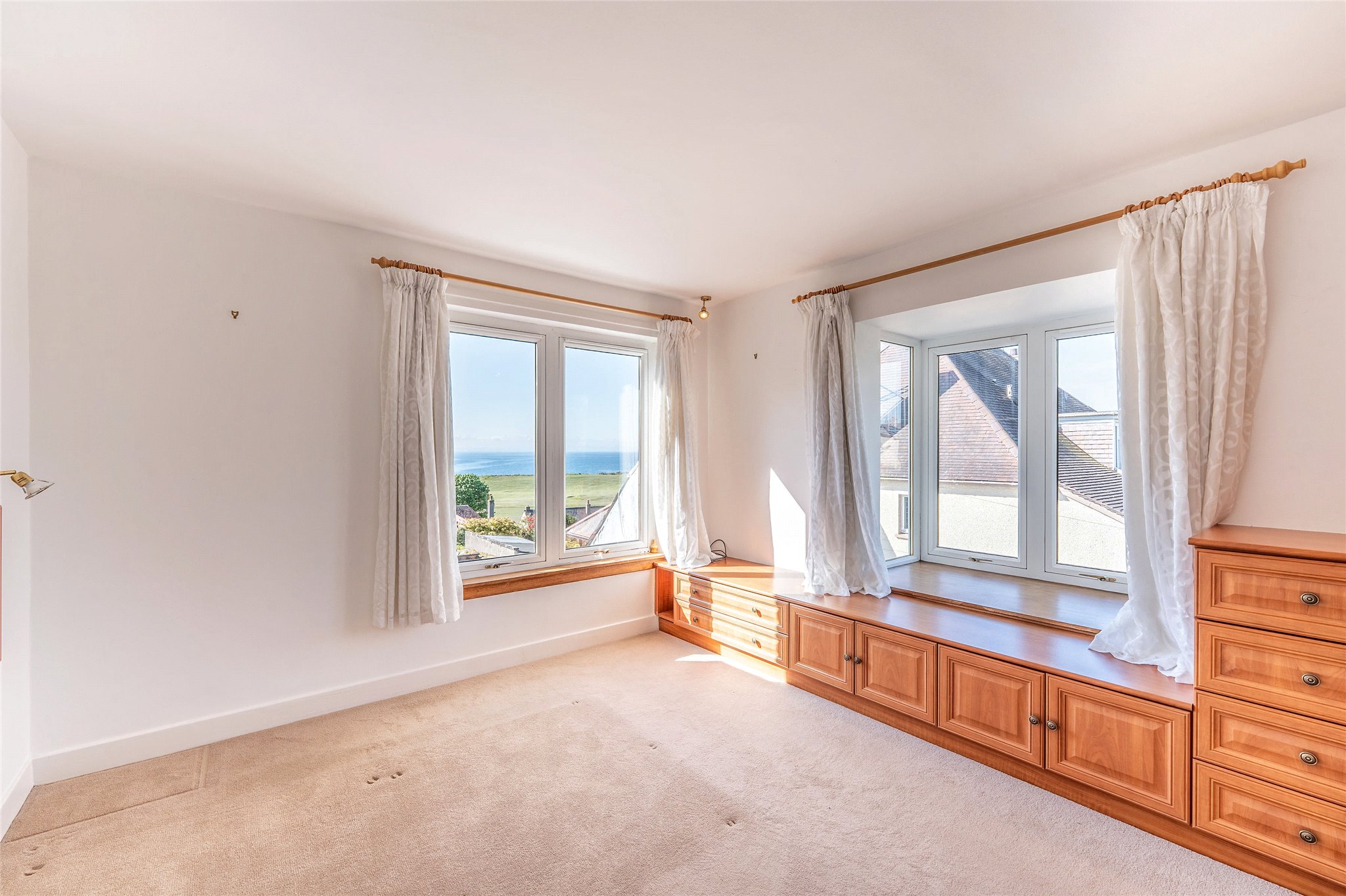 Boasting south-east-facing views of Lundin Links Golf Course and the Firth of Forth, this impressive four-bedroom detached home with mature gardens presents a rare opportunity for those looking to settle in the sought-after village of Lundin Links. From the bright and welcoming entrance hallway flooded with natural light and finished with elegant wooden flooring, you are guided into a spacious, carpeted sitting room. French doors open directly onto the rear garden, while the soft neutral décor and generous proportions create a warm and inviting atmosphere. This comfortable living space also offers direct access to a private lift, ensuring effortless access to the first floor. Opposite the sitting room, a sleek, design-led kitchen awaits. It features gloss grey handleless cabinetry illuminated by integrated LED lighting and complemented by crisp white worktops. High-spec integrated appliances, including a double oven and hob, combine style with practicality. A side door provides direct access to the exterior. Adjacent to the kitchen, a versatile dining room enjoys views across the south-east-facing garden and is enhanced by French doors that open out, making it a bright, airy setting ideal for entertaining or relaxed family meals. Continuing along the hallway, you’ll find a luxurious family bathroom complete with a chrome towel radiator, hidden cistern WC, washbasin built into vanity, a corner Jacuzzi bath, and a separate shower enclosure. Each of the three bright and generously sized double bedrooms on this level is tastefully decorated and features built-in wardrobes. Taking either the lift or the staircase to the first floor, you arrive at a incredibly spacious and light-filled dual-aspect living room. With stunning south-east-facing views across Lundin Links Golf Course to the Firth of Forth, it offers a peaceful retreat ideal for unwinding. From here, you access a flexible playroom or study with practical eaves storage. Completing the first floor is the principal double bedroom along with a shower room.