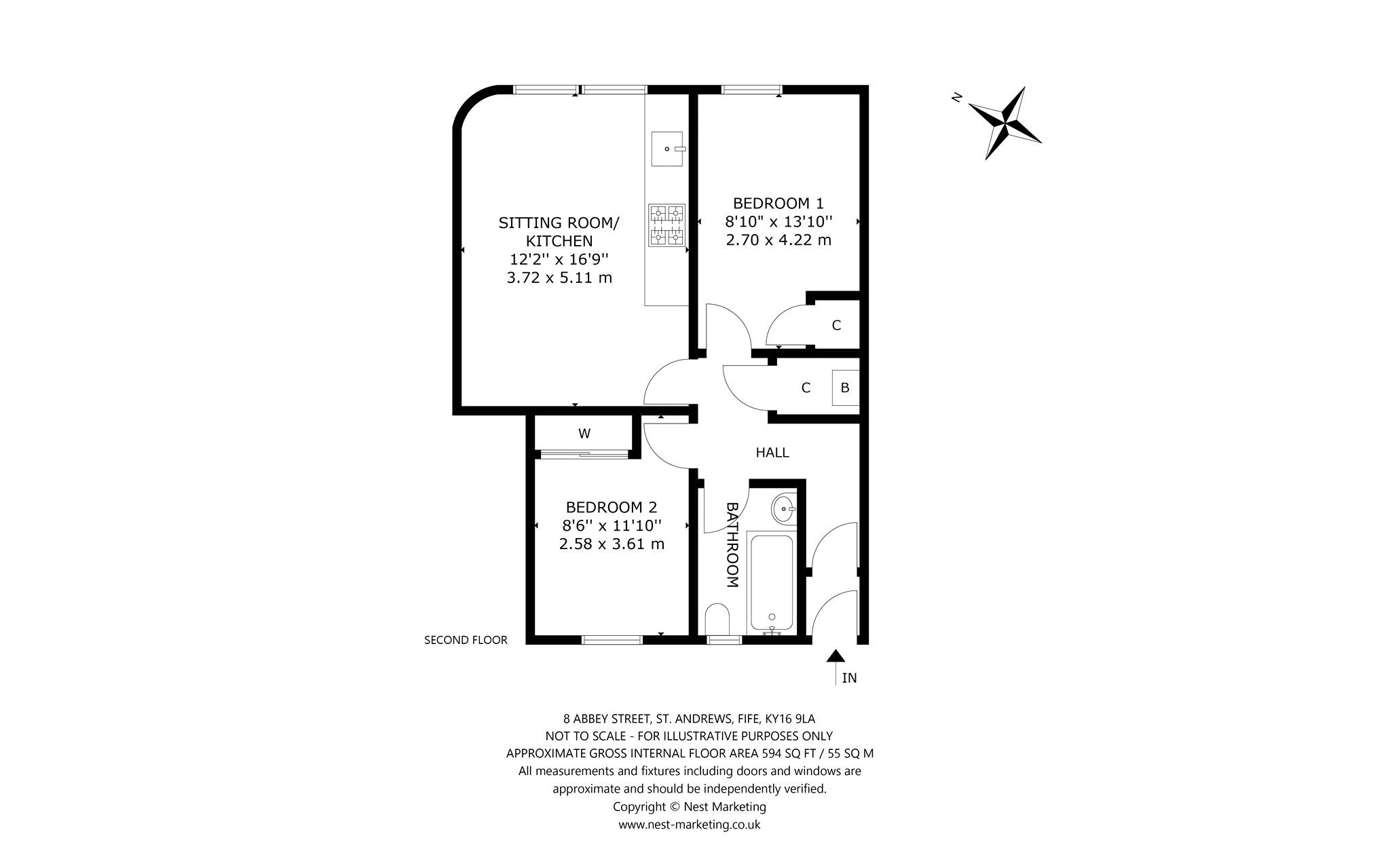 Entrance hallway, sitting room and kitchen, two bedrooms, shower room