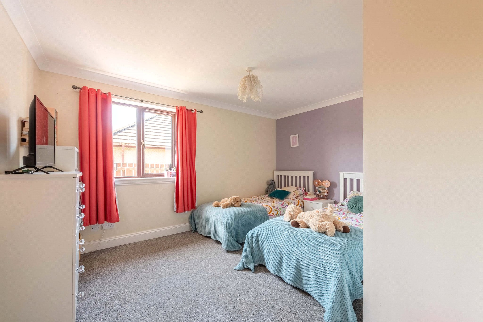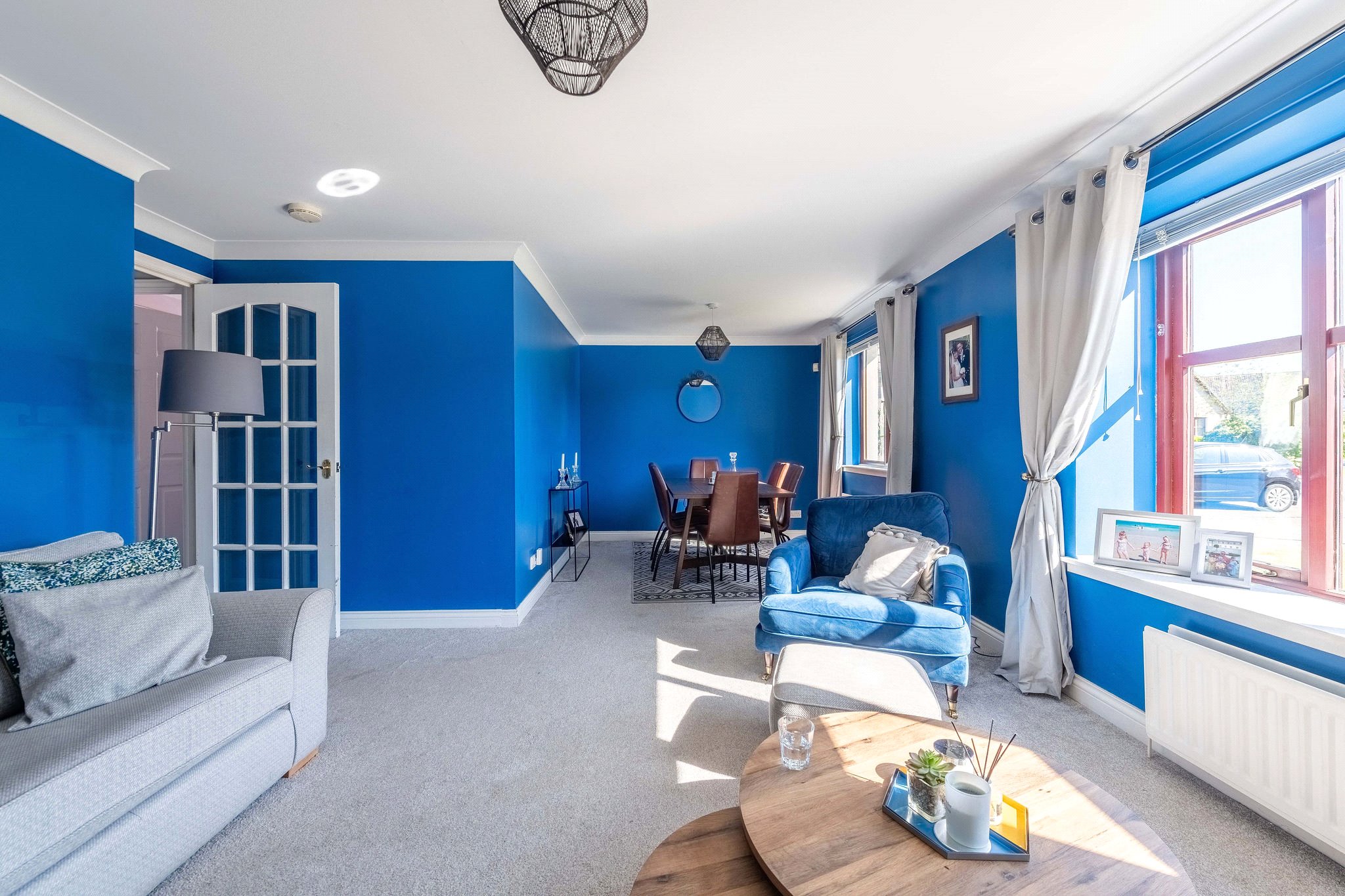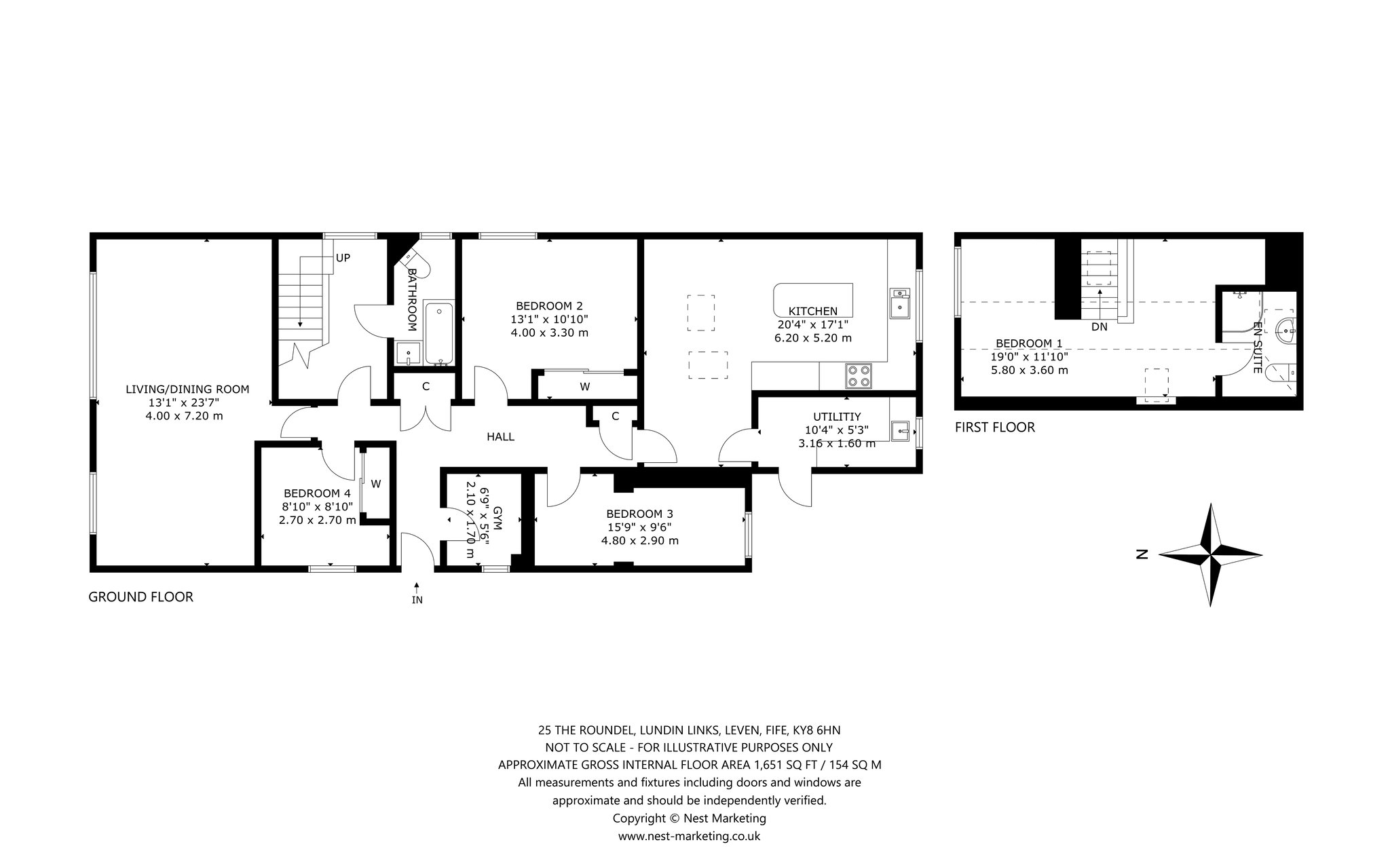 Occupying a superb position within a peaceful and popular Lundin Links residential setting, 25 The Roundel is a fantastic four-bedroom family home within easy reach of Lower Largo Beach, schooling, and amenities. From a neat west-facing garden bordering the driveway and garage, you enter an elegantly decorated hallway finished with wood-effect flooring and a built-in cupboard. To your right is a versatile gym, whilst on the left a spacious living and dining room awaits that spans the length of the home. Flooded with natural light from expansive glazing and boasting plush carpeting, this appealing living and reception area allows for a versatile furniture arrangement, making it very much at the heart of the home. At the opposite end of the property lies a skylit south-facing kitchen with an adjacent utility. Contemporary in design and centred around a kitchen island allowing for casual dining, it showcases rich blue wall and floor cabinetry, wood-effect worktops, and a tiled splashback. High-spec integrated appliances include an eye-level grill, oven, hob, and extractor hood. Enjoying a sizeable layout, there is also a charming seating area. Running off the ground floor hallway are three light and airy carpeted double bedrooms, all of which have built-in wardrobes and share access to a luxurious family bathroom equipped with a WC, washbasin built into a wall-hung vanity, and a bath with a rainfall shower. On the first floor lies a peaceful skylit principal double bedroom with built-in wardrobes and access to a private en-suite rainfall shower room. Finished in chic whites, greys, and matte black, it features a washbasin built into a vanity and WC.