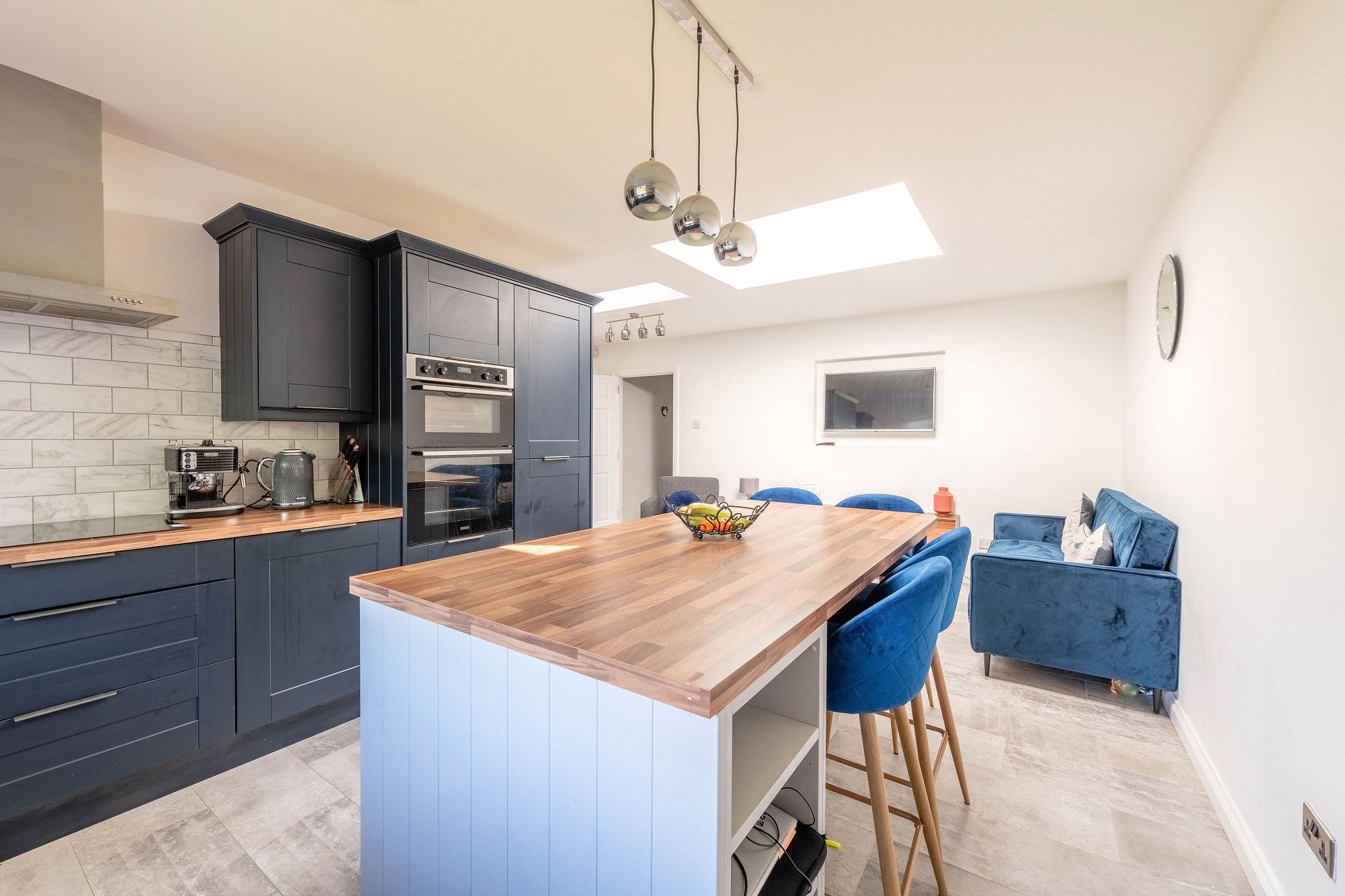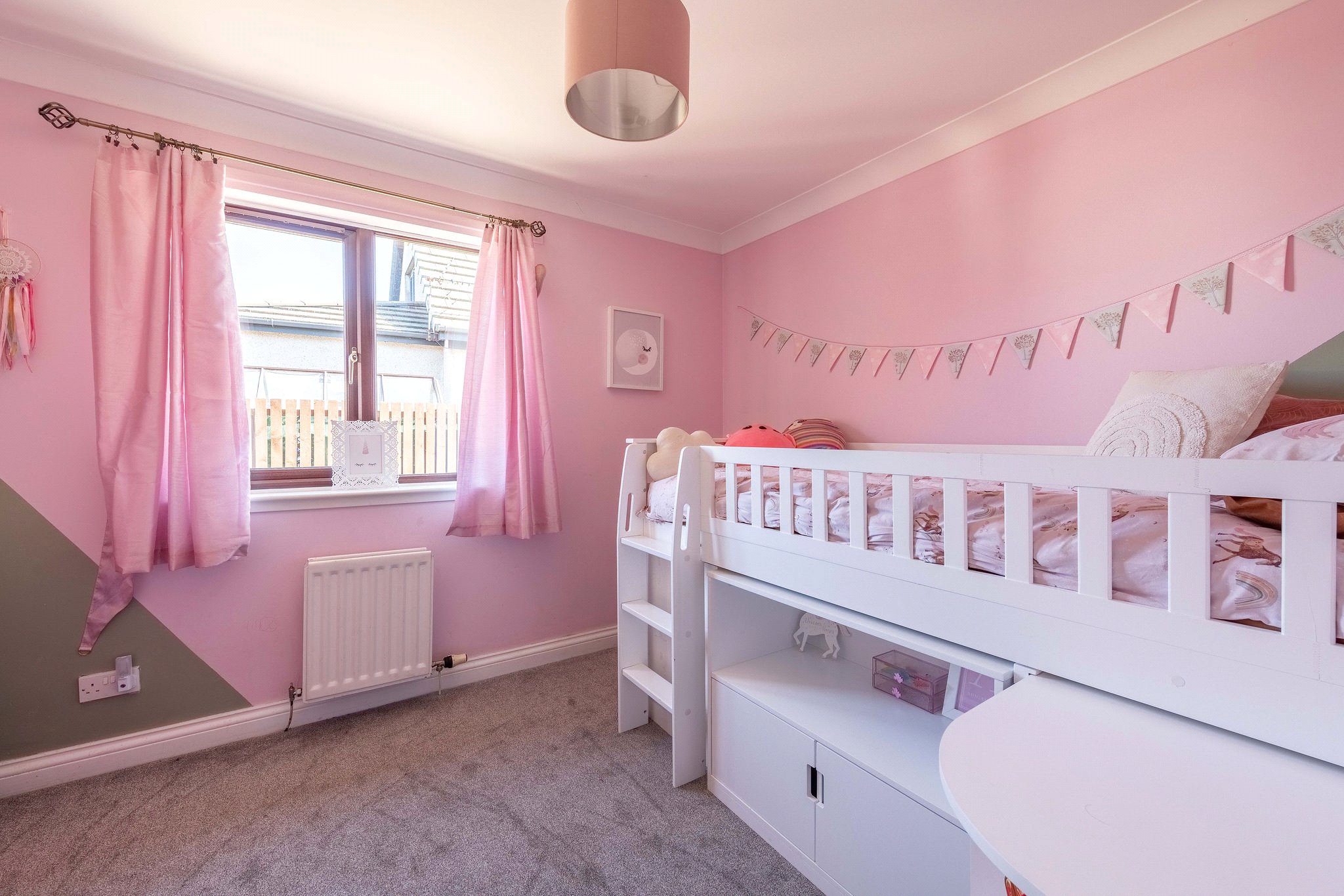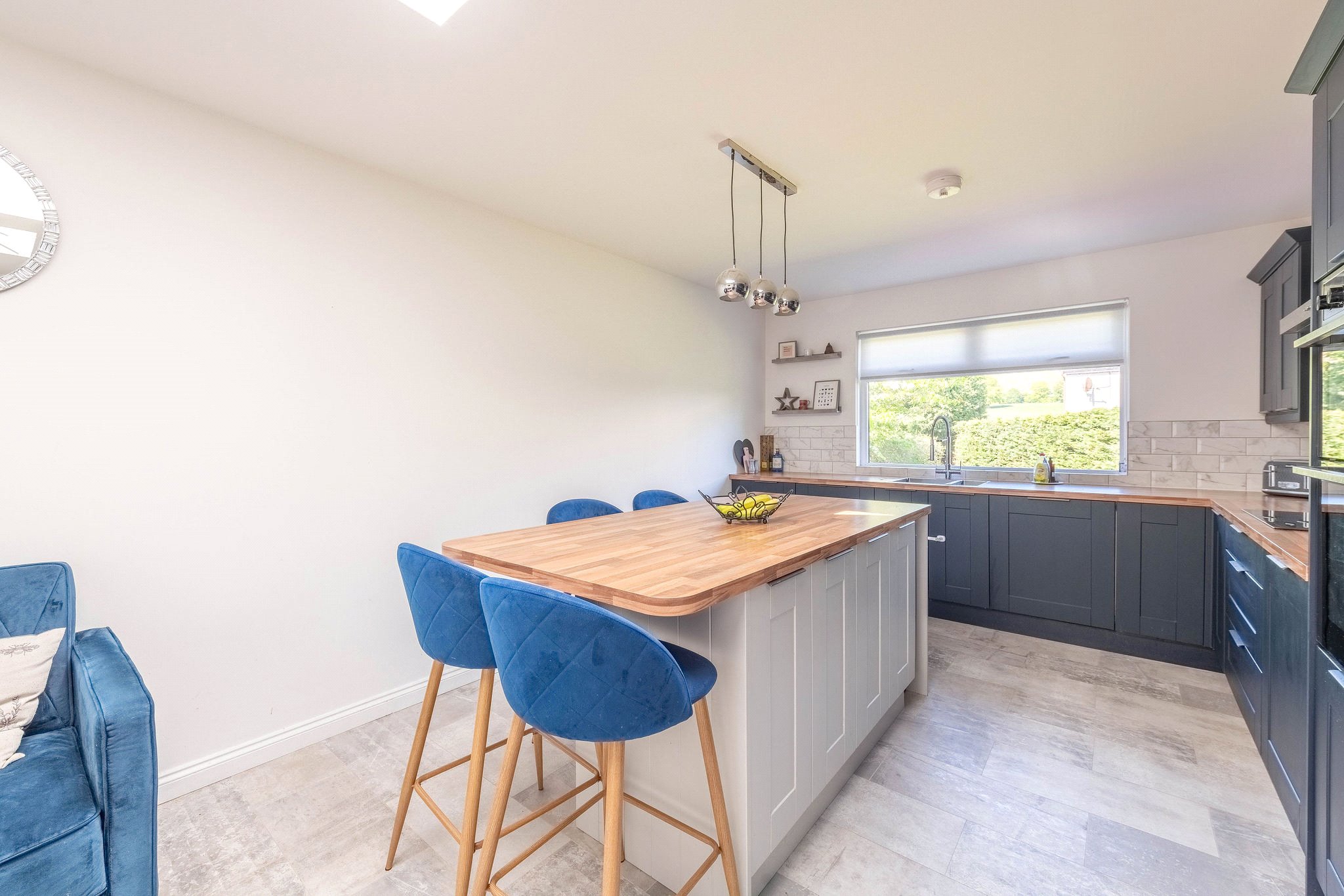 Occupying a superb position within a peaceful and popular Lundin Links residential setting, 25 The Roundel is a fantastic four-bedroom family home within easy reach of Lower Largo Beach, schooling, and amenities. From a neat west-facing garden bordering the driveway and garage, you enter an elegantly decorated hallway finished with wood-effect flooring and a built-in cupboard. To your right is a versatile gym, whilst on the left a spacious living and dining room awaits that spans the length of the home. Flooded with natural light from expansive glazing and boasting plush carpeting, this appealing living and reception area allows for a versatile furniture arrangement, making it very much at the heart of the home. At the opposite end of the property lies a skylit south-facing kitchen with an adjacent utility. Contemporary in design and centred around a kitchen island allowing for casual dining, it showcases rich blue wall and floor cabinetry, wood-effect worktops, and a tiled splashback. High-spec integrated appliances include an eye-level grill, oven, hob, and extractor hood. Enjoying a sizeable layout, there is also a charming seating area. Running off the ground floor hallway are three light and airy carpeted double bedrooms, all of which have built-in wardrobes and share access to a luxurious family bathroom equipped with a WC, washbasin built into a wall-hung vanity, and a bath with a rainfall shower. On the first floor lies a peaceful skylit principal double bedroom with built-in wardrobes and access to a private en-suite rainfall shower room. Finished in chic whites, greys, and matte black, it features a washbasin built into a vanity and WC.