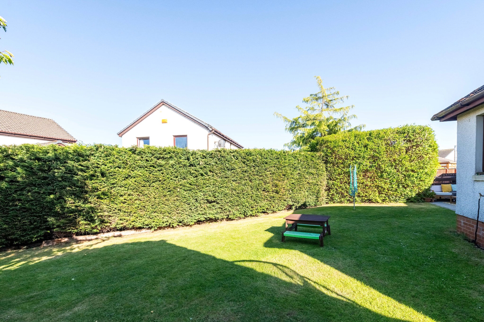 The east-facing rear garden, peacefully enclosed by mature hedging, is a delight for friends and family alike thanks to its large lawn and alfresco seating area. West-facing the lawned front garden with established planting makes a delightful first impression.