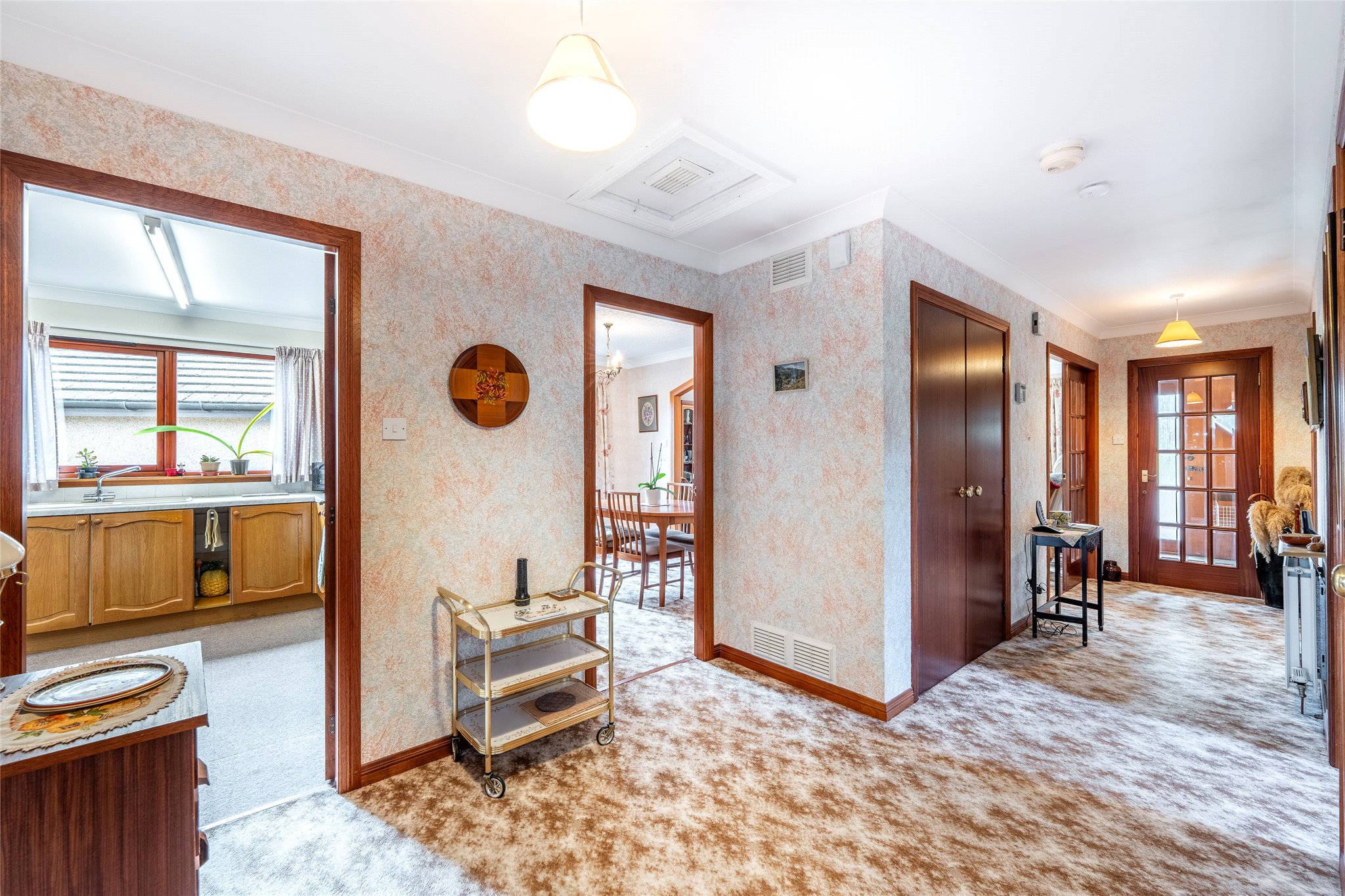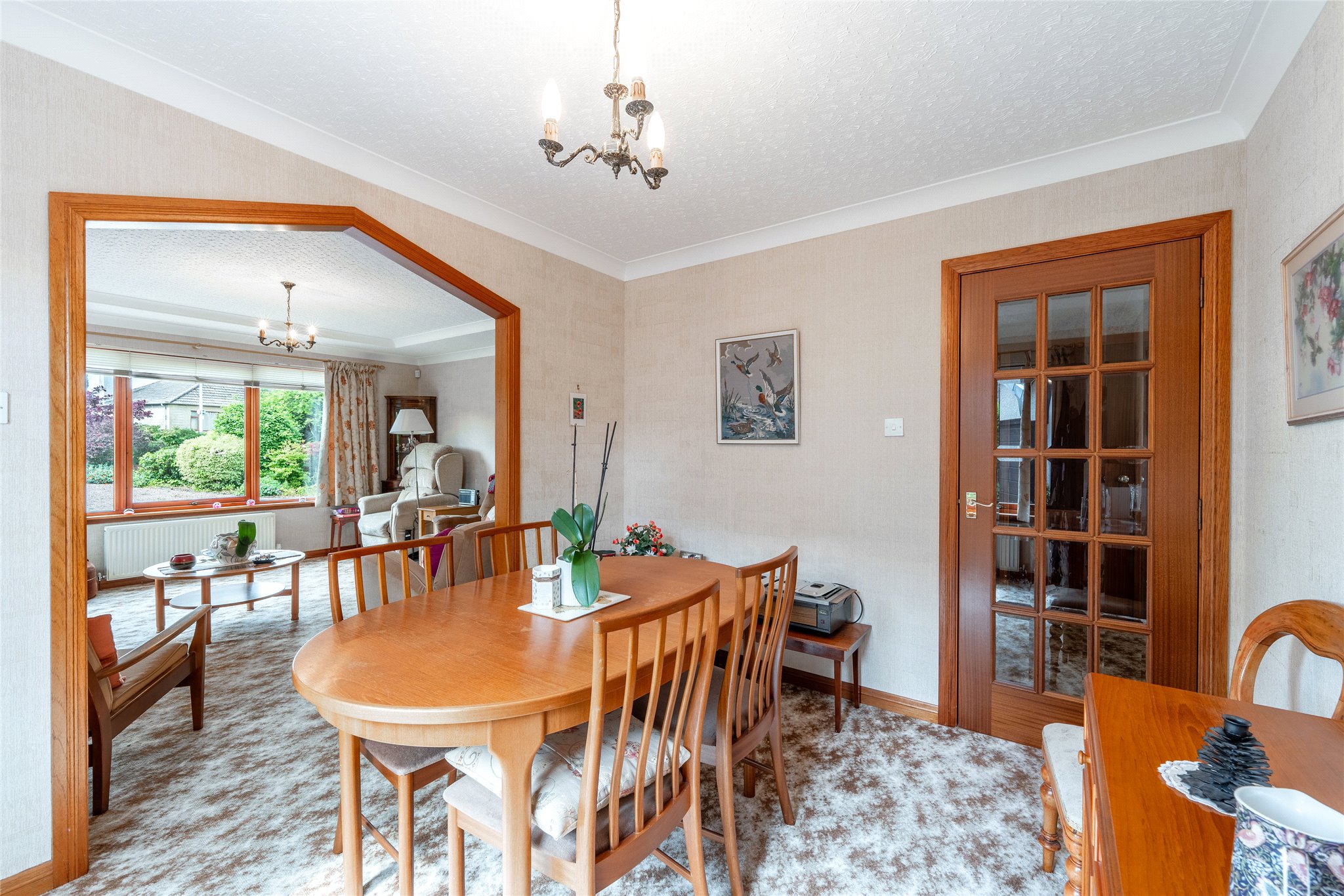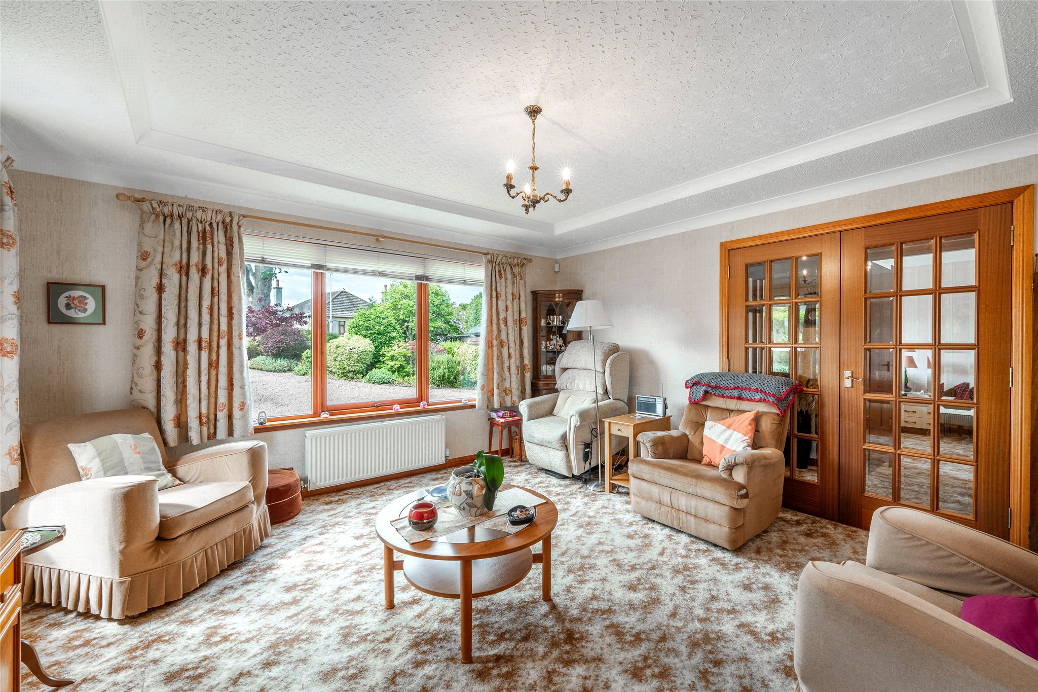 Set within generous front and rear gardens and benefiting from off-street parking, this bright and spacious three-bedroom bungalow offers the ideal opportunity for those looking to downsize in comfort or for growing families seeking a peaceful yet well-connected location in Cupar. A gravel driveway winds through an appealing garden, leading to the front door and into a welcoming entrance vestibule and carpeted hallway equipped with storage. To the right and entered through elegant French doors, a generously sized living room enjoys an attractive dual-aspect outlook across the front gardens, allowing for plentiful natural light. Tastefully decorated with plush carpeting, it radiates warmth and comfort, perfect for relaxing or entertaining. Flowing seamlessly from the living room is the adjoining dining room, continuing the same décor and offering flexibility as a formal dining space or cosy family room. Further along the hallway, the kitchen enjoys a rear garden outlook and accommodates casual dining for two. Fitted with classic shaker-style wall and floor units, a white tiled splashback, and complementary worktops, it offers ample space for freestanding appliances. An adjacent utility room with garden access provides additional storage. The principal double bedroom, quietly positioned to the rear of the home, is a peaceful retreat complete with built-in wardrobes and an en-suite WC. Two further light-filled double bedrooms, one also with built-in storage, offer flexible accommodation for family, guests, or home working. Completing the layout is a traditionally styled family bathroom featuring a bath, WC, shower enclosure, washbasin, and handrails.