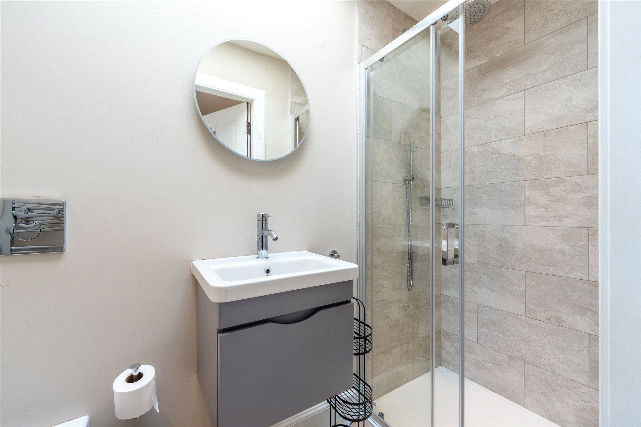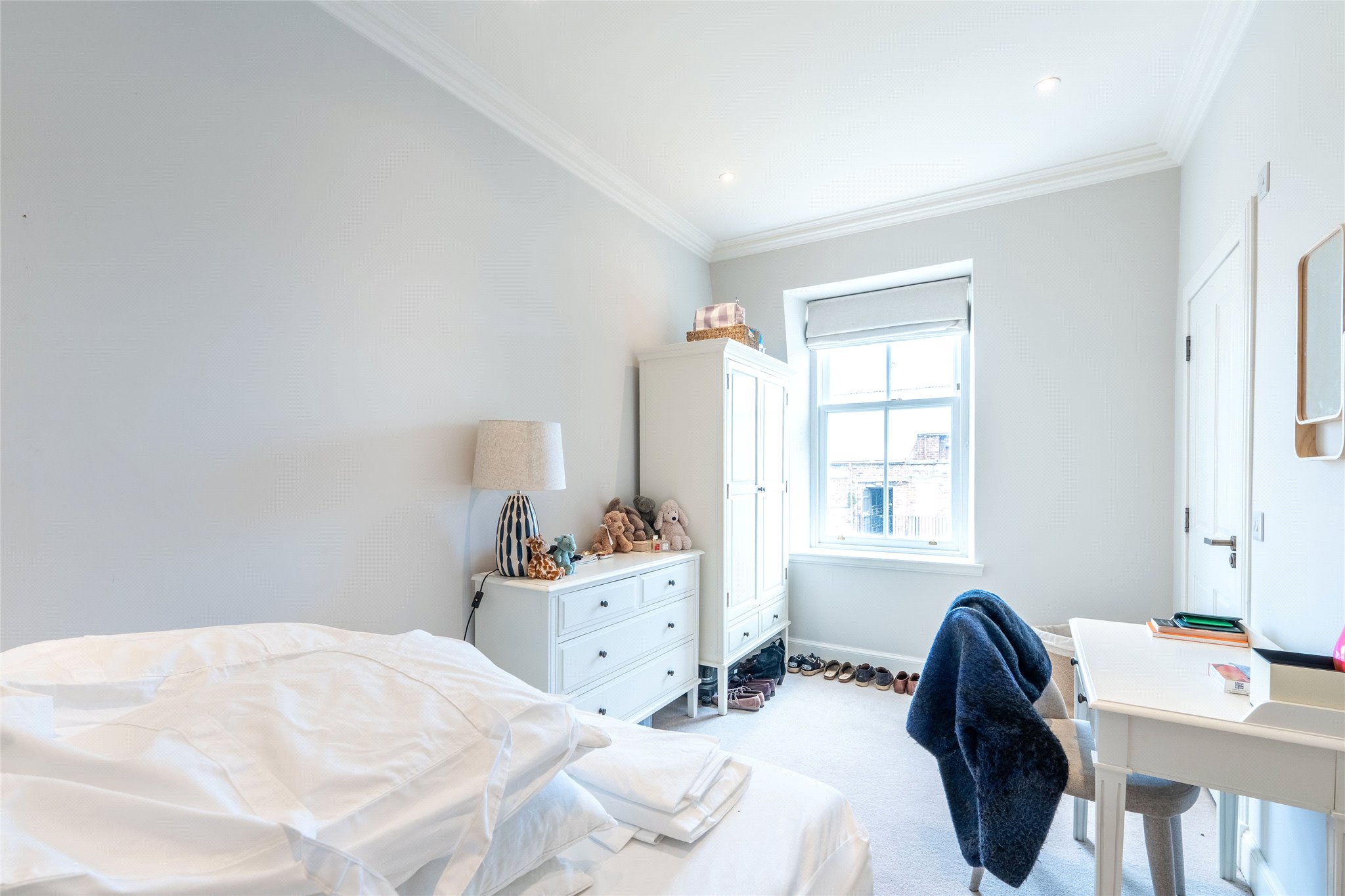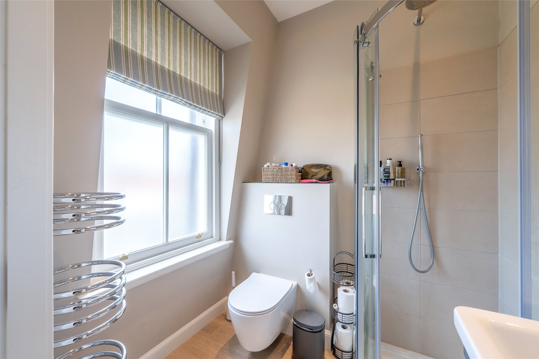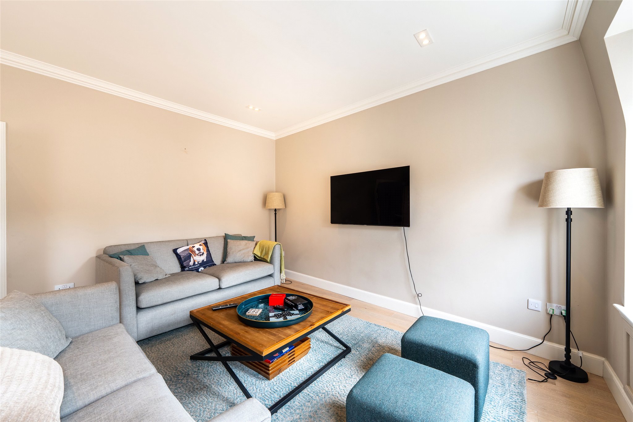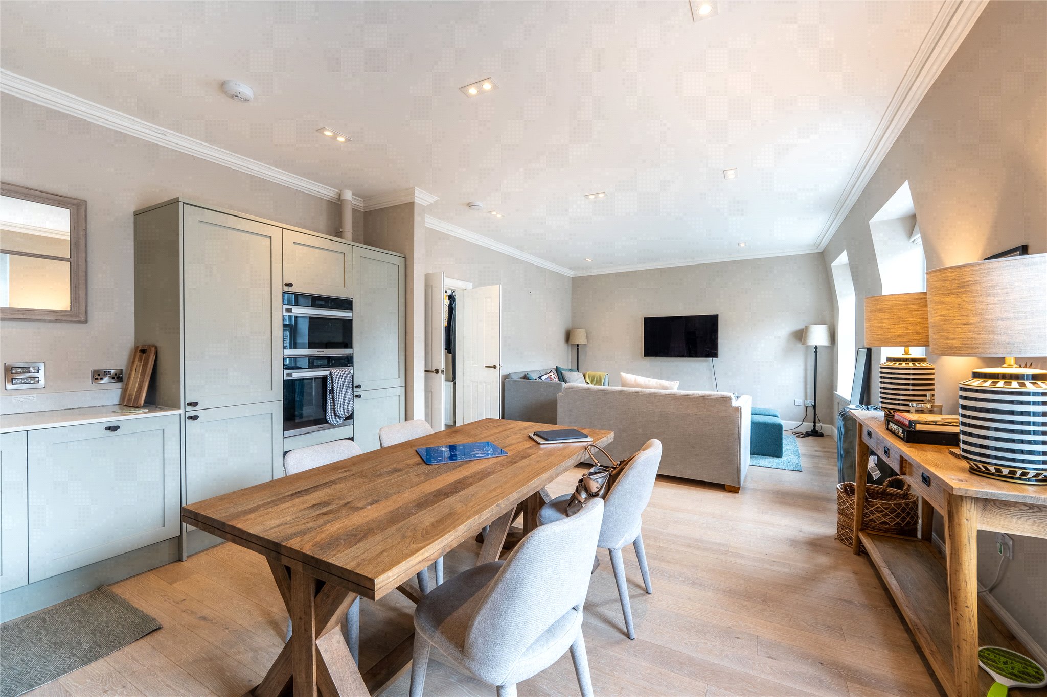 Nestled within the prestigious St Andrews Conservation Area, this second-floor two-bedroom apartment has been beautifully renovated, showcasing a refined interior design throughout, superior finishes and a meticulous attention to detail. A welcoming entrance foyer, elegantly appointed with handsome wooden flooring and a soft, sophisticated colour palette, leads through French doors into a stunning open-plan living room and kitchen. Bathed in natural light from south-east-facing triple windows and continuing the foyer’s tasteful aesthetic, this space is perfect for stylish entertaining and relaxed everyday living. Stretching the full length of the home, the living area offers flexibility in layout, easily accommodating a generous seating arrangement. The kitchen, thoughtfully designed in an L-shape, incorporates a dining area and showcases bespoke wall and floor cabinetry, sleek illuminated white stone worktops, and high-spec integrated appliances, including an eye-level oven, grill, and hob. Both bright double bedrooms are finished to a high standard, each complemented by a luxurious en-suite shower room. These feature contemporary fittings including hidden cistern WCs, wall-hung vanities with built-in washbasins, and chrome heated towel radiators. A guest WC completes the accommodation.