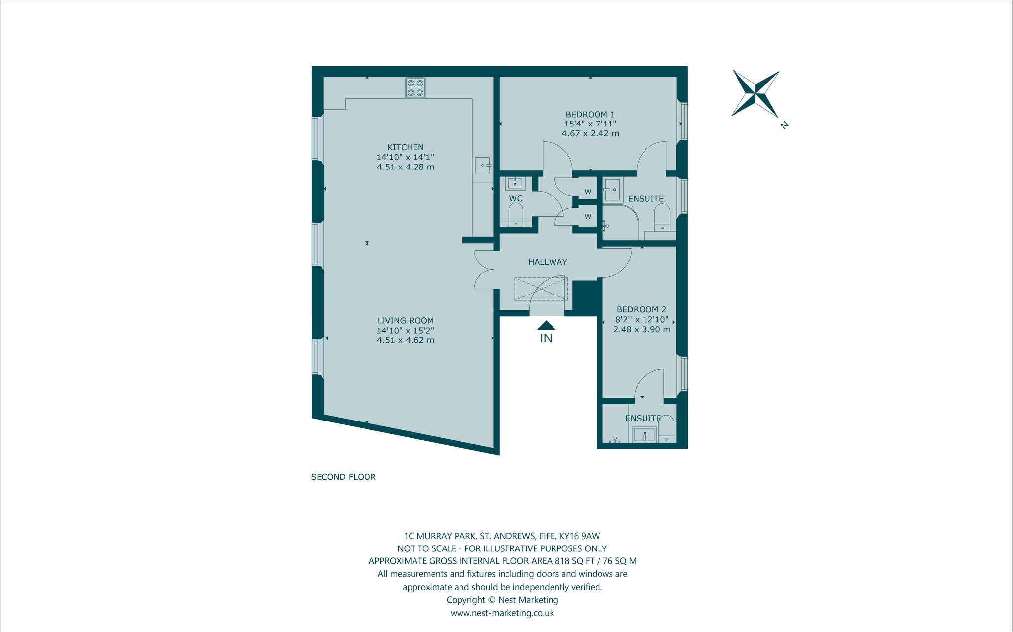 Entrance foyer, living room, kitchen, two bedrooms, each with en-suite, WC