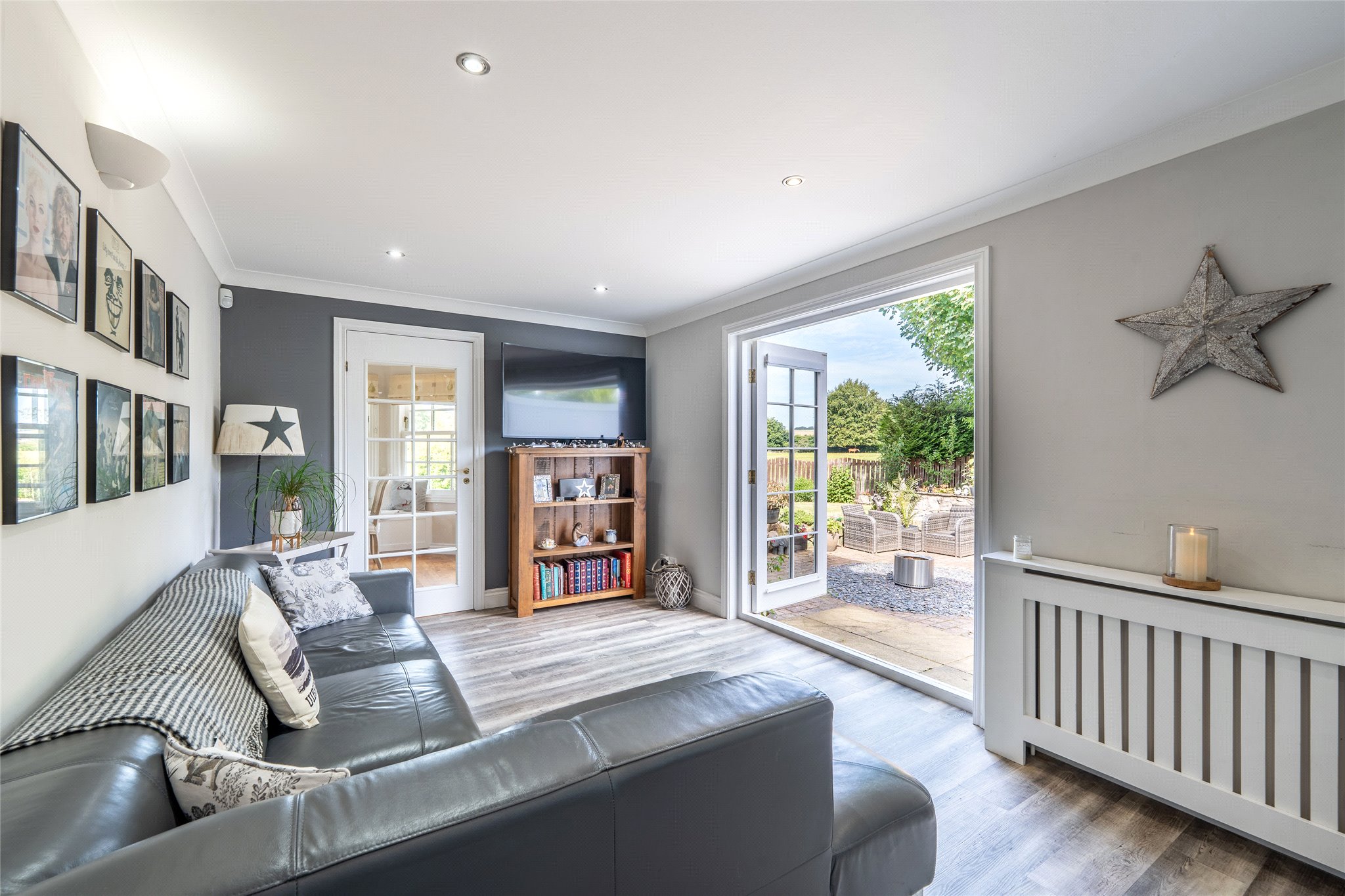 Backing onto open fields, the enclosed rear garden is breathtaking and is largely laid to lawn bordered by a variety of established trees and borders. An expansive paved alfresco area is a wonderful setting for dining, entertaining or simply relaxing and enjoying family life.