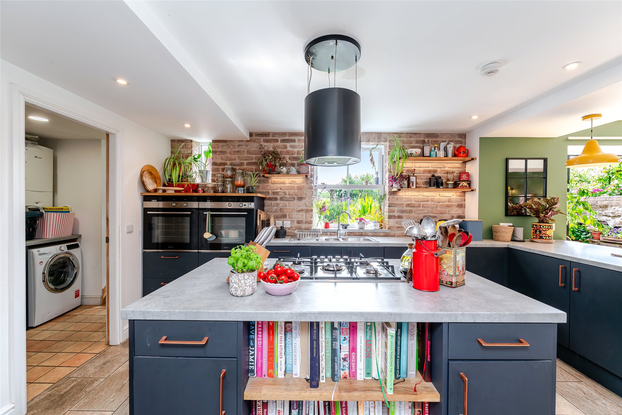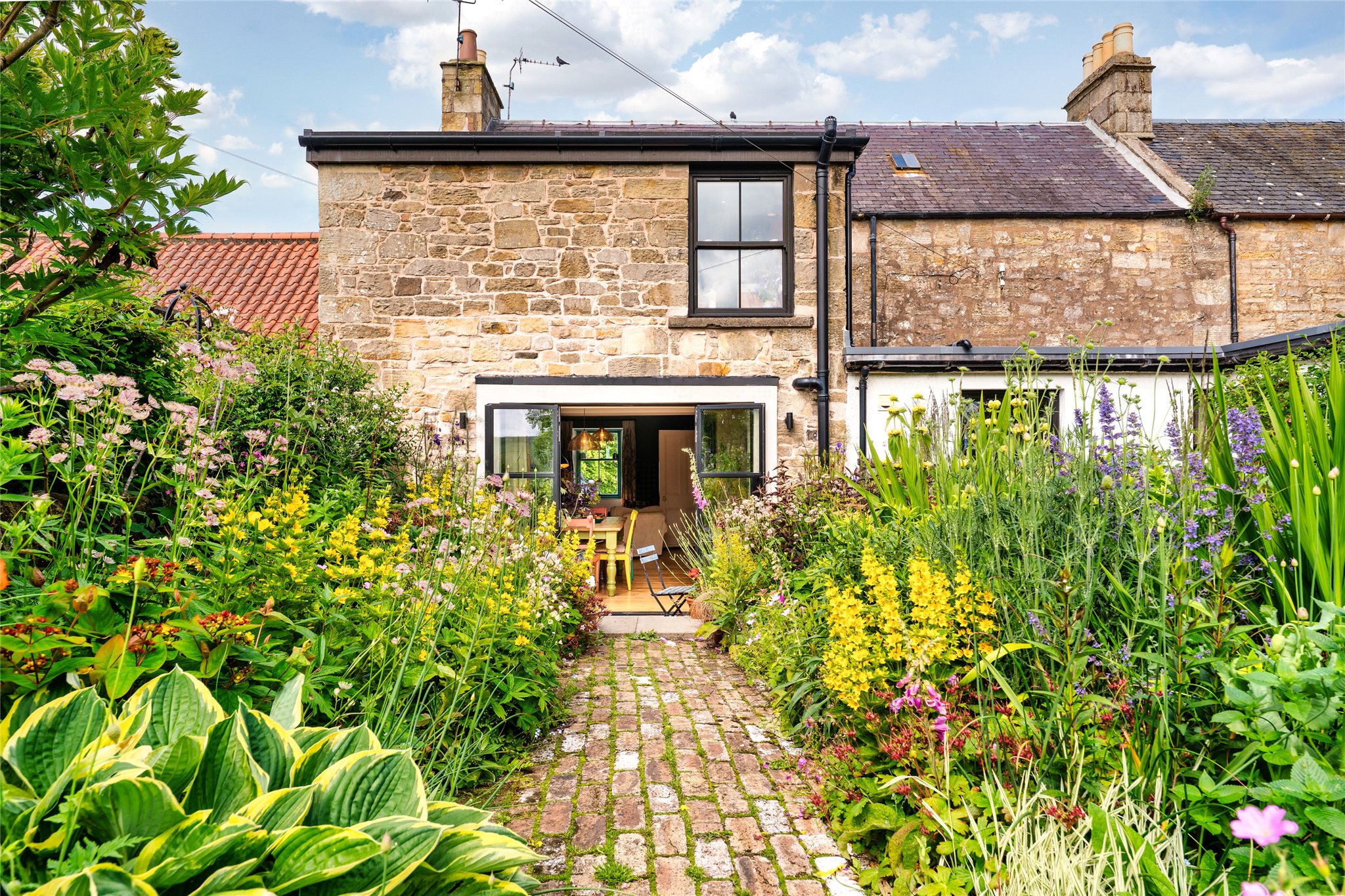 Enjoying a picturesque setting surrounded by open countryside and nestled within breathtaking gardens, Castle House in the tranquil village of Ceres presents a superb opportunity for peaceful rural living. With its charming mid-terrace stone-built façade, the front door opens into a welcoming entrance vestibule and hallway. To the right, a generously proportioned dual-aspect living and dining room awaits, bright, inviting, and seamlessly connected to the kitchen and the east-facing rear garden via chic French doors. This space exudes a rustic yet refined ambience, with handsome wooden flooring, a cast iron fireplace set within an oak mantle, built-in shelving, and a warm colour palette. The bespoke kitchen with exposed brickwork is thoughtfully designed, separated from the dining area by a peninsula counter that doubles as a breakfast bar perfect for casual dining or morning coffee. Aesthetically appealing, the kitchen features dark blue base cabinetry with gold-effect hardware and sleek white marble-effect worktops. High-spec integrated appliances include a five-ring gas hob set into a central island with a ceiling-mounted extractor hood and an eye-level double oven. A separate utility room and a well-appointed guest WC lie just beyond. To the front of the property, a versatile and sizeable playroom provides excellent flexibility ideal as a comfortable double bedroom or additional living area. Upstairs, accessed via the original staircase, the large principal double bedroom enjoys abundant natural light and features wooden flooring and an open fireplace. Two further bedrooms offer versatility for family life or working from home, one currently arranged as a study. A true highlight is the luxurious family bathroom. Framed by panoramic countryside views, it provides a serene sanctuary complete with a freestanding bath, a black grid walk-in shower enclosure, a countertop washbasin, WC, and towel radiator.