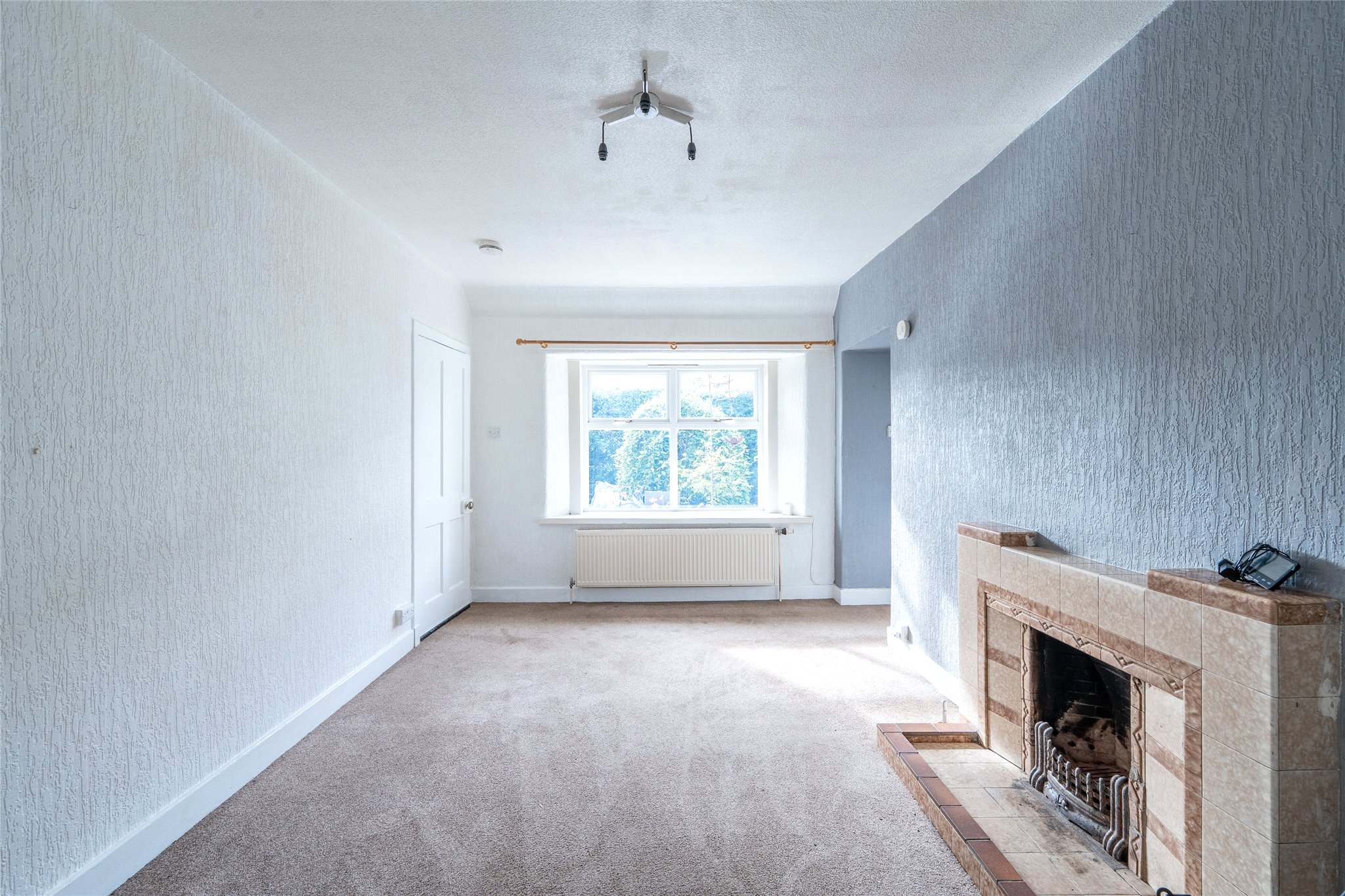 Peacefully situated in the small village of Ladybank, this two-bedroom semi-detached home offers bright, spacious, and well-presented interiors complemented by private gardens, making it an appealing choice for a wide range of buyers. Set behind mature hedging, a charming front garden frames the entrance. Stepping inside, an inviting hallway is finished with a neutral décor and soft carpeting. To the left, a generously sized living room extends the full length of the property, its large picture window flooding the space with natural light and offering views of the front garden. Tastefully decorated and carpeted, the room is centred around an open fireplace set within a tiled surround, creating a warm and welcoming ambience. Flowing seamlessly from here, the kitchen is fitted with sleek handleless wall and floor units in a natural tone, complemented by smooth black worktops and ample space for freestanding appliances. A built-in cupboard adds practical storage, while a door provides direct access to the side of the home. The kitchen also connects to a modern bathroom featuring a bath with a wall-mounted shower, WC, and washbasin. Returning to the hallway, the principal double bedroom offers a spacious and restful retreat, enhanced by an appealing décor and tranquil views over the front garden. A second double bedroom overlooking the rear garden, completes the accommodation.