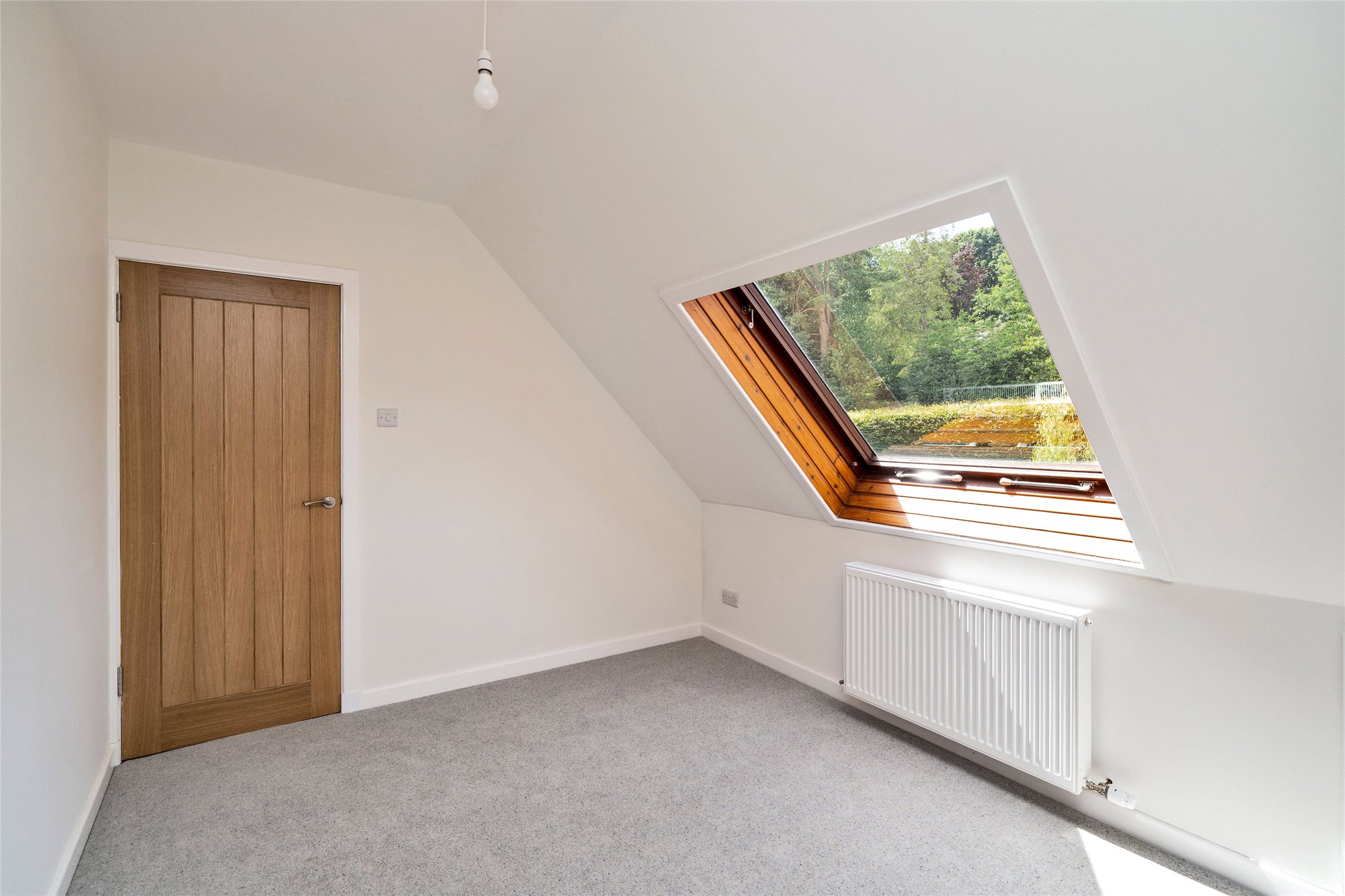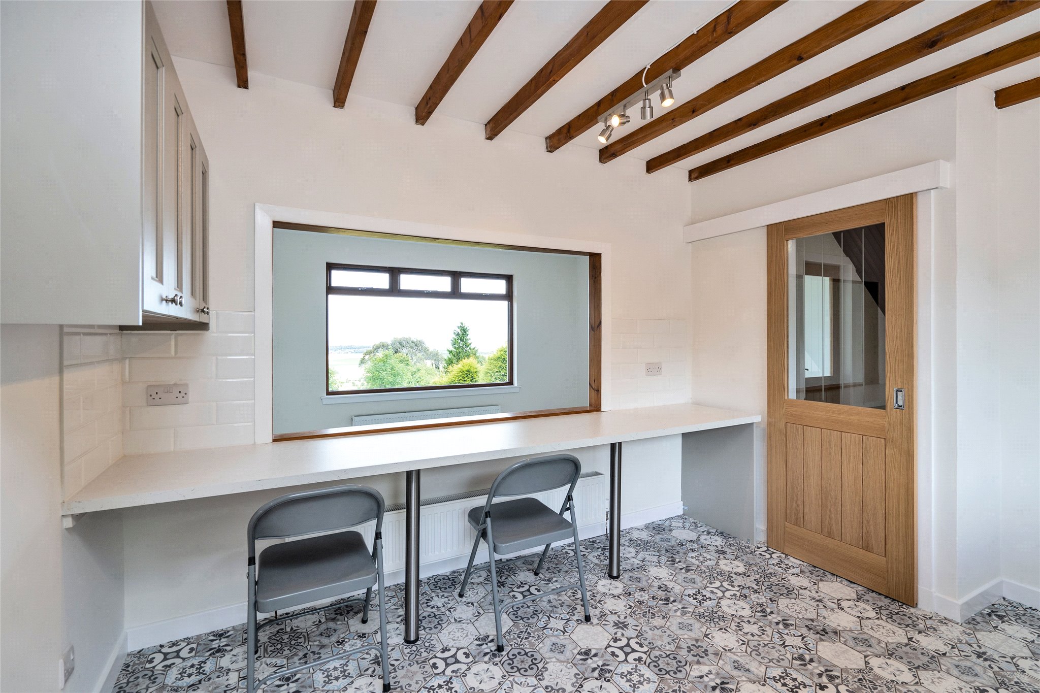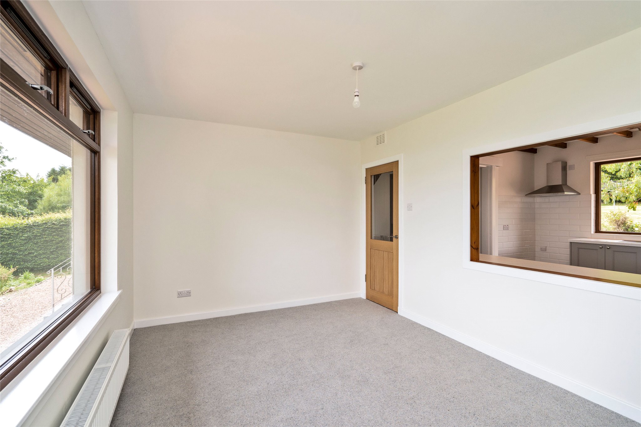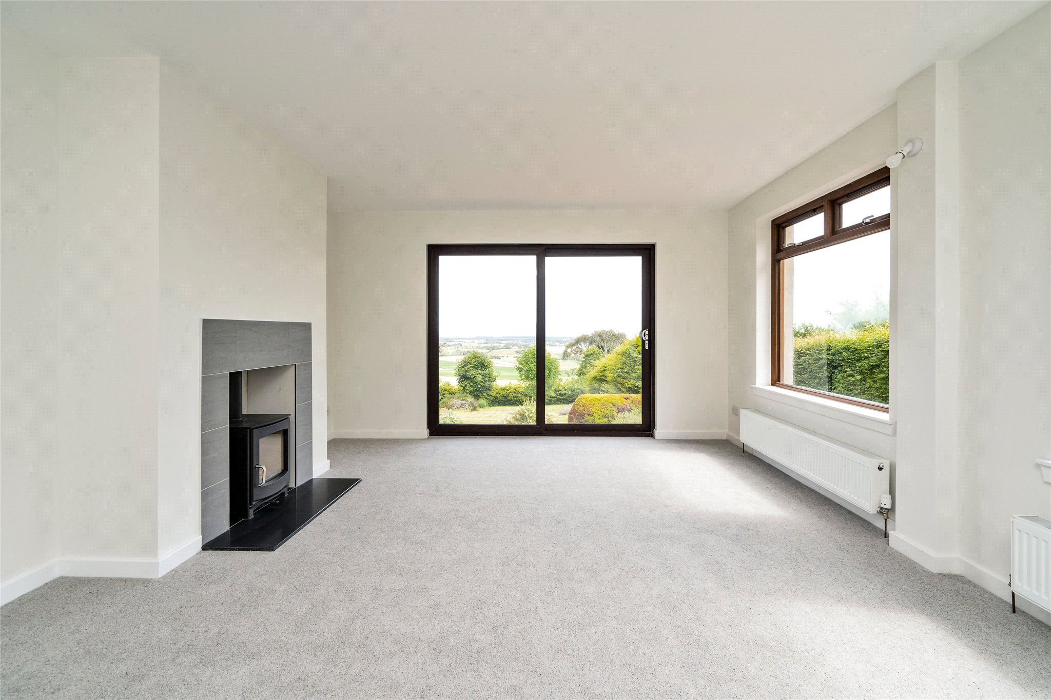 Peacefully nestled along a quiet country lane in the charming hamlet of Lucklawhill, The Pines presents a rare and desirable opportunity for those seeking a rural lifestyle without compromising on space or comfort. Approached via a gated driveway bordered by mature hedging and wrapping around a well-tended front garden, this welcoming home opens into a bright and airy entrance vestibule, leading into a carpeted hallway. To the right and entered through elegant French doors, a beautifully light-filled living room awaits, enjoying a south and east-facing aspect with captivating views across the garden and surrounding landscape. With direct access to the rear garden, the space effortlessly merges indoor and outdoor living, creating a delightful ambience. Plush carpeting, neutral décor, and a charming log-burning stove further enhance its appeal. Across the hall, the bright and good-sized kitchen overlooks the front garden and features grey wall and floor cabinetry, white worktops, and a convenient breakfast bar. Thoughtfully laid out with ample space for freestanding appliances, it looks into the dining room, where large windows frame picturesque views of the garden and rolling countryside. Offering a versatility of uses, the carpeted dining room leads into the integral double garage. Completing the ground floor is a comfortable double bedroom positioned to the rear and a guest WC. On the first floor, the generously proportioned principal double bedroom with built-in wardrobes enjoys plentiful natural light and south-westerly views. In addition, there is a study and two further bedrooms, each with built-in wardrobes and large VELUX windows. Rounding off the first floor is a stylish modern bathroom equipped with a bath, WC, and washbasin set against chic white metro tiles.
