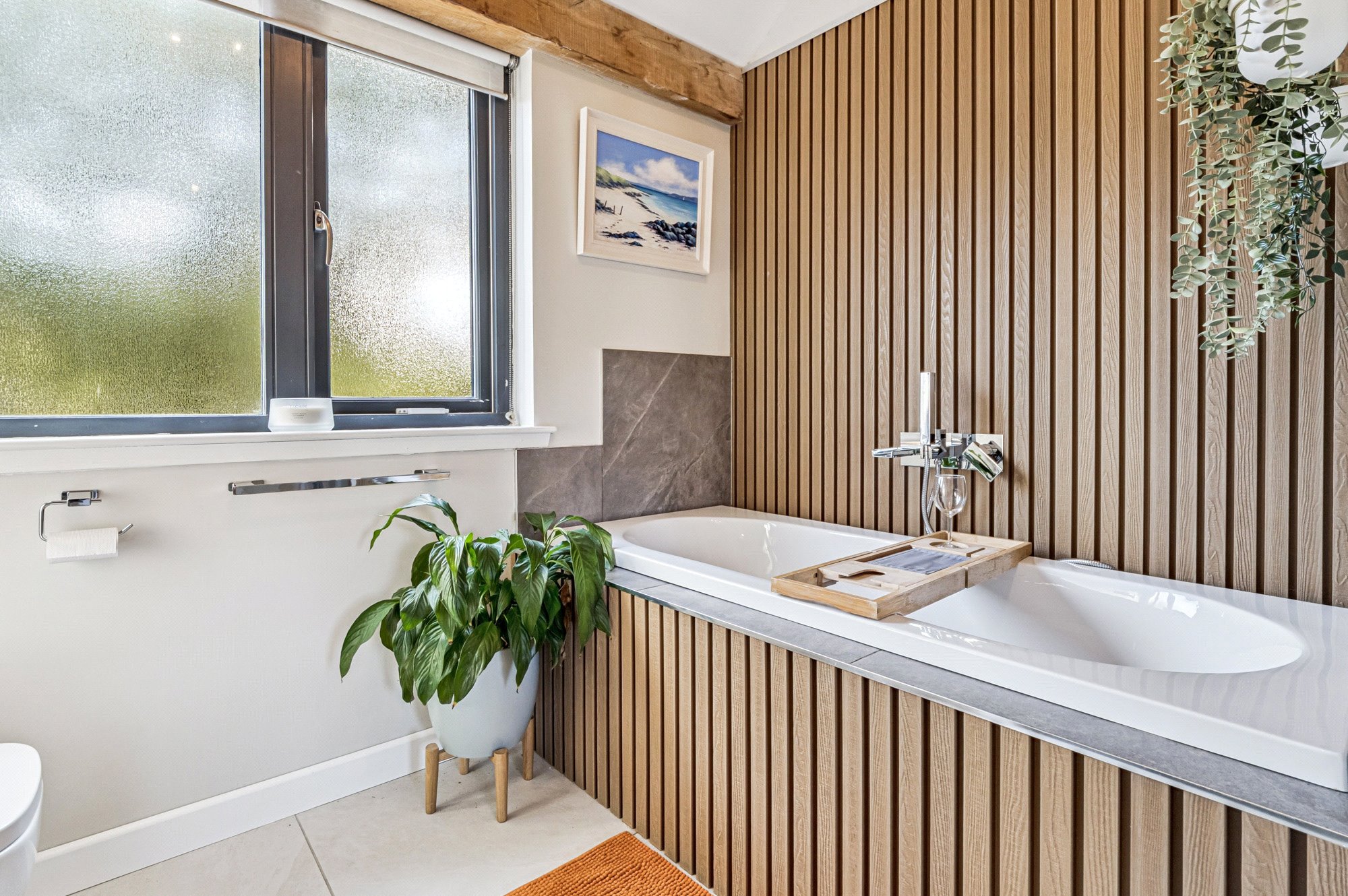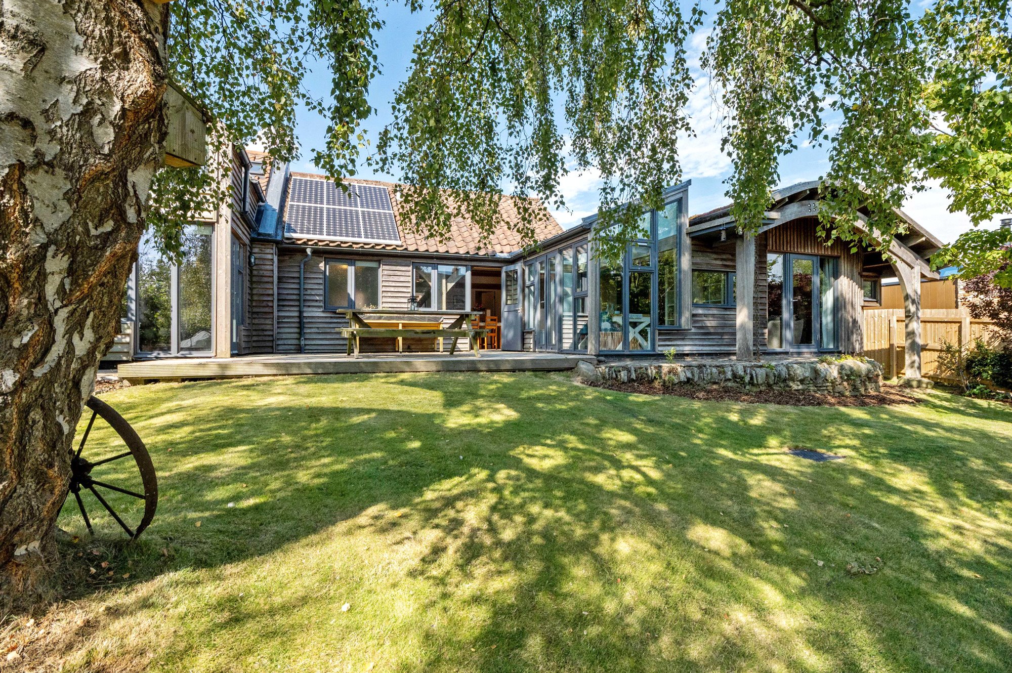 Externally, the property is equally appealing. A versatile studio/garage provides scope for creative pursuits, home working or a gym, while the gardens offer sheltered areas for dining, play and relaxation. Mature planting and thoughtful landscaping create an attractive backdrop to the house, reinforcing the sense of connection to nature that is central to its design.