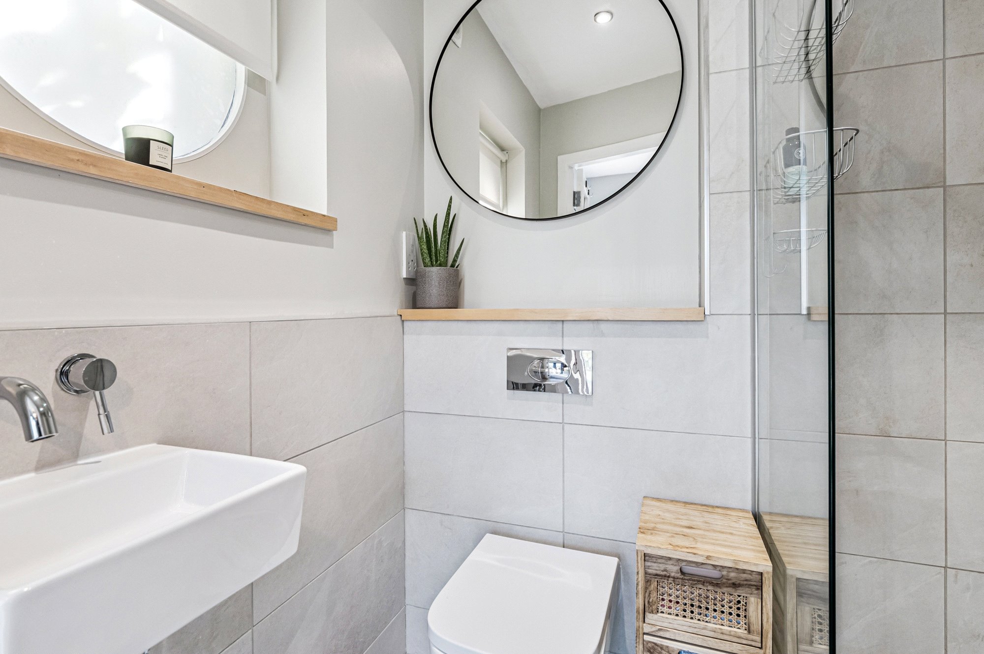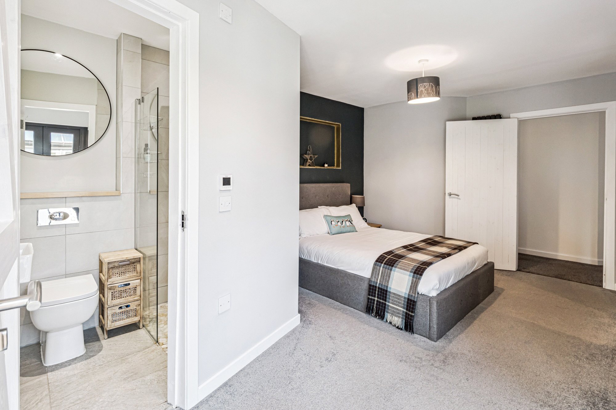 On the ground floor, three generously well-proportioned bedrooms provide flexibility family living, guests, or home working. The principal bedroom enjoys the luxury of a stylish en-suite shower room, built-in storage, and direct access to the garden—creating a perfect private retreat. A large family bathroom, finished to an exceptional standard, features both a bath and a separate shower cubicle, combining elegance with practicality. A striking spiral staircase leads to a fourth bedroom on the upper level. Complete with its own en-suite shower room, this peaceful hideaway offers privacy and comfort—ideal as a guest suite, teenager’s room, or tranquil home workspace.